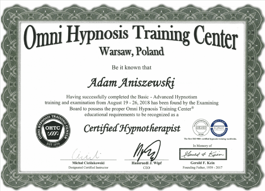 Jestem certyfikowanym hipnoterapeutą i absolwentem największej i uważanej za najlepszą na świecie szkołę hipnozy OMNI Hypnosis Training Center. Jestem również absolwentem wielu szkoleń z zakresu hipnozy i rozwoju osobistego u takich osób jak: Mateusz Grzesiak, Michał Cieślakowski, Eric Worre czy Brian Tracy. Jako certyfikowany hipnoterapeuta w 2018 roku stałem się również członkiem największej światowej organizacji zrzeszającej hipnoterapeutów i hipnotyzerów NGH The National Guilt of Hipnotists a niedługo później członkiem prestiżowego polskiego zrzeszenia Centrum Hipnozy. Ponieważ na co dzień prowadzę gabinet i poszerzająca swoje kompetencję uczęszczam regularnie na warsztaty i szkolenia związane z hipnoterapią.