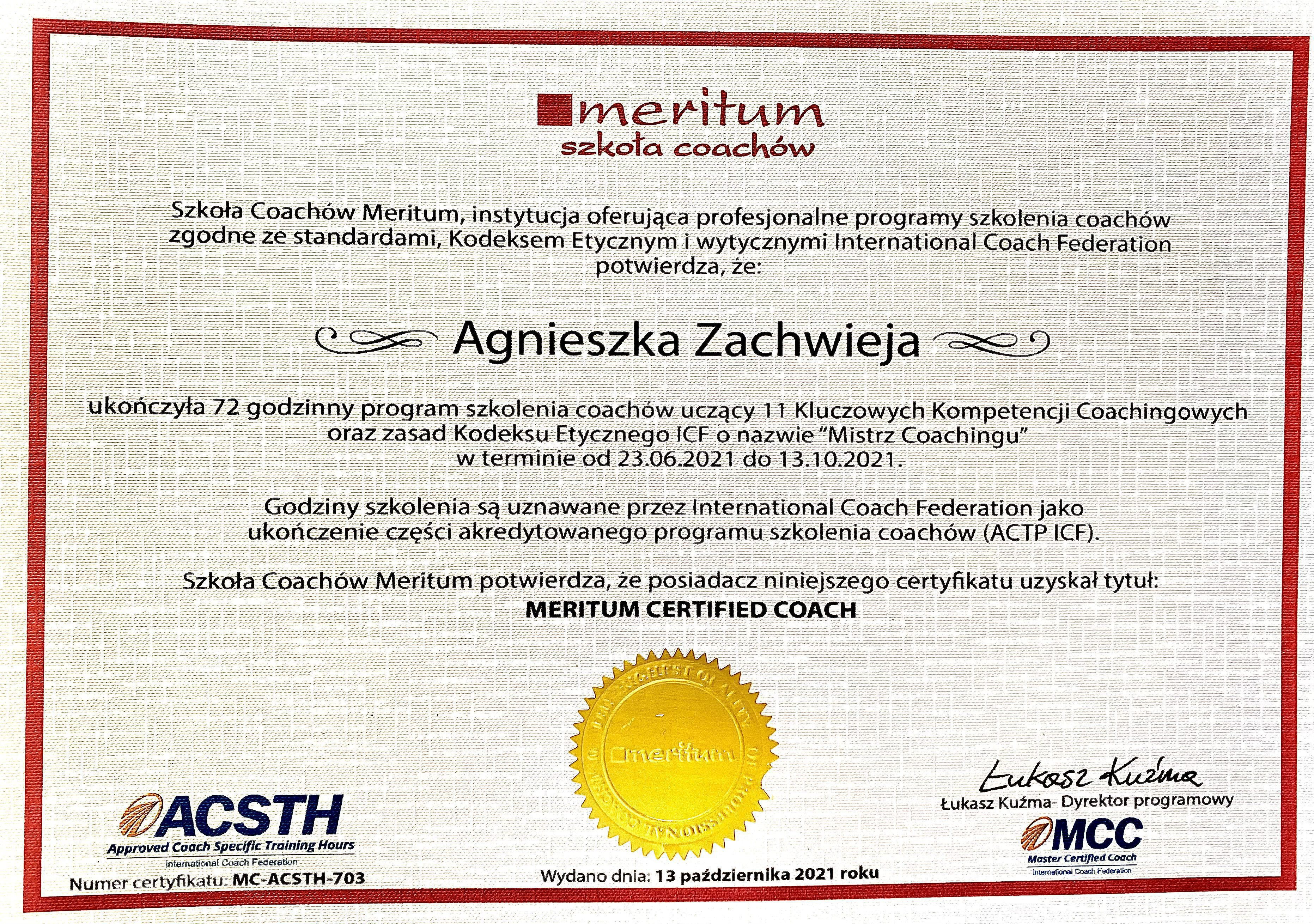 Jestem certyfikowaną hipnoterapeutką (Praktyk i Master Hipnozy i Hipnoterapii) , członkinią Polskiego Instytutu Hipnozy i Terapii Transpersonalnych, oraz coachem transformacyjnym akredytowanym przez International Coach Federation – ICF ACC. Ukończyłam również Szkołę Główną Handlową w Warszawoe oraz Northeastern Illinois University – Change Management. Od dwudziestu lat stale rozwijam się na ścieżkach jogi, medytacji, mindfulness, tantry, szamanizmu. Szkolę się minimum 30 dni rocznie w obszarze psychologii, coachingu, hipnoterapii . Uczestniczę w procesach monitoringowych, by wzrastać i być jak najlepszym wsparciem oraz partnerem w rozwoju dla osób, z którymi mam przywilej pracować. Moją pracę hipnoterapeutyczną oraz coachingową poddaję superwizji.
