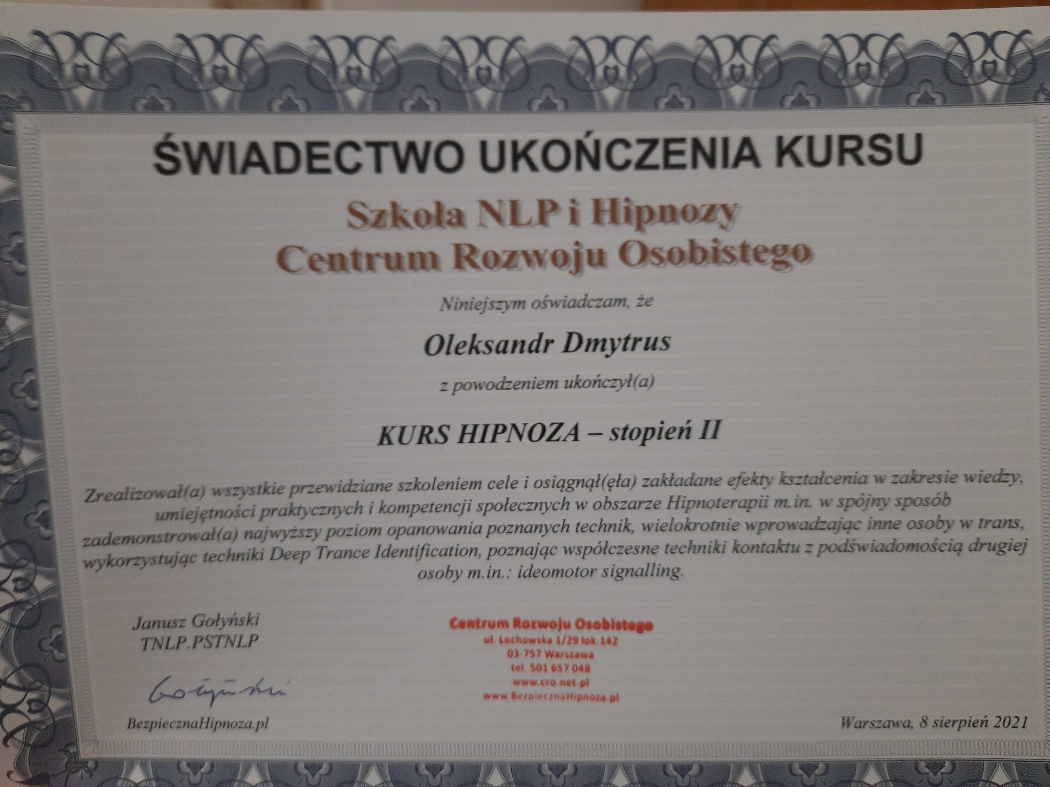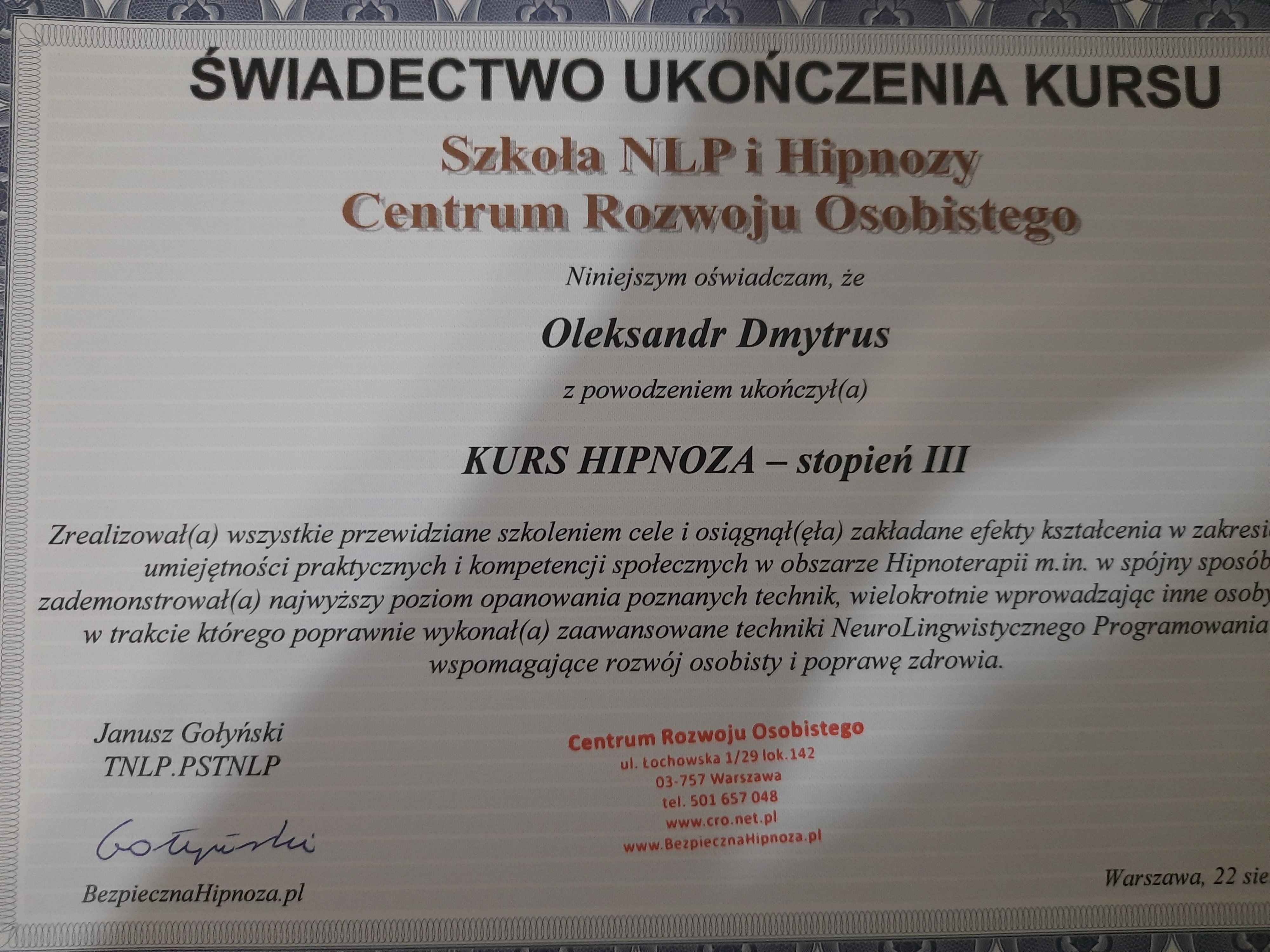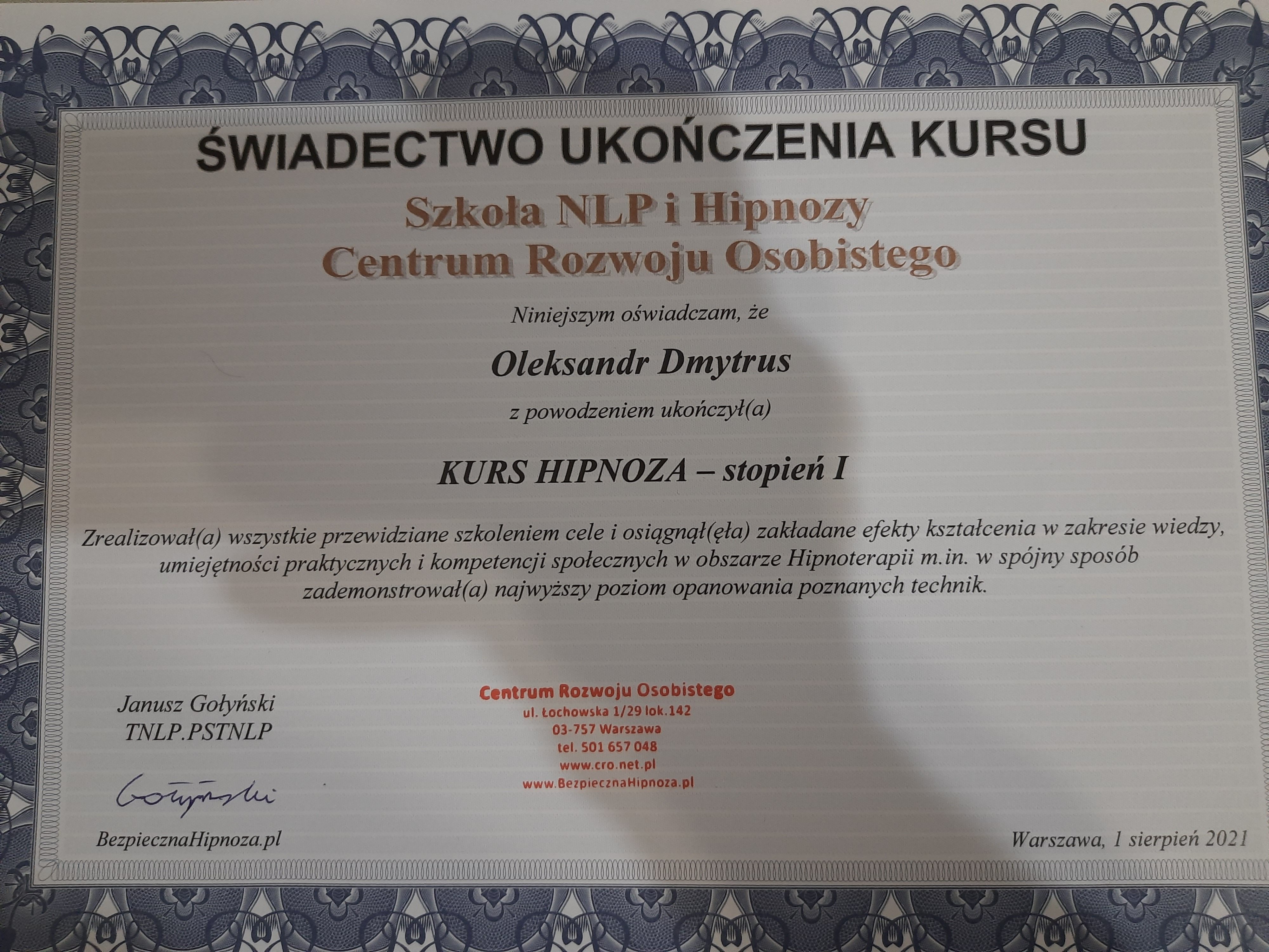 Do swojej pracy podchodzę z pasją lubię pomagać ludziom pozbywać się psychologicznych ograniczeń moimi trenerami byli jedni z najlepszych i znanych mistrzów HIPNOTERAPII W Polsce i zagranicą: