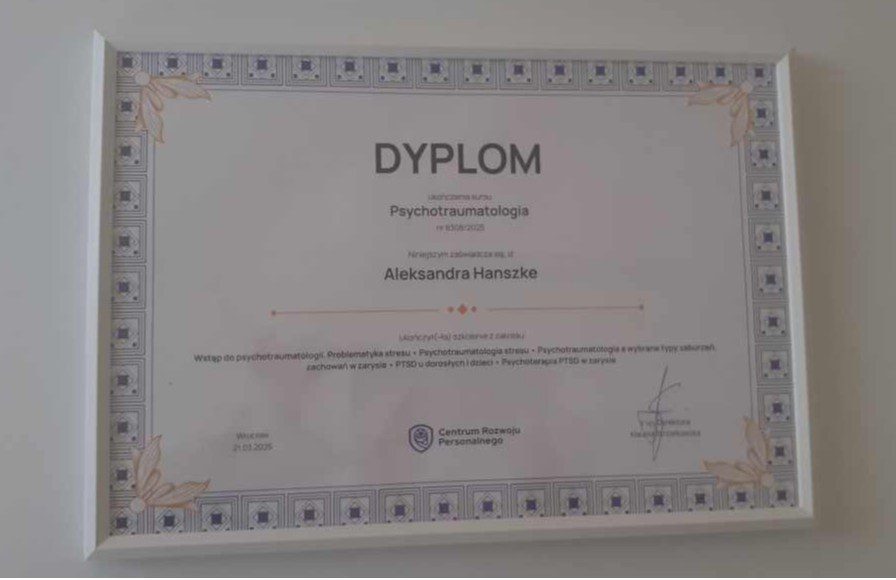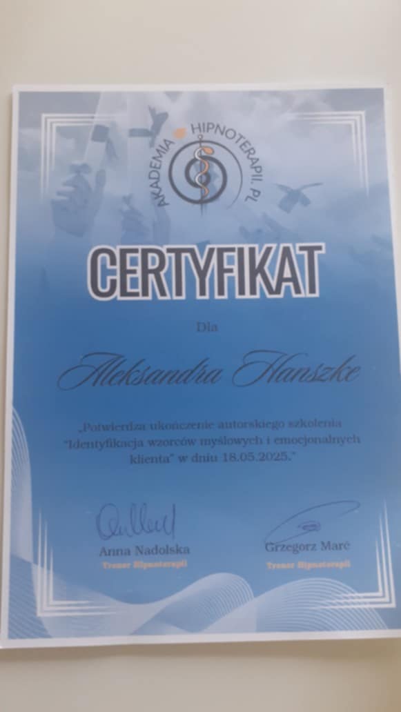 Nazywam się Aleksandra Hanszke, jestem psychologiem , certyfikowaną Hipnoterapeutką,terapeutą w trakcie szkoleń EMDR .
