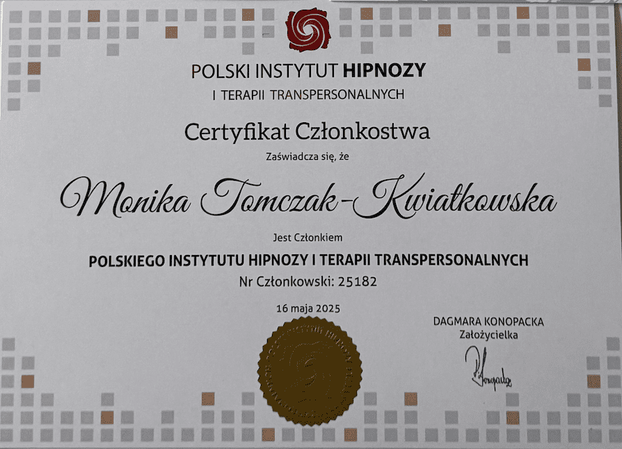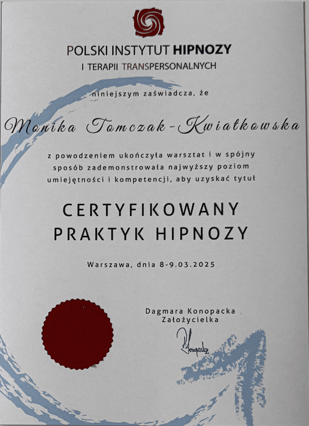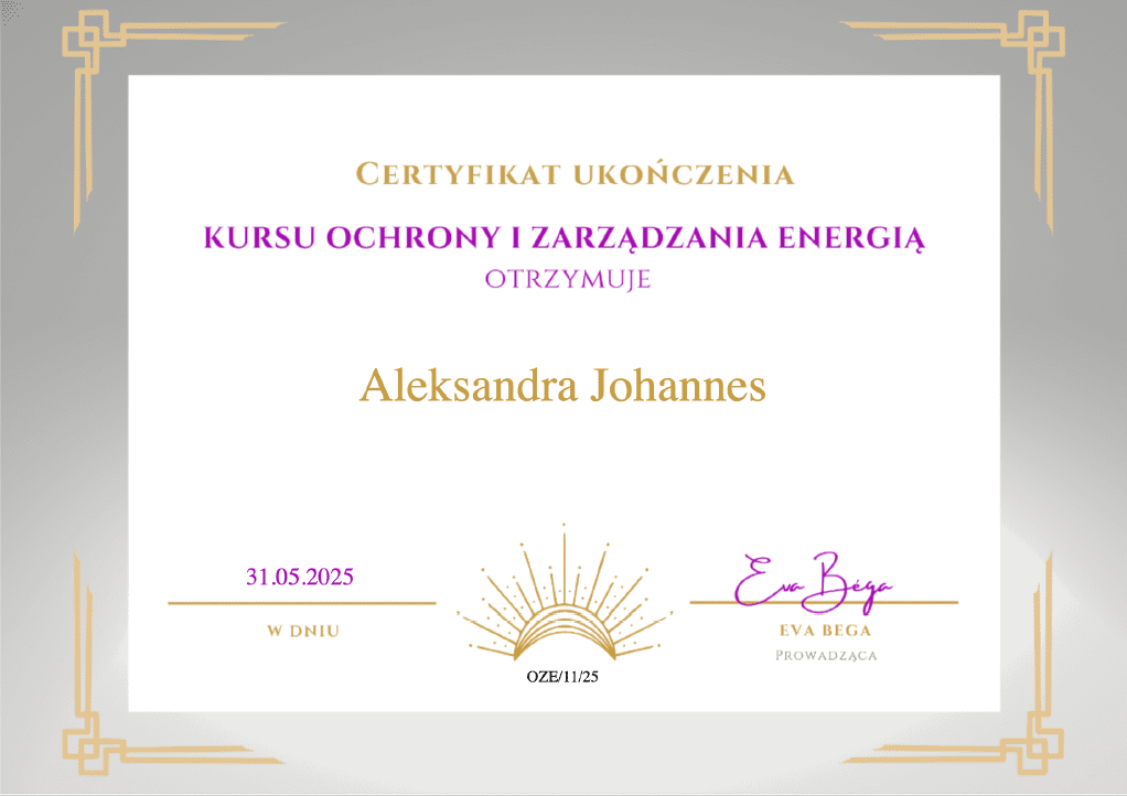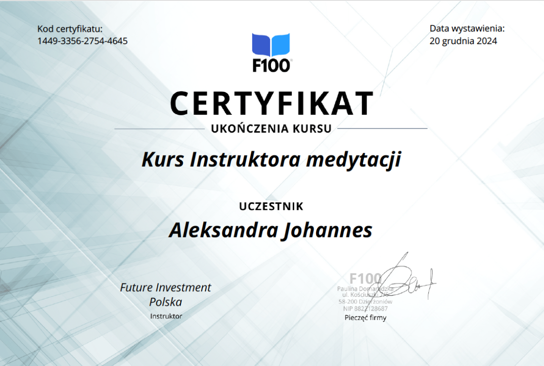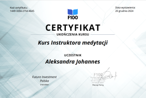 - Instruktorka medytacji oraz certyfikowaną Hipnoterapeutka Transpersonalna (Polski Instytut hipnozy i terapii transpersonalnej)