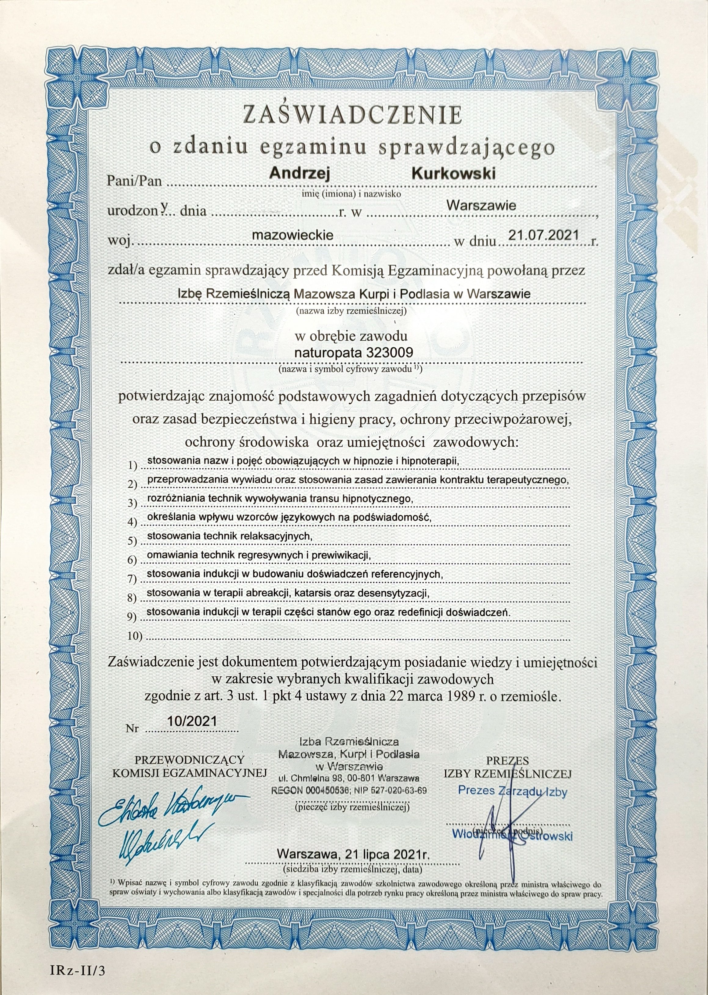 Jako hipnoterapeuta, zajmuję się głębokim poziomem podświadomości, gdzie zapisane są programy, blokady i ograniczenia. Wykorzystuję metody terapeutyczne takie jak hipnoterapia indukcyjna, hipnoterapia energetyczna, hipnoterapia ericksonowska, narzędzia NLP, regresje oraz autorską metodę hipnoterapii progresywnej, która wspiera osobisty rozwój.