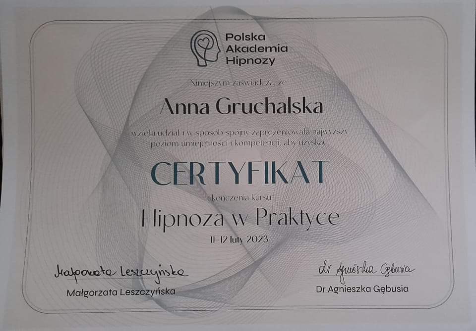 Jestem certyfikowaną hipnoterapeutką, dumną ze swojej patchworkowej rodziny. Dwie dorosłe już córki, dwa psy, dwa koty i okresowo inne zwierzęta, które w potrzebie znajdą u nas kąt. Uwrażliwienie na drugiego człowieka pozwala mi zrozumieć jego istotę problemu. Lubię słuchać i bez przeszkód pozwalam wygadać się drugiej osobie. Hipnoterapię traktuję jako naukę dla obydwu stron, każdy jest inny i wciąż się uczę.
