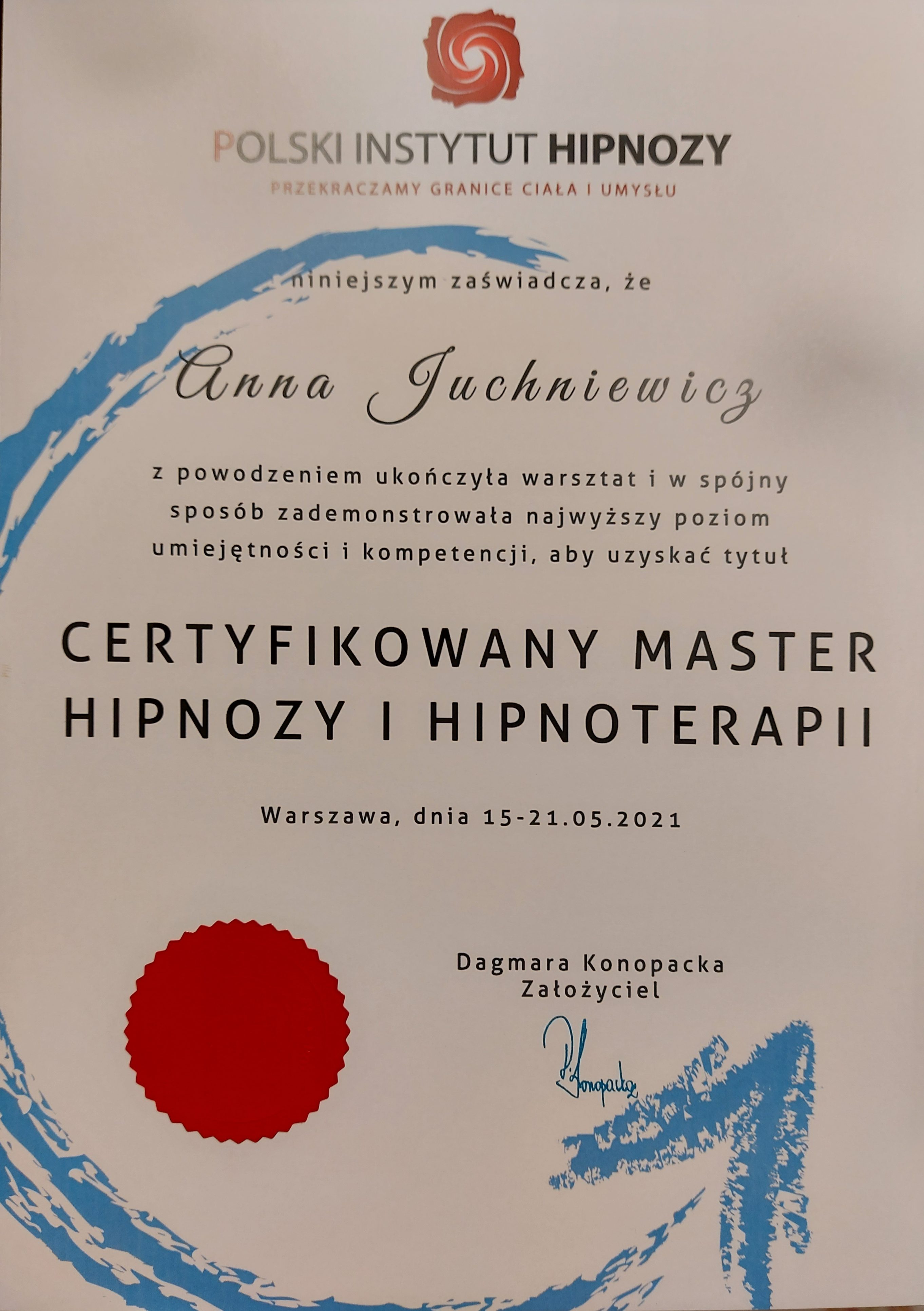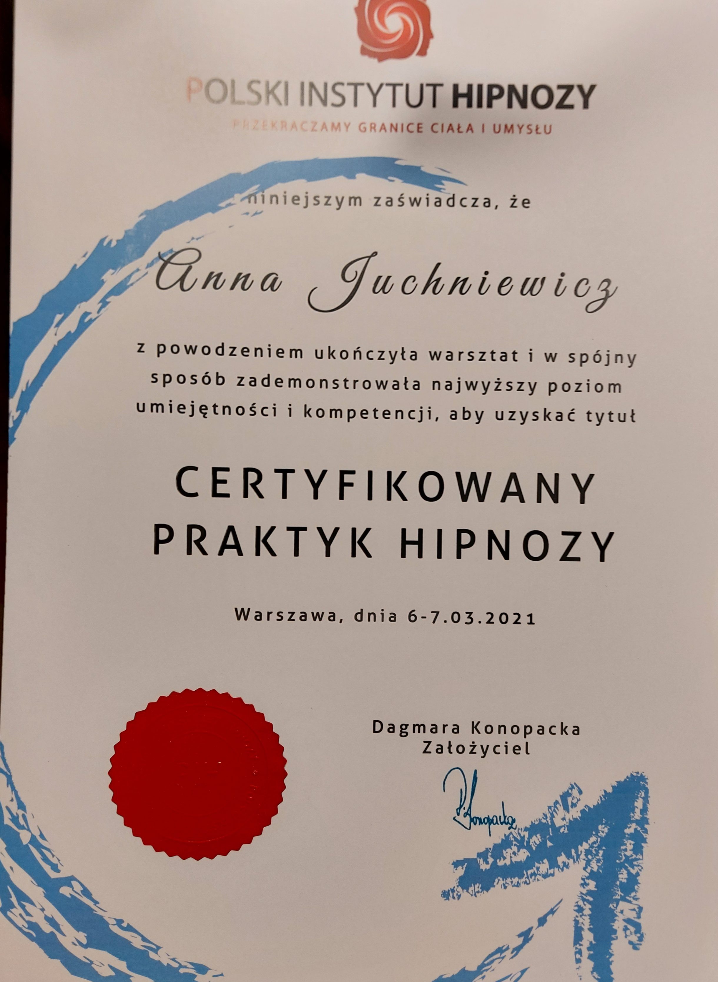 Certyfikowana Hipnoterapeutka – Praktyk i Master Hipnozy w Polskim Instytucie Hipnozy i Terapii Transpersonalnych