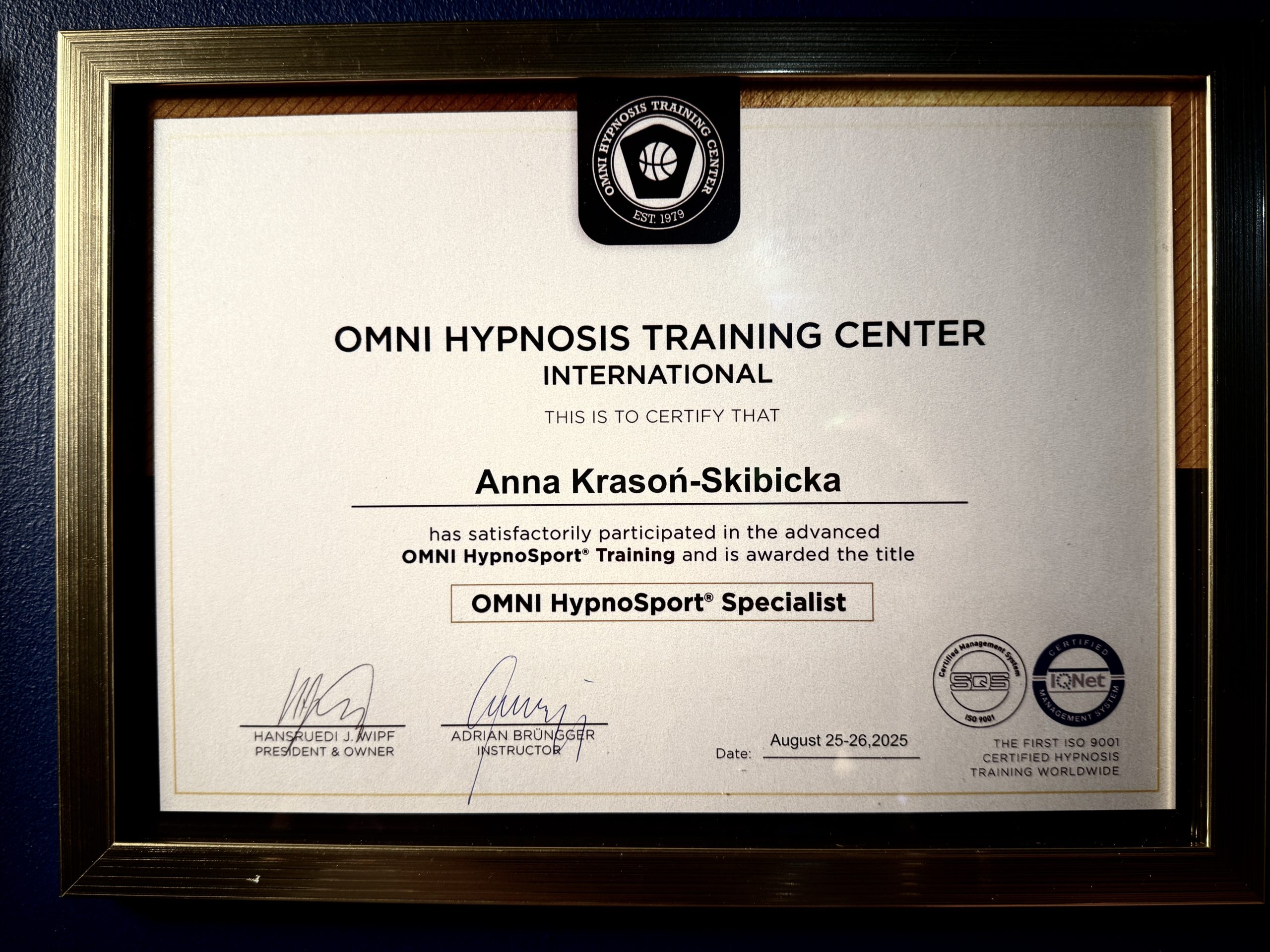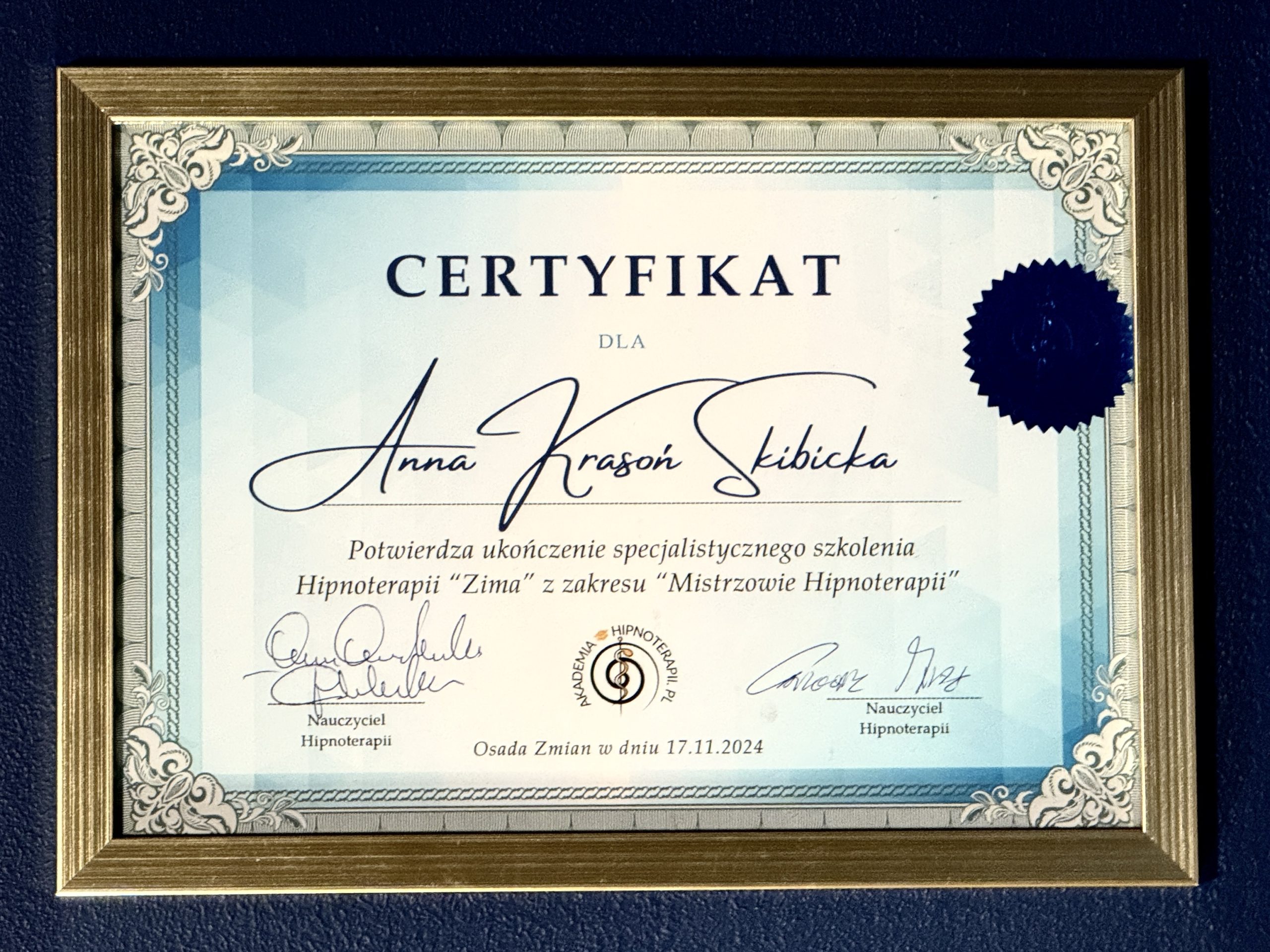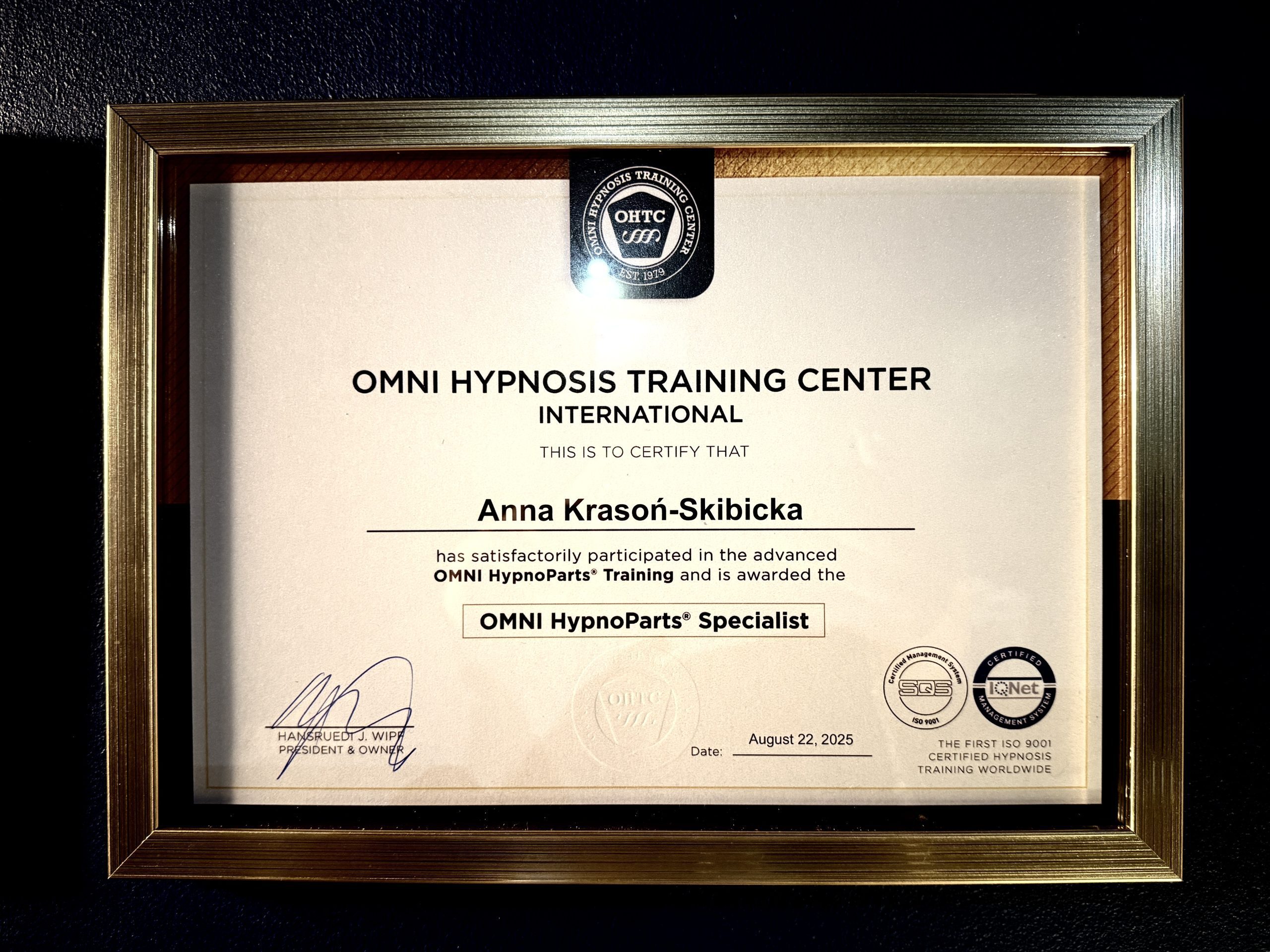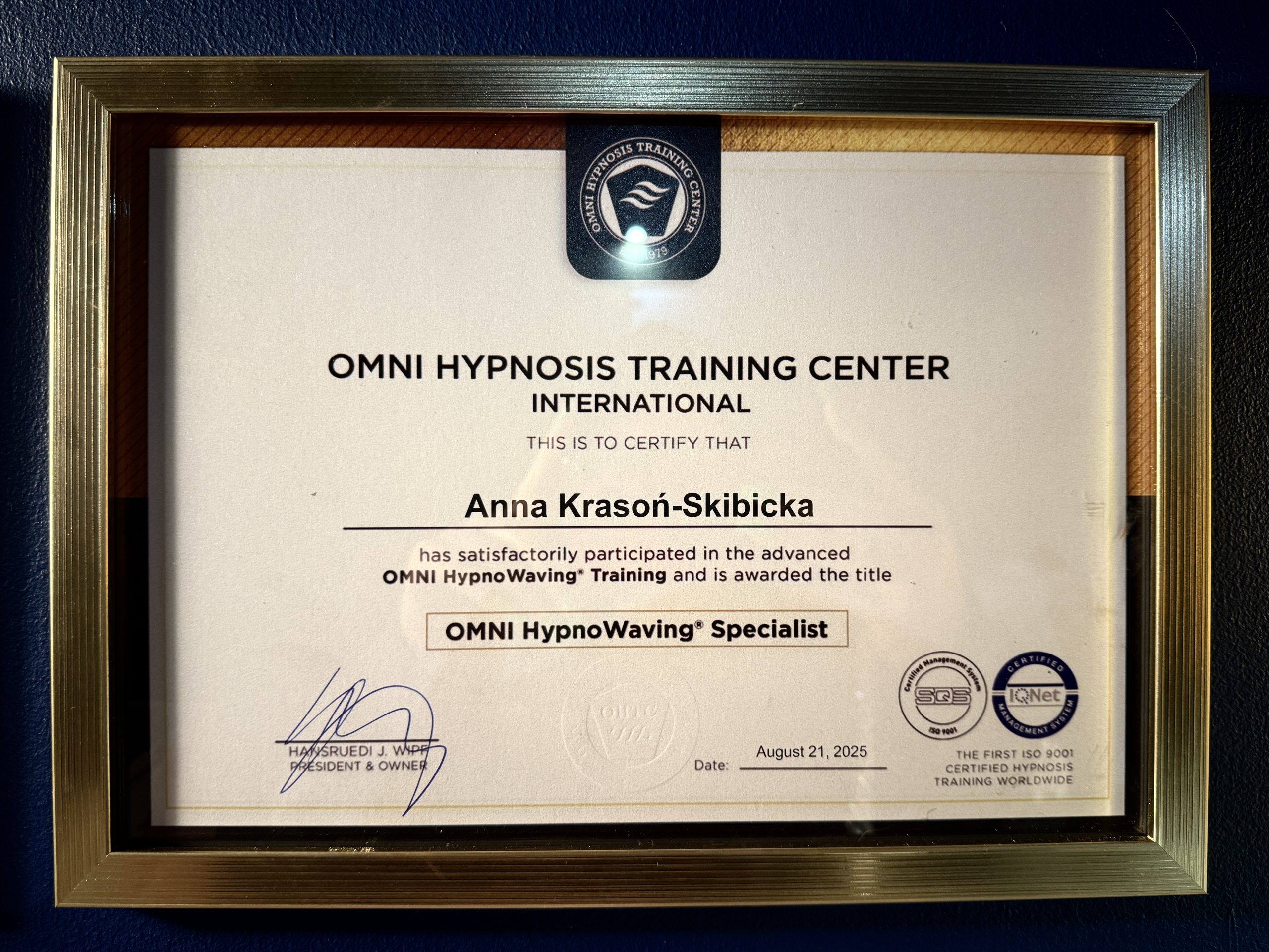 Jestem magistrem psychologii, hipnoterapeutą, mistrzem Hipnozy Kognitywnej. Ukończyłam wiele elitarnych szkoleń z zakresu hipnozy i pracy z umysłem. Moja praktyka opiera się na tym, co działa — skutecznie, etycznie, z głębokim szacunkiem dla indywidualności.