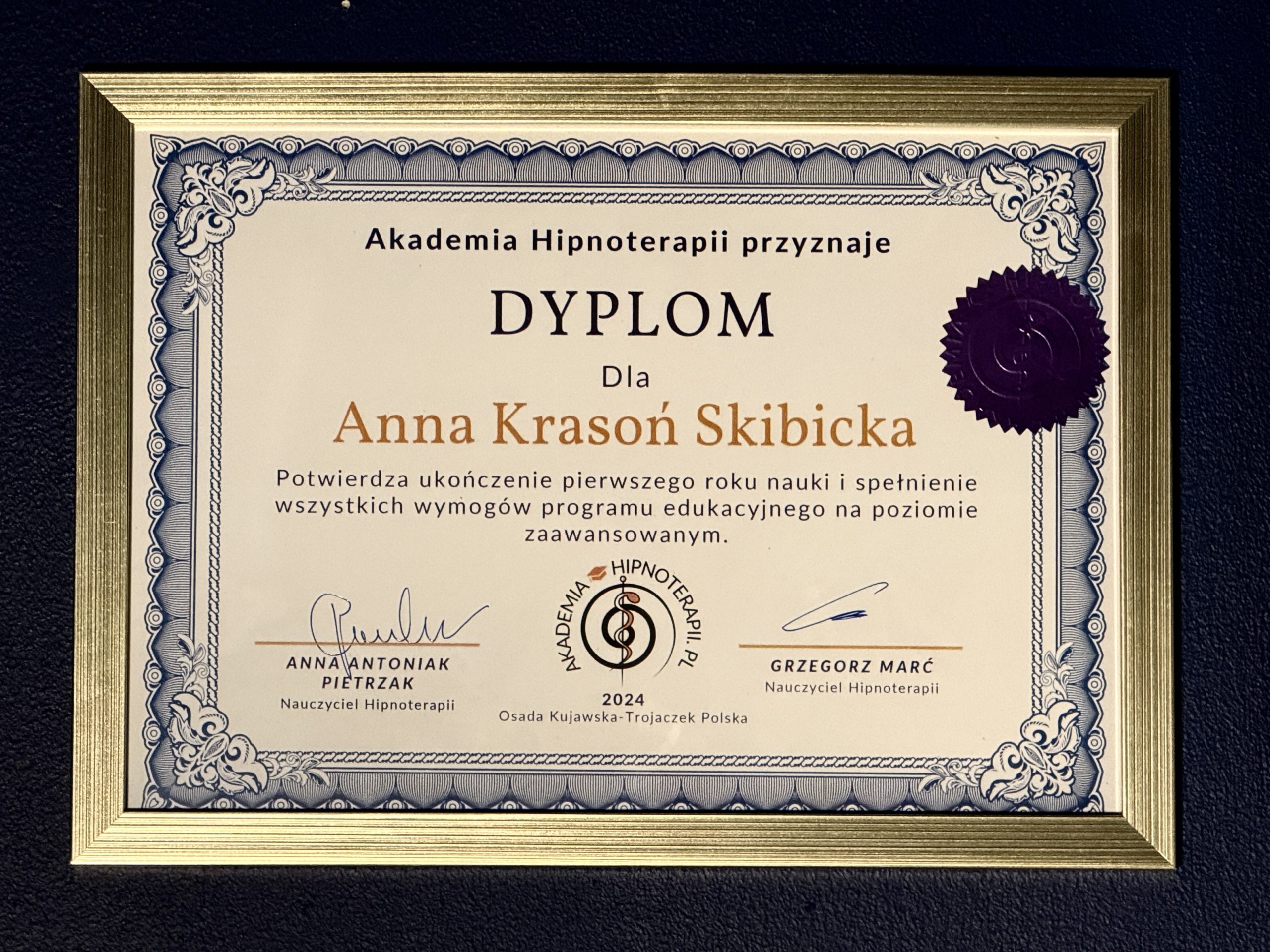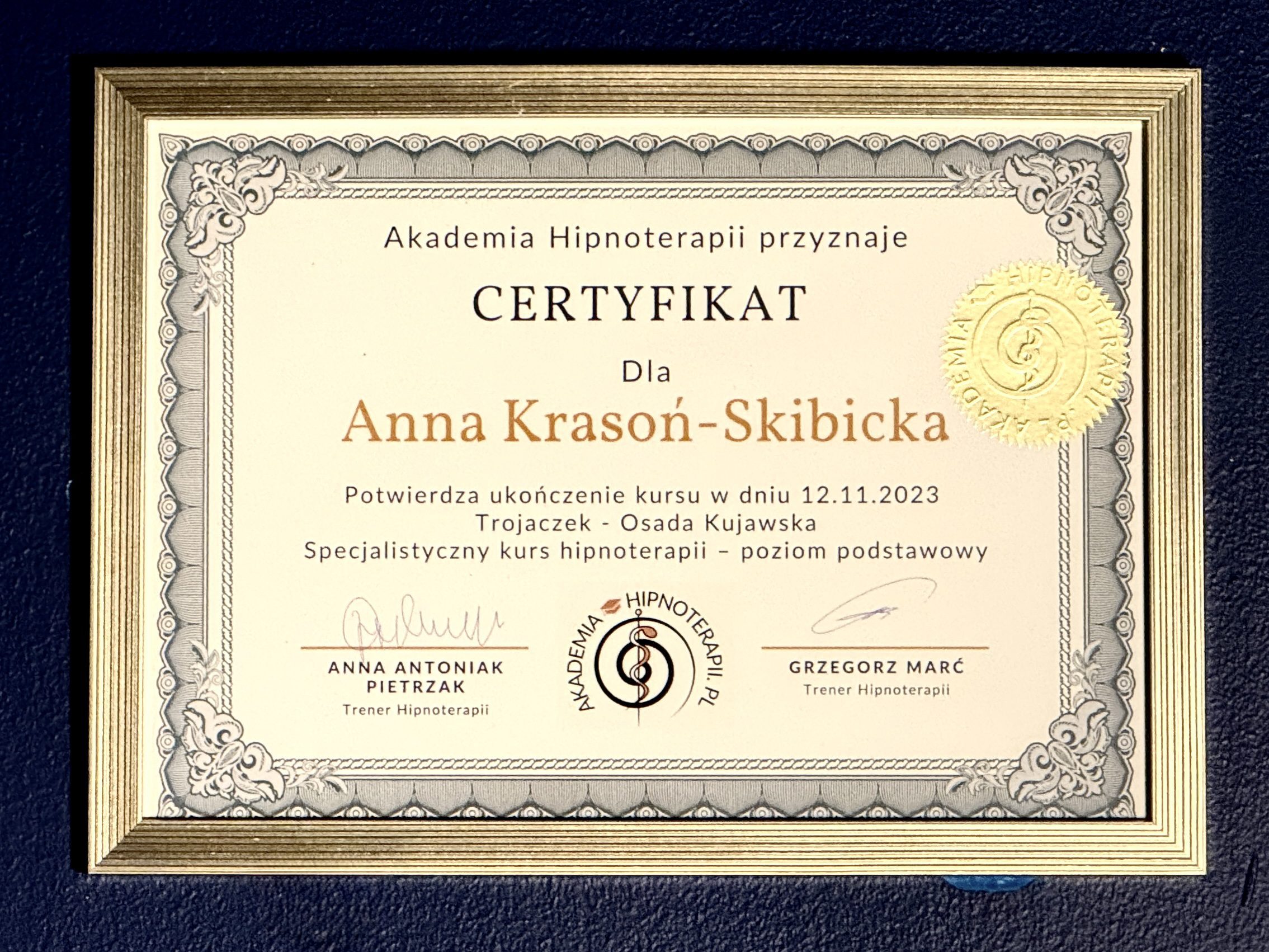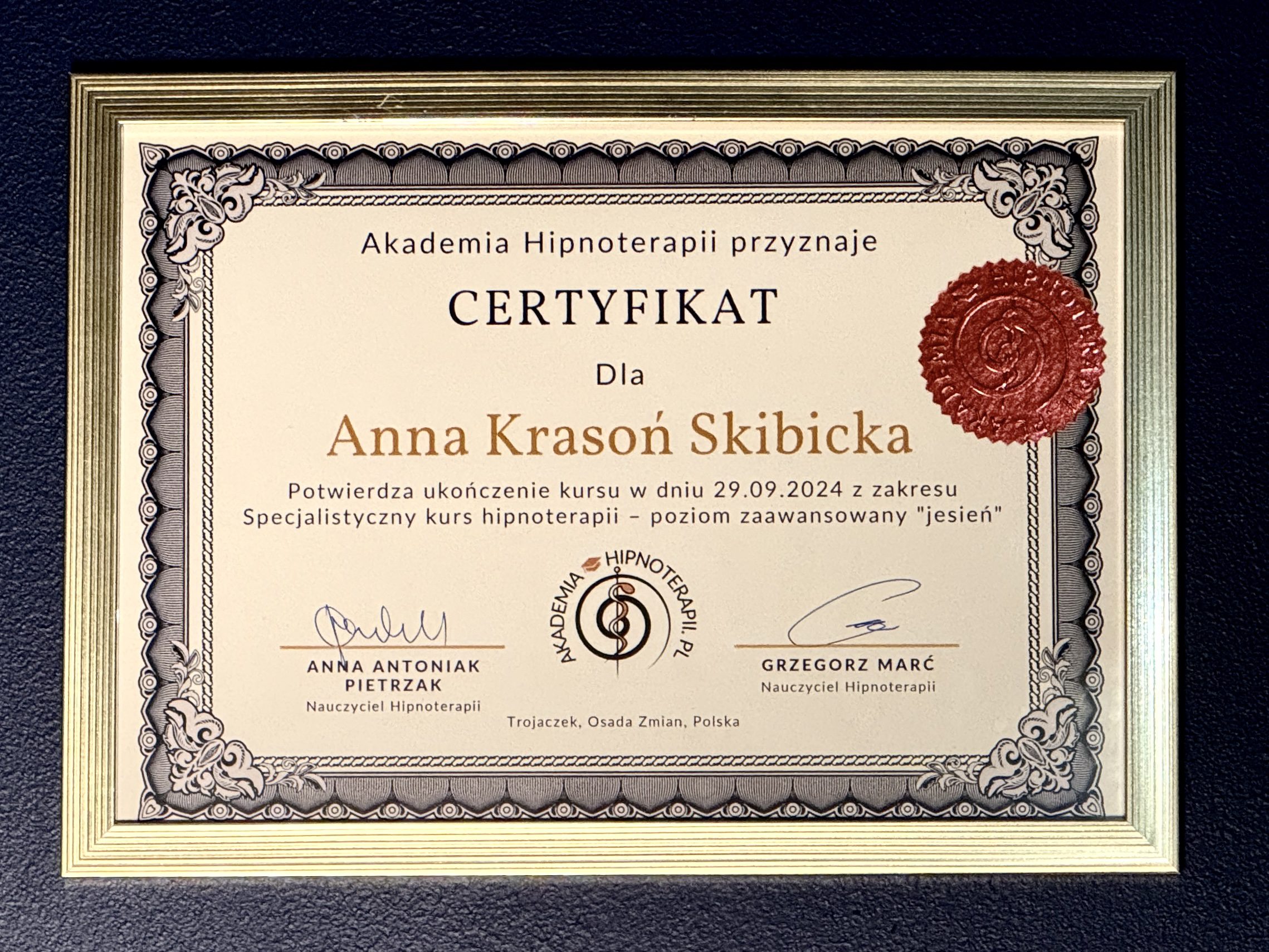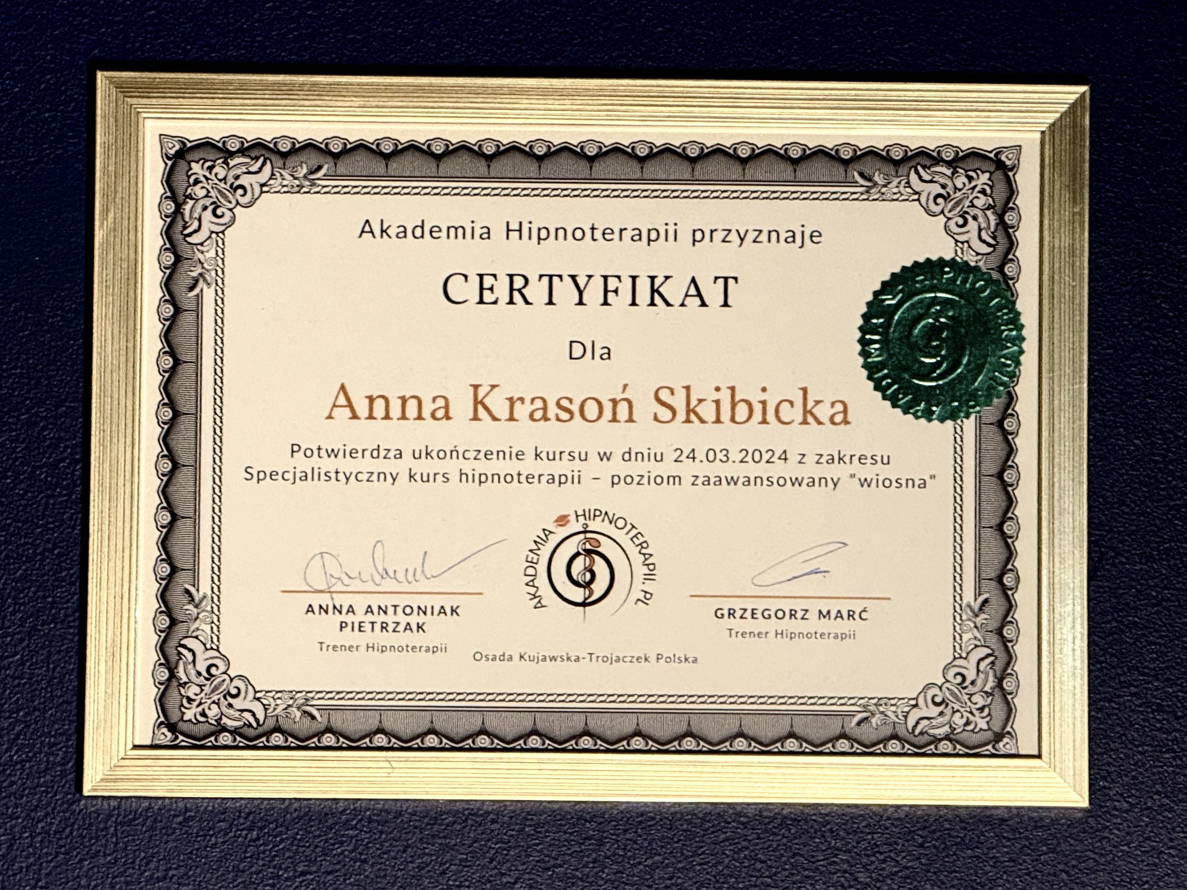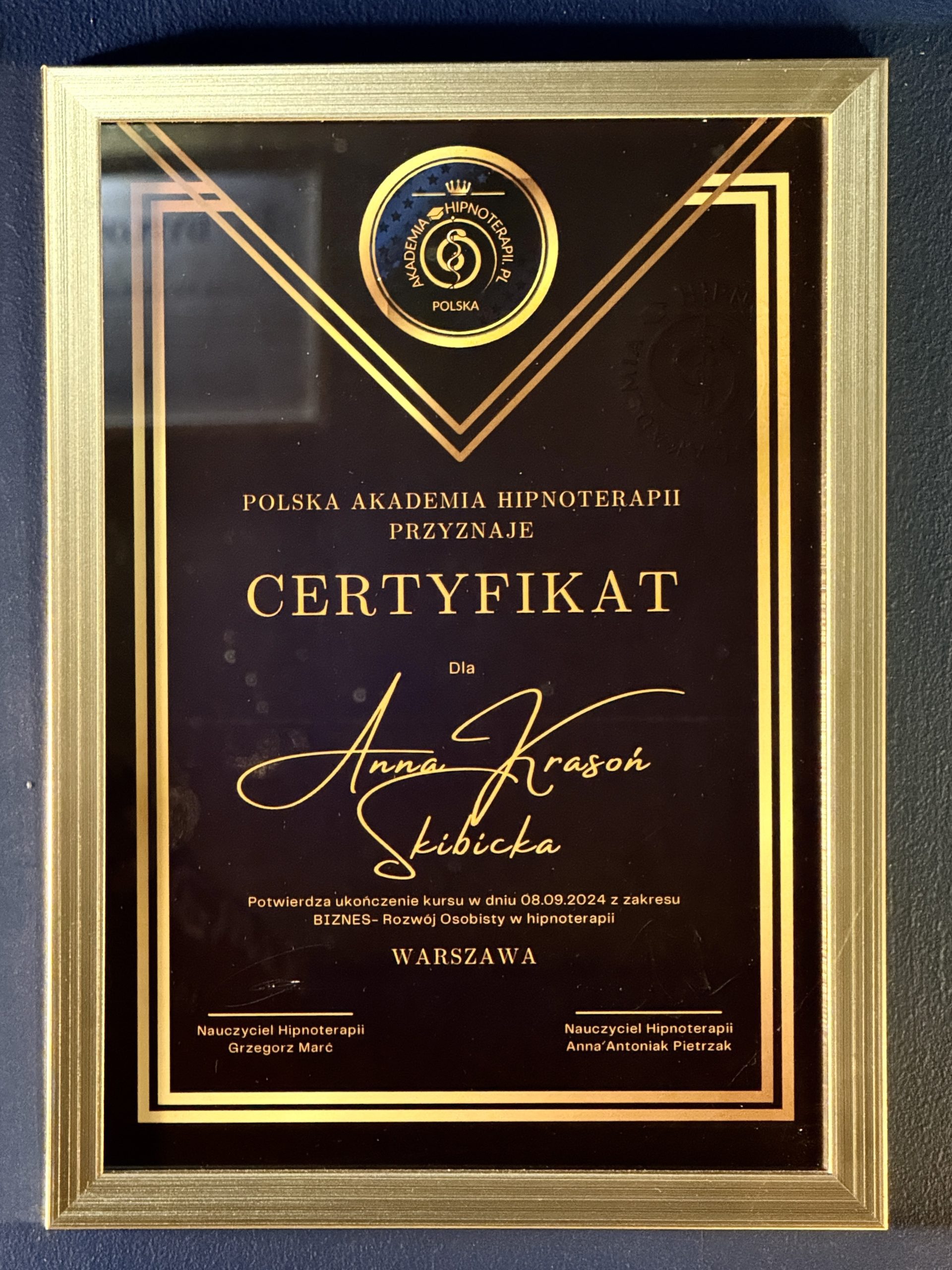 Jestem magistrem psychologii, hipnoterapeutą, mistrzem Hipnozy Kognitywnej. Ukończyłam wiele elitarnych szkoleń z zakresu hipnozy i pracy z umysłem. Moja praktyka opiera się na tym, co działa — skutecznie, etycznie, z głębokim szacunkiem dla indywidualności.