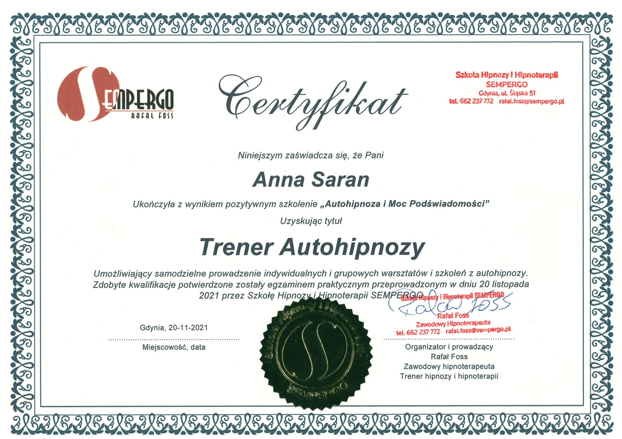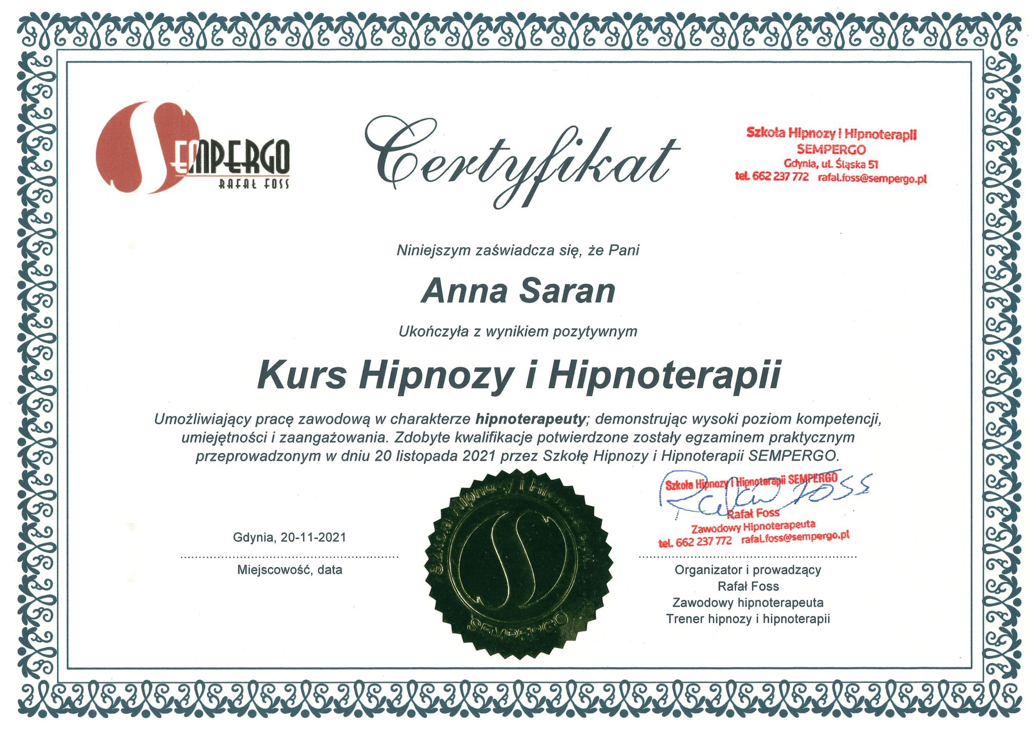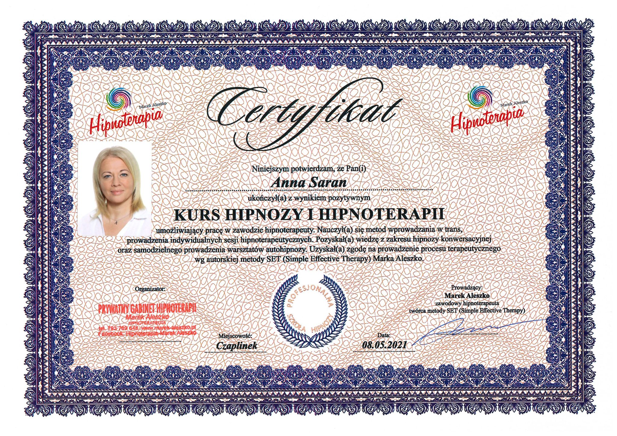 Wiosną 2021 roku zdobyłam tytuł certyfikowanego hipnoterapeuty.