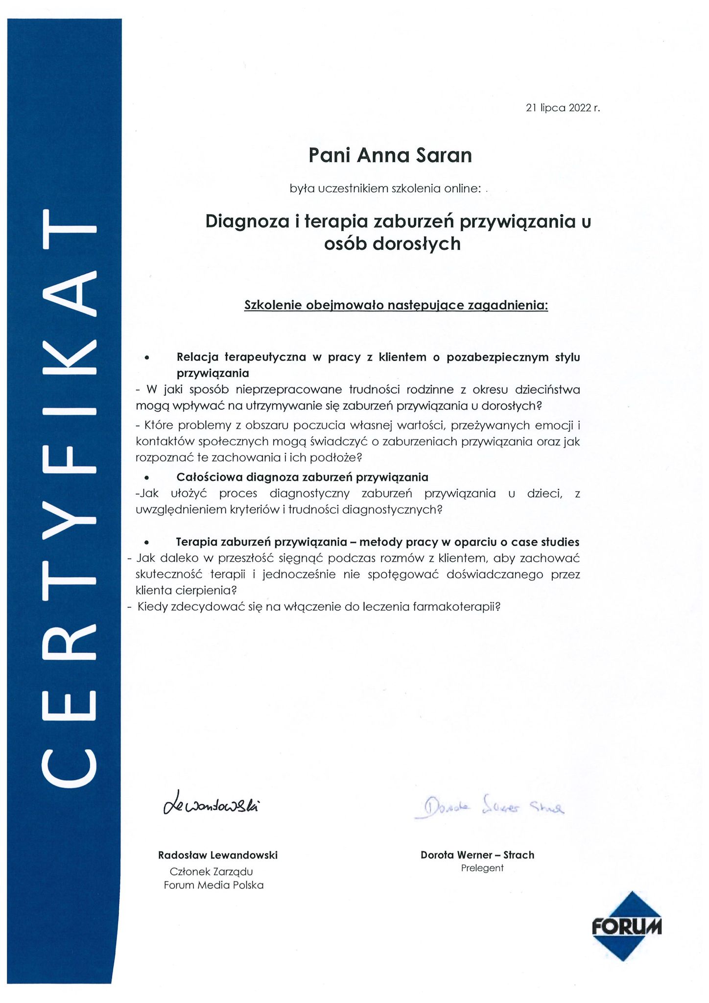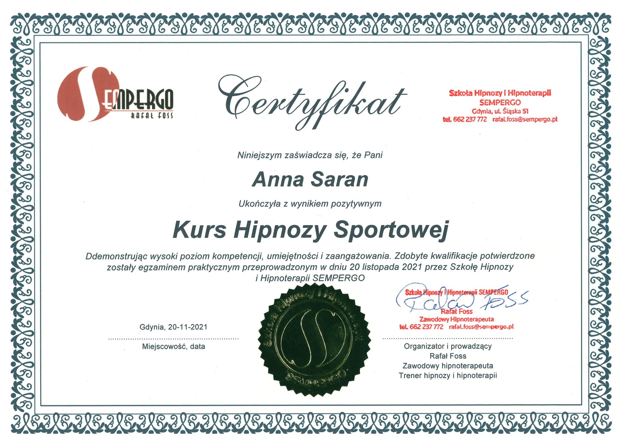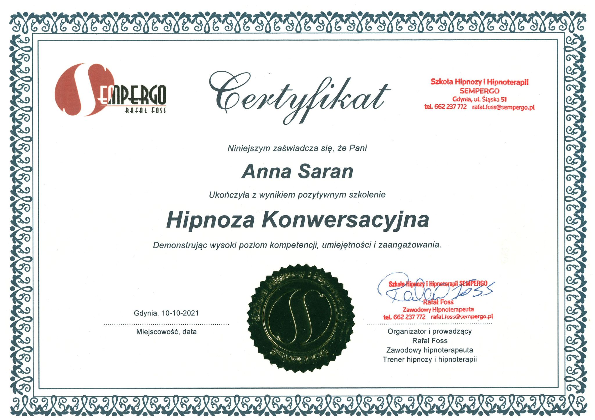 Wiosną 2021 roku zdobyłam tytuł certyfikowanego hipnoterapeuty.