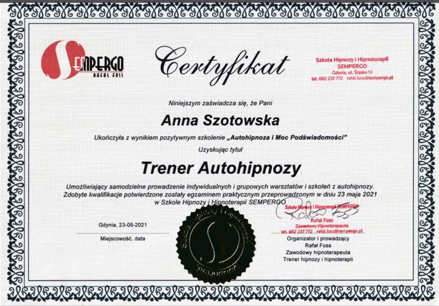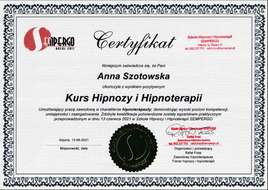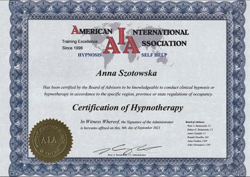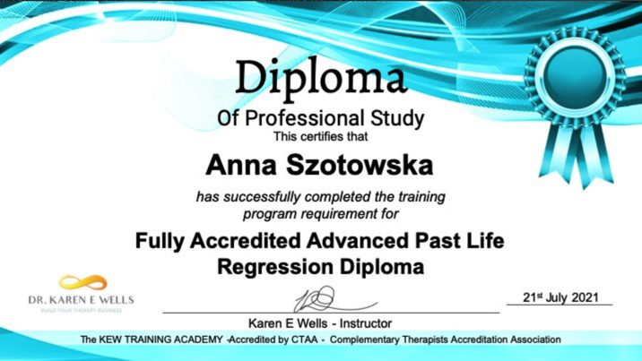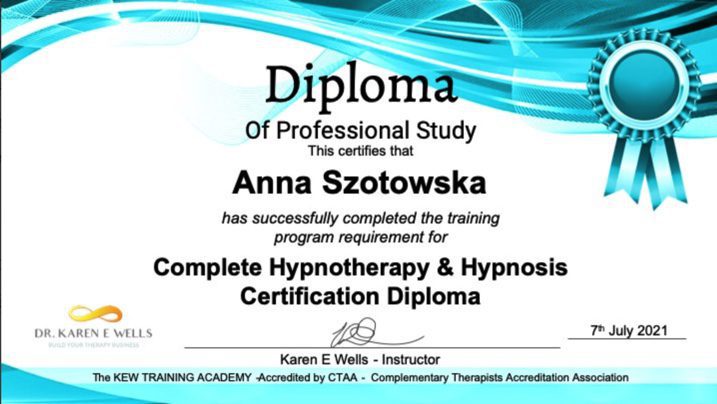 Ukończyłam między innymi szkołę Hipnozy i Hipnoterapii pod profesjonalnym okiem Rafała Fossa, American School of Hypnosis, a także liczne kursy, jak: Ericksonian Hypnotherapy Certification, Treating PTSD, Trauma & Phobias With The Rewind Technique w Sussex Hypnotherapy Centre oraz uzyskując dyplomy: Complete Hypnotherapy & Hypnosis Certification Diploma, Master Hypnotherapist Course, Fully Accredited Advanced Past Life Regression Diploma.