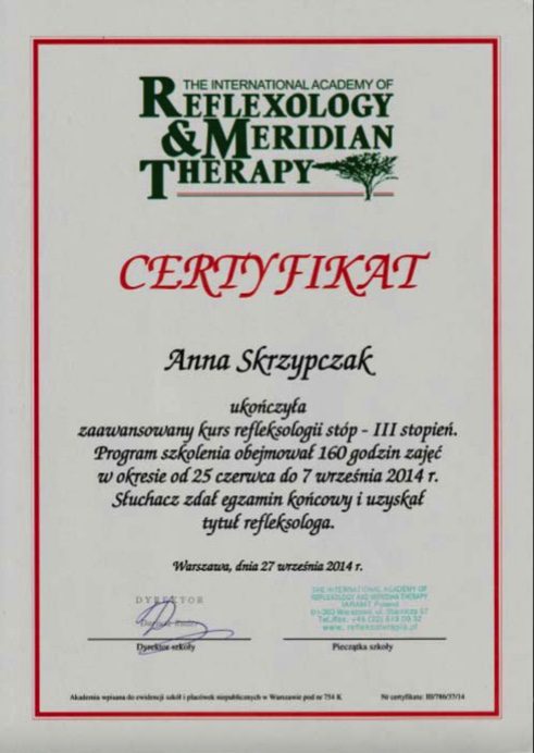 Jestem również refleksologiem - ukończyłam Europejską Akademię Refleksologii.