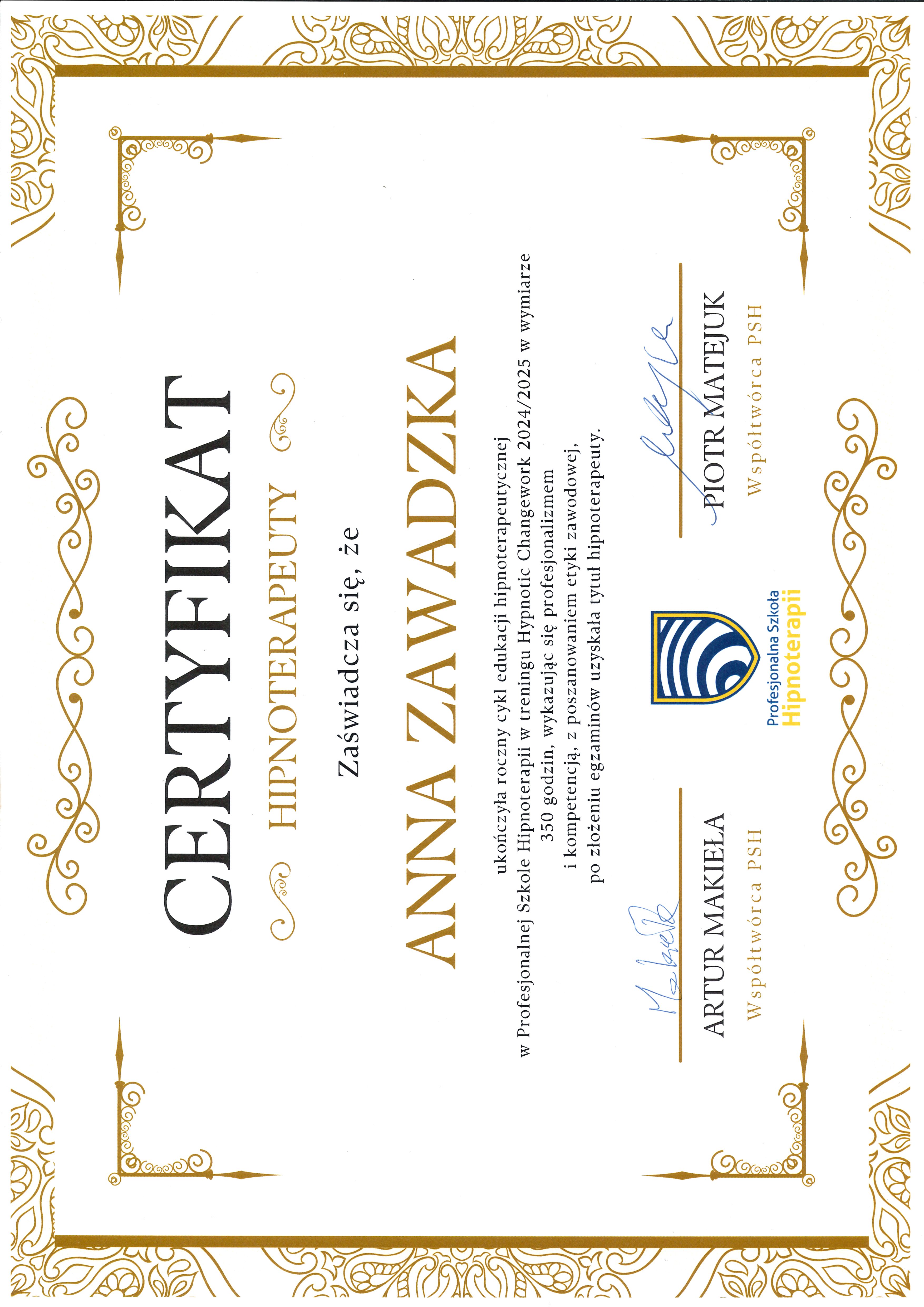 Nazywam się Anna Zawadzka-Szajewska. Jestem certyfikowaną hipnoterapeutką, pedagogiem, coachem i numerolożką. Pracuję z osobami, które na zewnątrz „ogarniają”, a w środku czują napięcie, wstyd, lęk przed oceną, prokrastynację albo powtarzające się schematy w relacjach i pracy.
