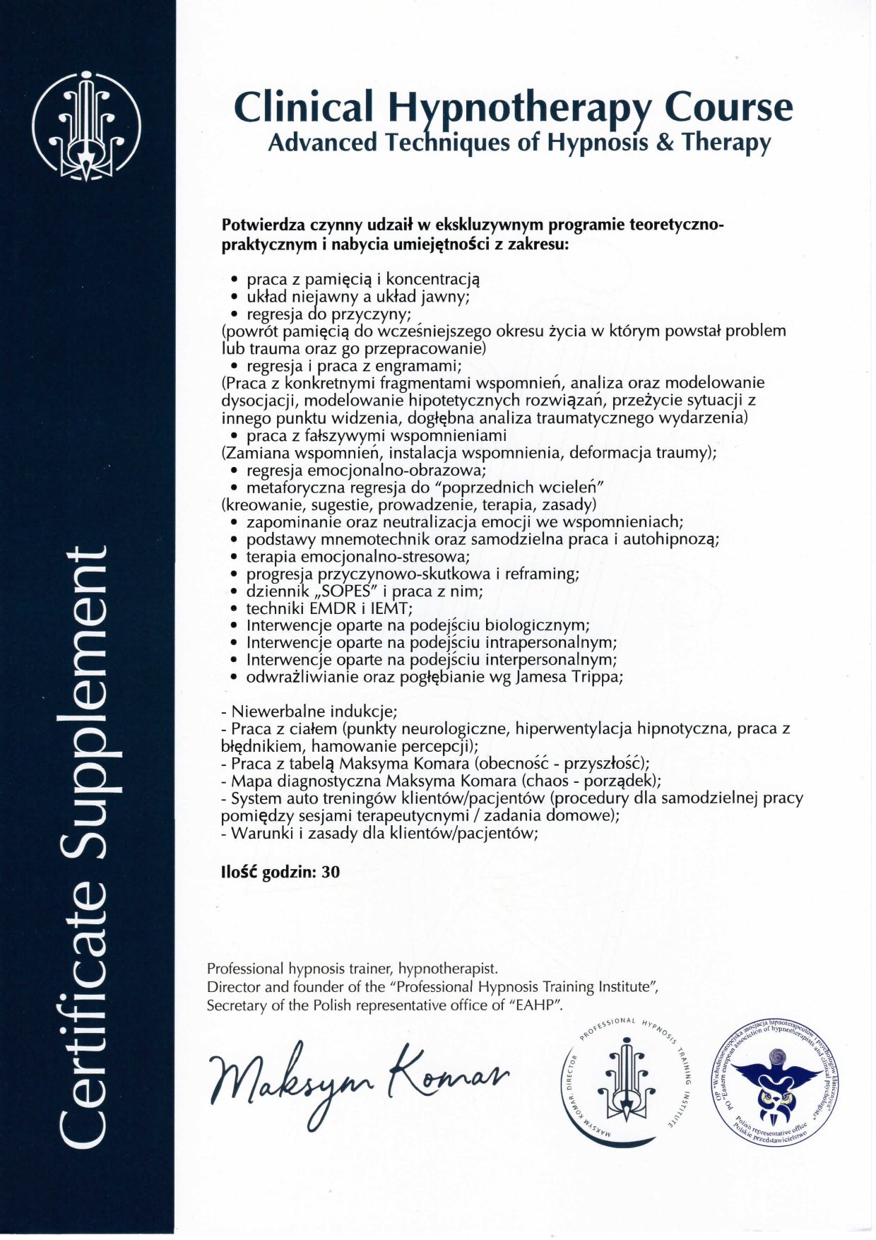 - Certyfikaty od renomowanych stowarzyszeń, w tym European Society of Hypnosis i International Hypnosis Association
