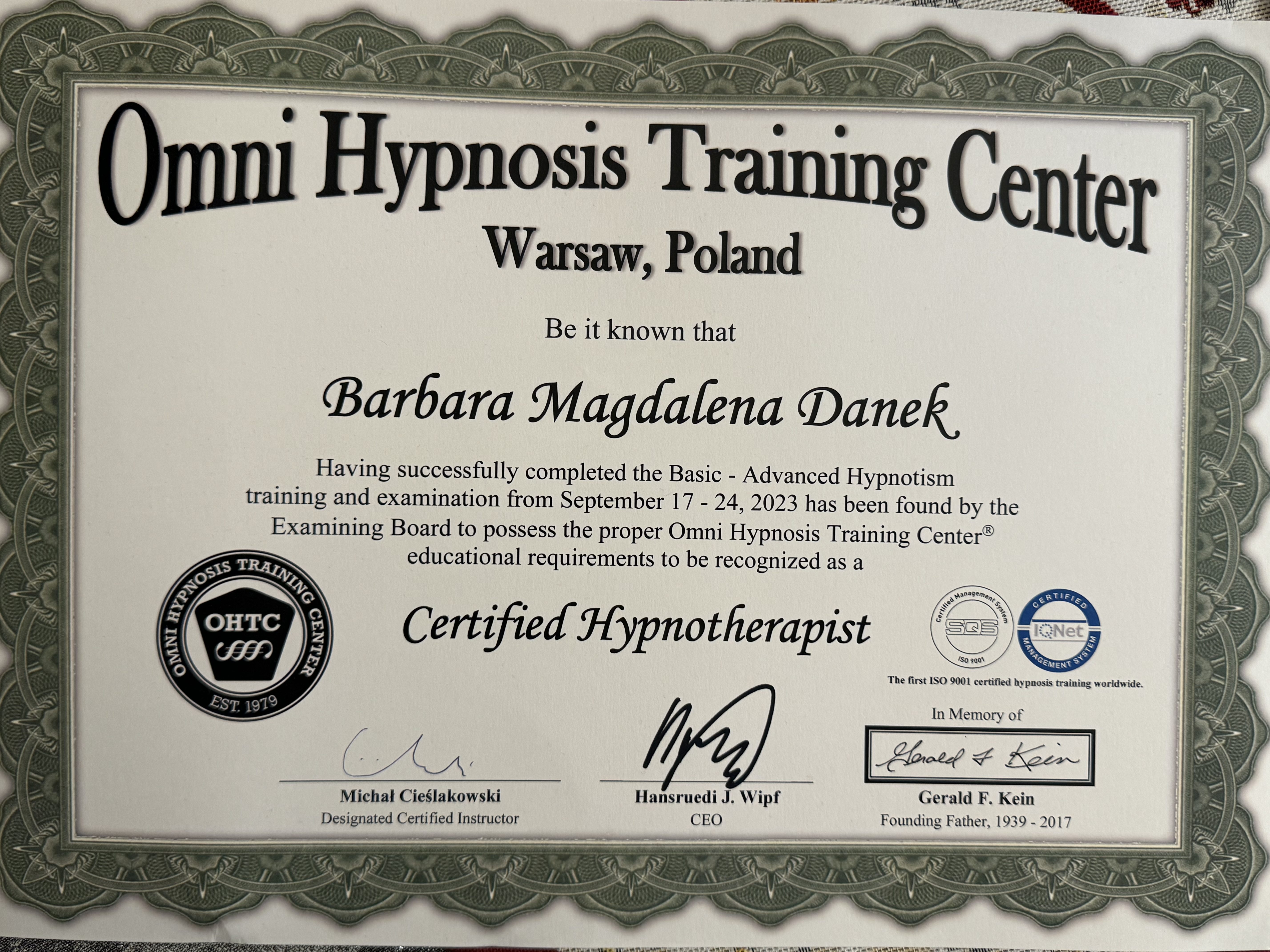 posiadam dyplom z OMNI Hypnosis Training Center, które jest uznawane za jedno z czołowych ośrodków szkoleniowych w tej dziedzinie na świecie, a także w Polsce.