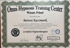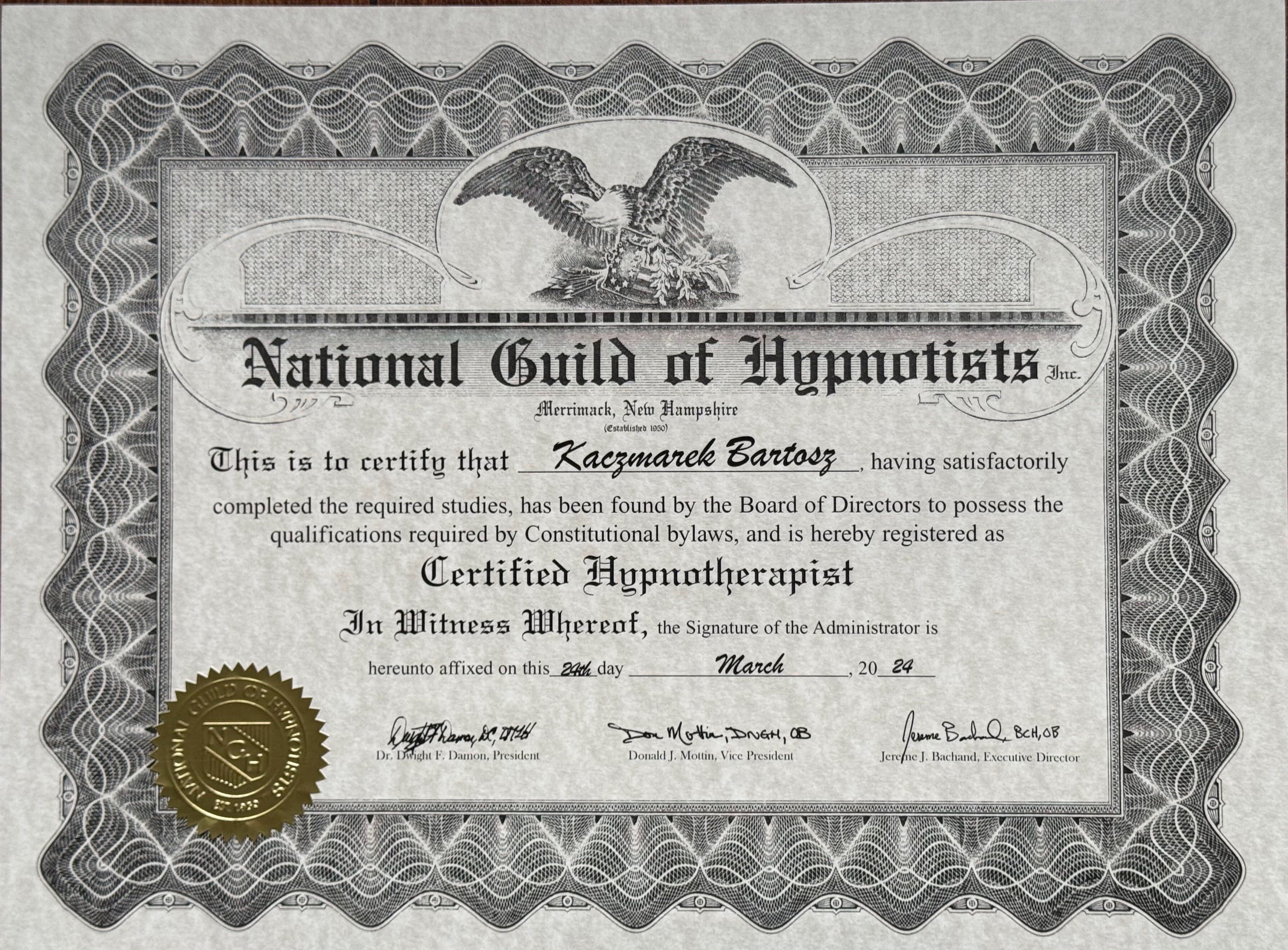 Jestem certyfikowanym hipnoterapeutą, który ukończył prestiżową amerykańską szkołę OMNI Hypnosis Training Center – jedną z najbardziej uznanych instytucji kształcących hipnoterapeutów na świecie. Swoje kwalifikacje wzbogaciłem, zdobywając Międzynarodowy Certyfikat Hipnoterapeuty nadany przez National Board of Hypnosis Education and Certification, a jako członek National Guild of Hypnotists (NGH) przynależę do największej międzynarodowej organizacji hipnoterapeutów.