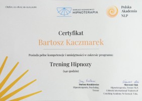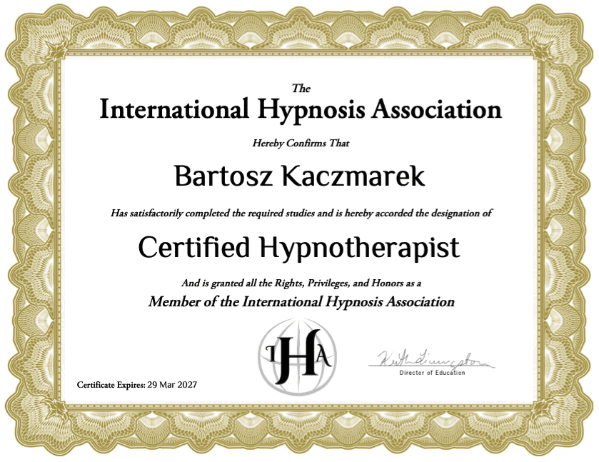 Jestem certyfikowanym hipnoterapeutą, który ukończył prestiżową amerykańską szkołę OMNI Hypnosis Training Center – jedną z najbardziej uznanych instytucji kształcących hipnoterapeutów na świecie. Swoje kwalifikacje wzbogaciłem, zdobywając Międzynarodowy Certyfikat Hipnoterapeuty nadany przez National Board of Hypnosis Education and Certification, a jako członek National Guild of Hypnotists (NGH) przynależę do największej międzynarodowej organizacji hipnoterapeutów.