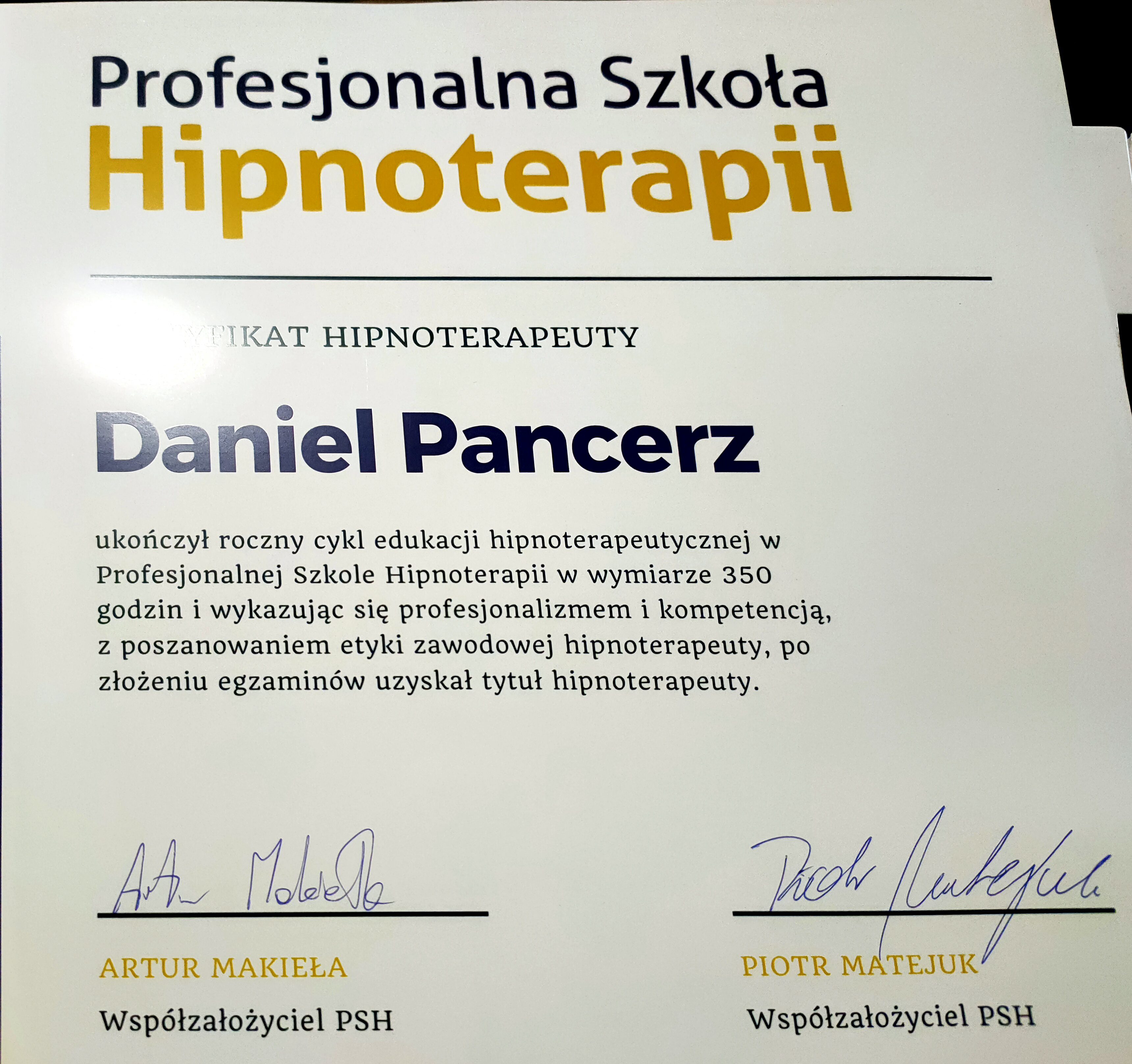 Witam wszystkich bardzo serdecznie. Nazywam się Daniel Pancerz. Z wykształcenia jestem pedagogiem, certyfikowanym hipnoterapeutą, współpracującym z Polską Akademią Rozwoju Osobistego. Dzięki kilkunastoletniej pracy w zakresie komunikacji i psychologii z grupą, korzystam z najbardziej skutecznych metod programowania umysłu, zarówno z poziomu podświadomego jak i świadomego, wykorzystując zarówno hipnozę jak i neurolingwistyczne programowanie.