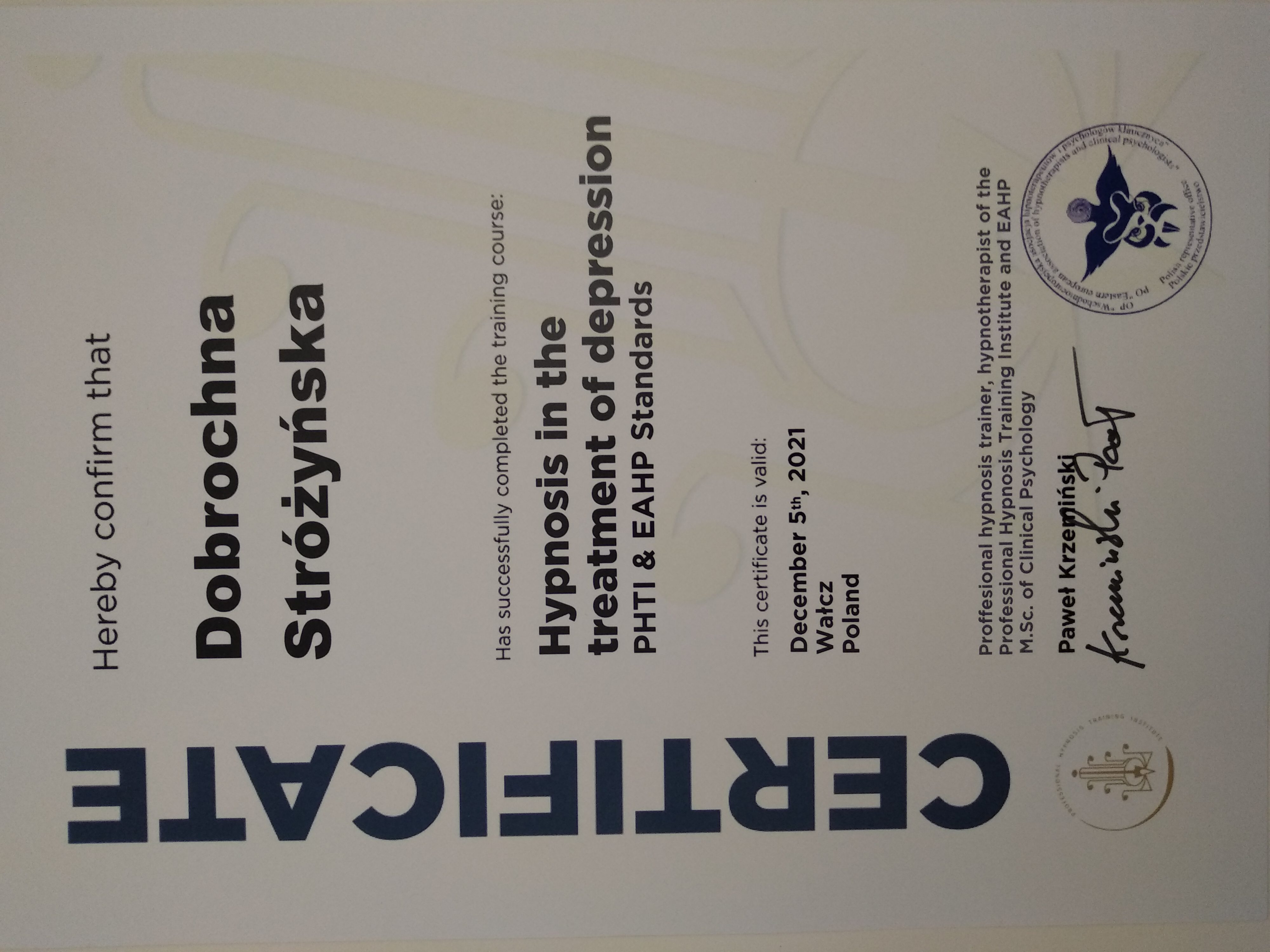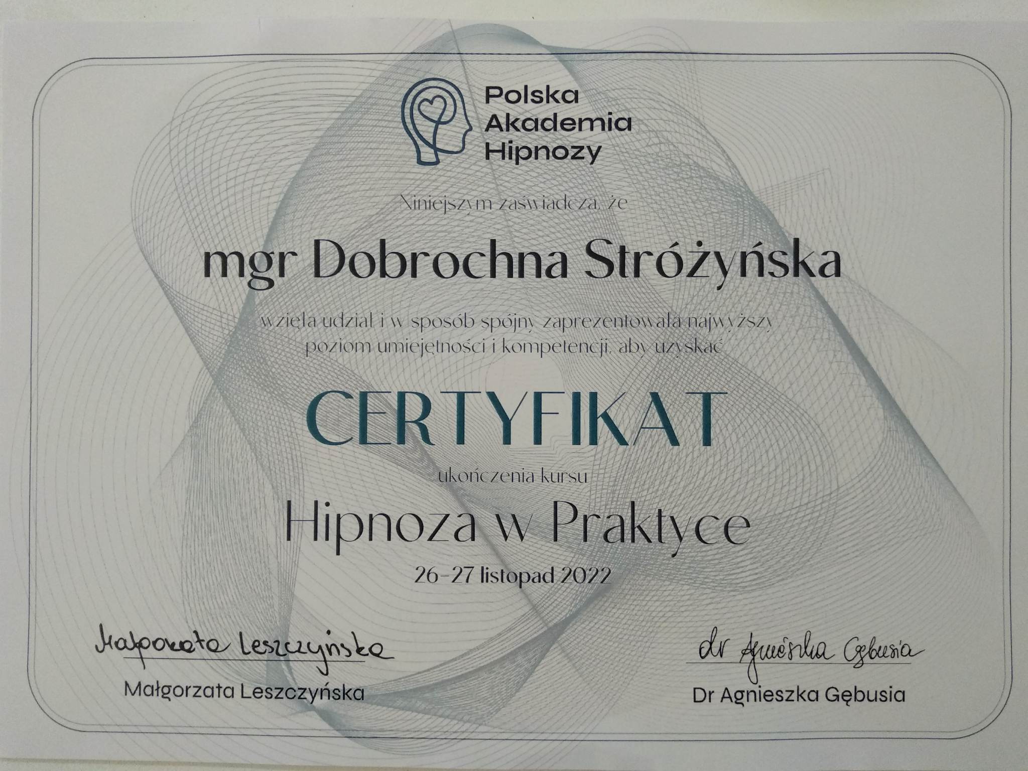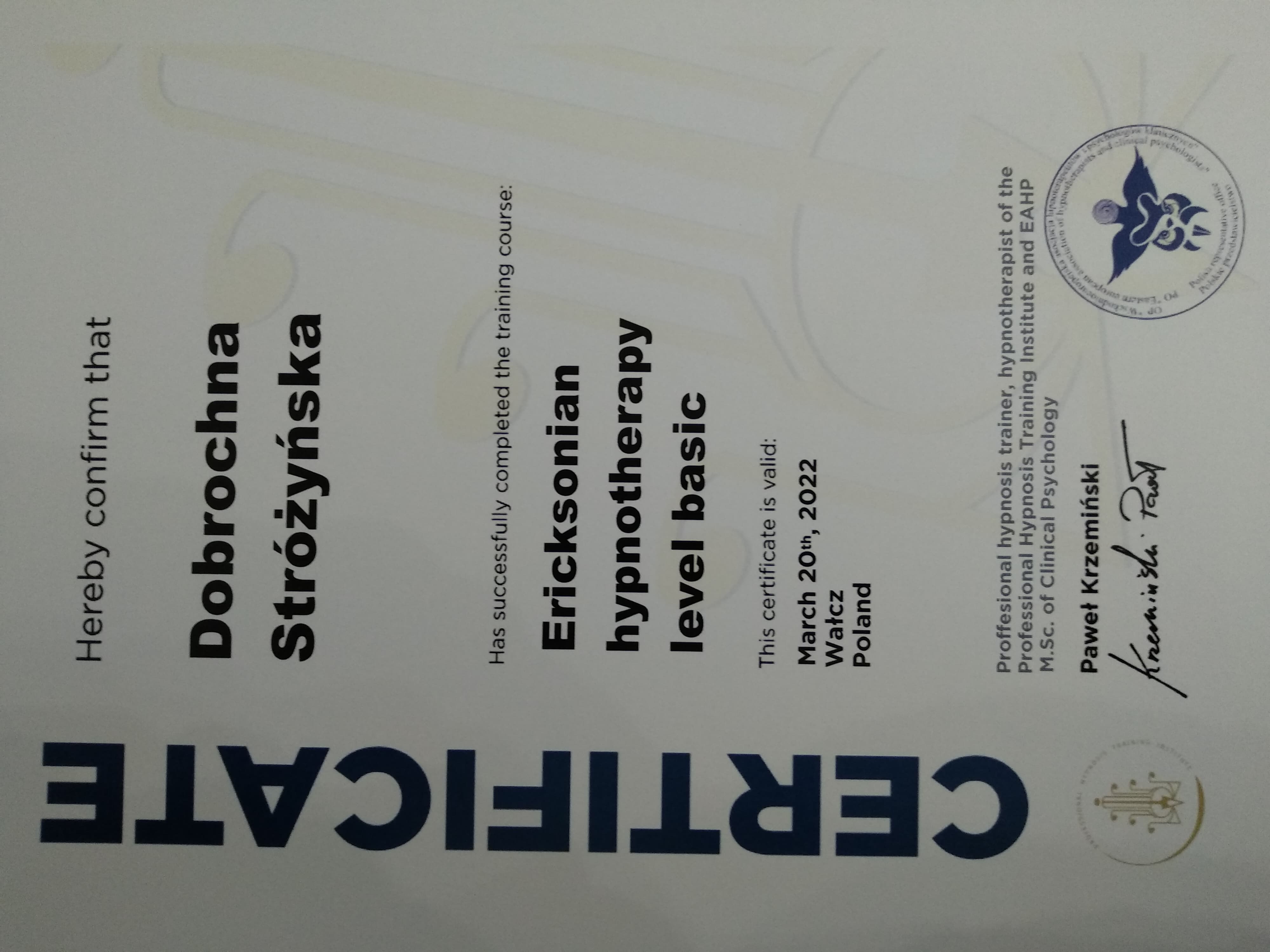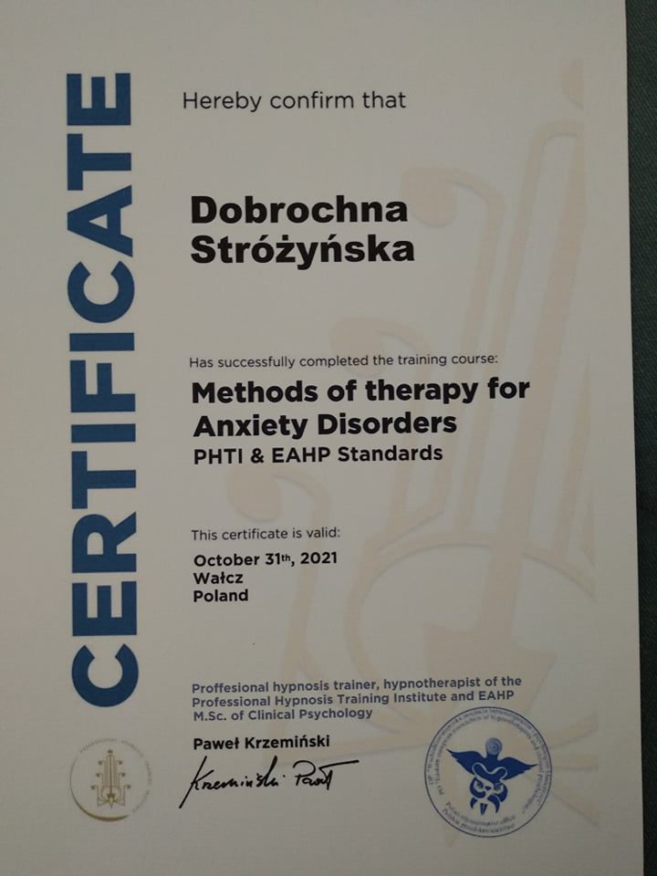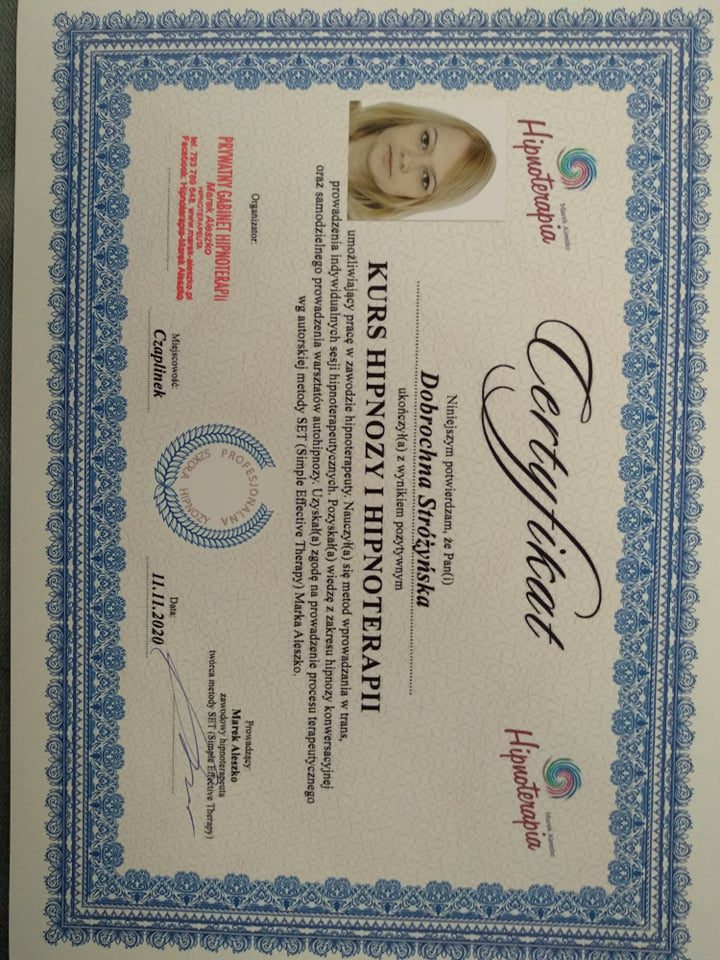 Prowadzę sesje terapeutyczne z użyciem hipnozy, które pomagają przyśpieszyć proces leczenia, zmiany lub nabycia nowych umiejętności. Bazuję na metodzie SET (Simple Effective Therapy), która opiera się w dużym stopniu na pracy z emocjami oraz pozwala wykorzystać zasoby ludzkiej podświadomości. Metoda ta jest w pełni bezpieczna oraz może być stosowana nawet u dzieci (powyżej 8 roku życia). Posiadam kilka certyfikatów wydanych przez Professional Hypnosis Training Institute, potwierdzających moje kompetencje do stosowania hipnozy w zaburzeniach lękowych, depresji oraz wykorzystywania technik EMDR (terapii odwrażliwiania i przetwarzania za pomocą ruchu gałek ocznych), a także Hipnoterapii Ericksonowskiej (poziom podstawowy i zaawansowany, Metafory i strategie). Uzyskałam certyfikat wydany przez Polską Akademię Hipnozy do stosowania hipnoterapii w praktyce. Posiadam widzę i umiejętności do prowadzenia procesu hipnoterapii żałoby (OMNI, Barwy Umysłu). Wciąż się rozwijam i regularnie uczestniczę w konferencjach oraz webinariach z zakresu hipnoterapii, zgłębiając różne podejścia i metody.