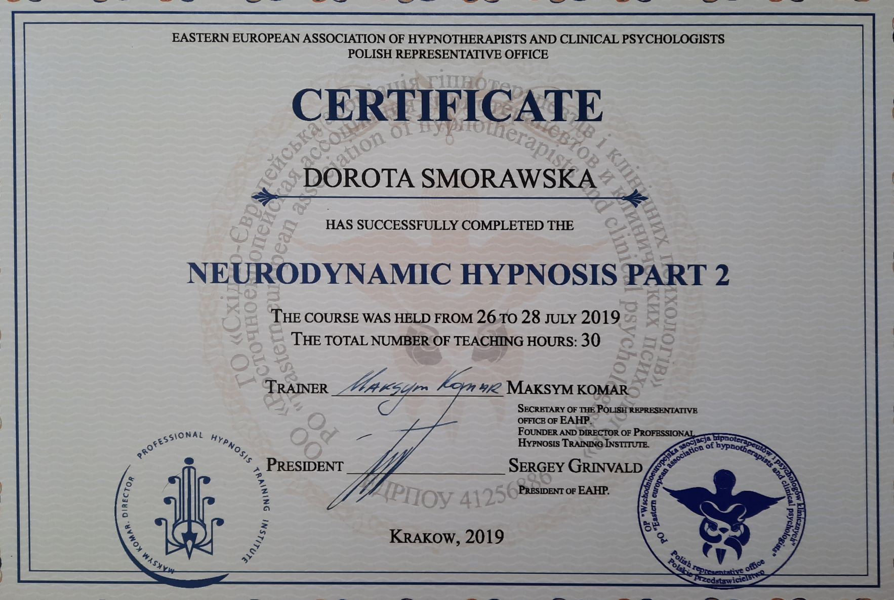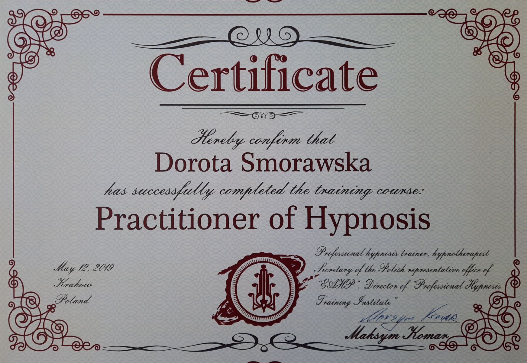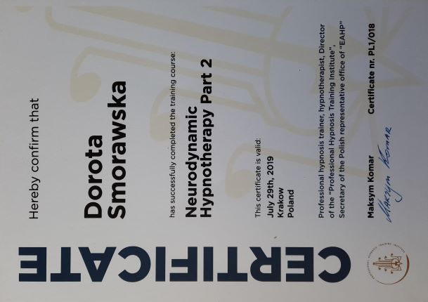 • Professional Hypnosis Training Institute – od 2019