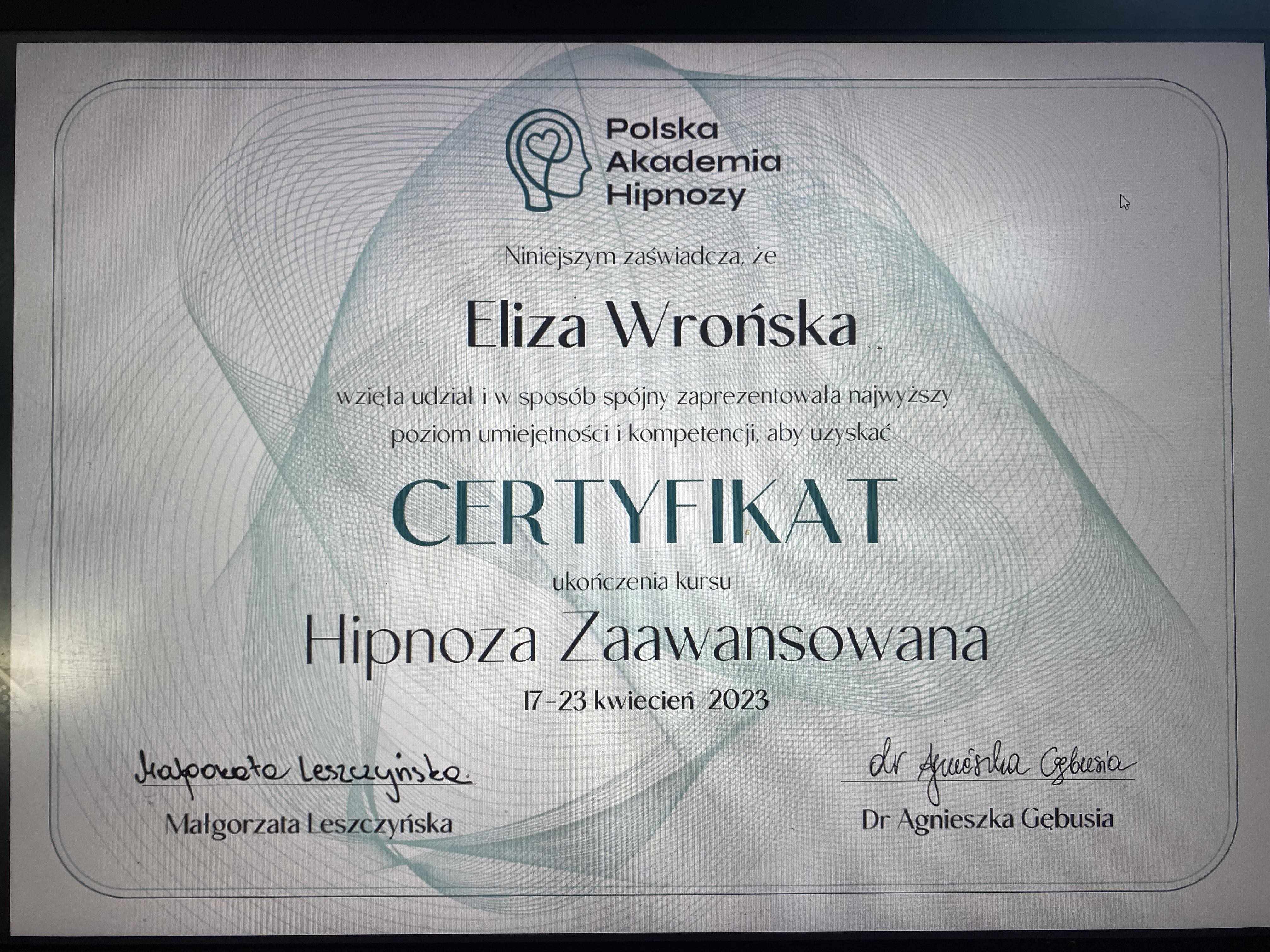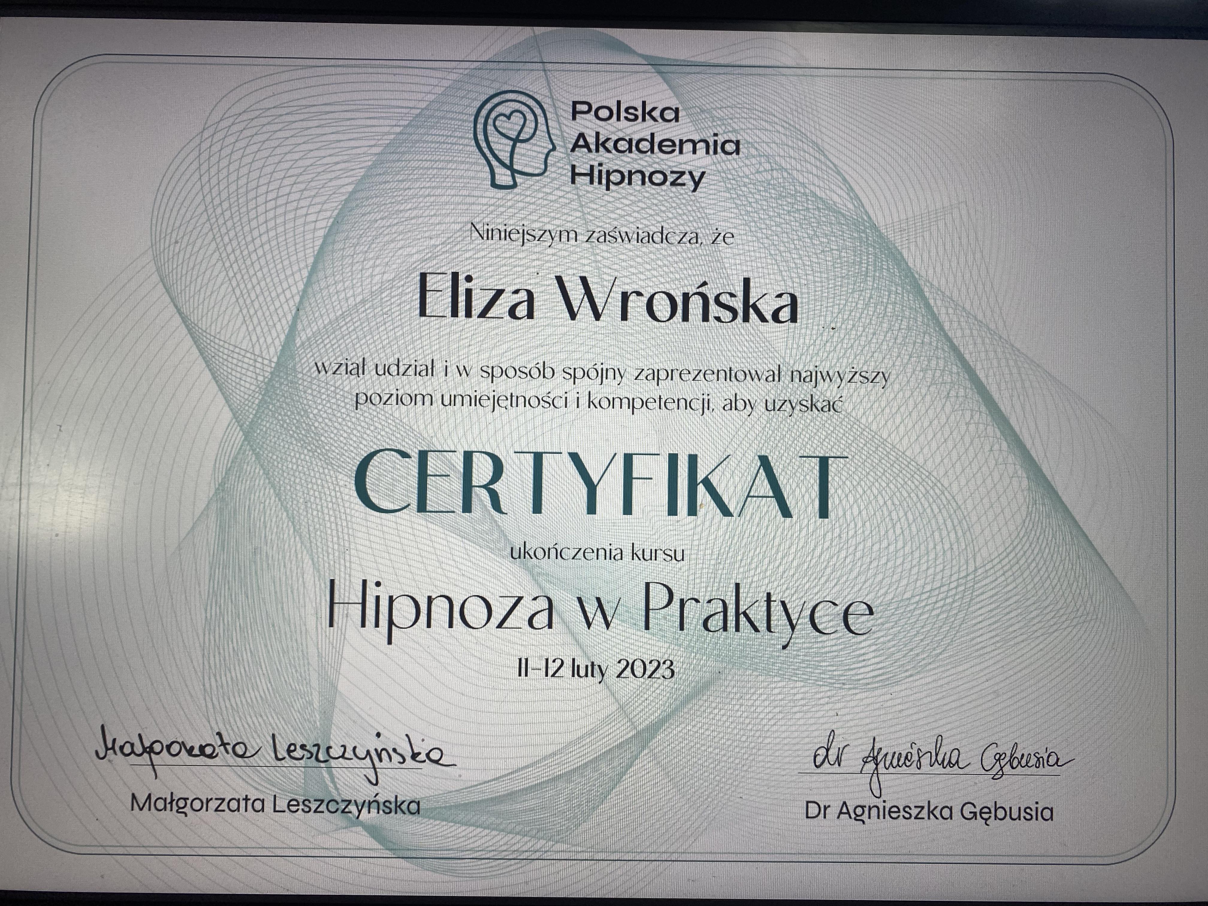 Jestem certyfikowaną hipnoterapeutką i należę do Polskiej Akademii Hipnozy.