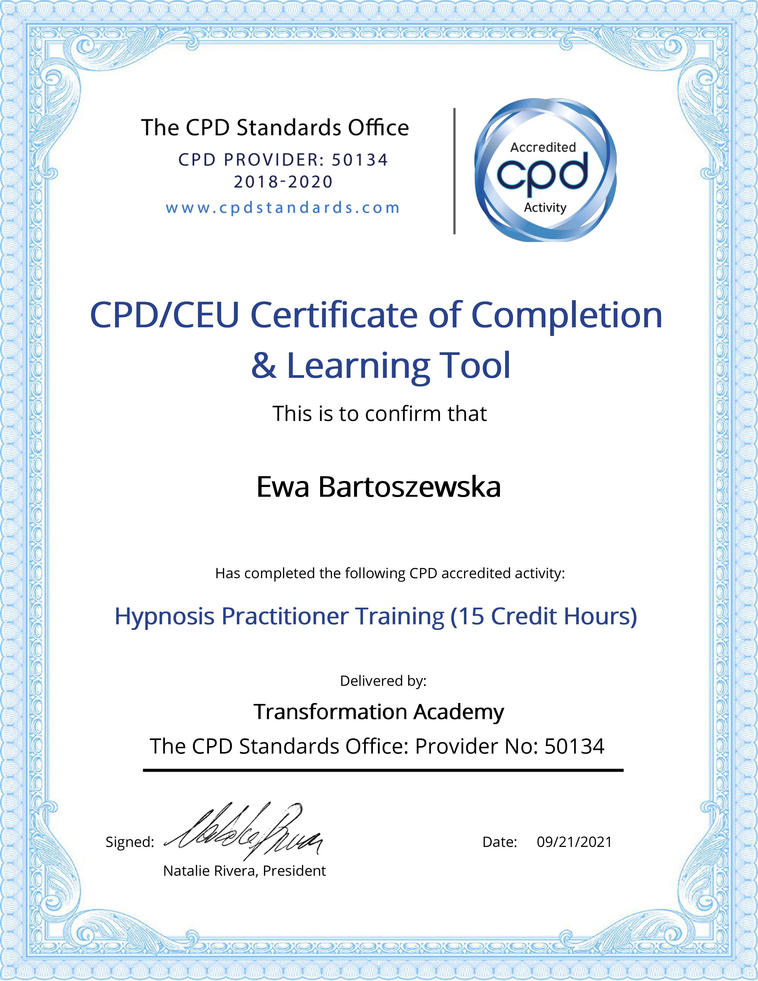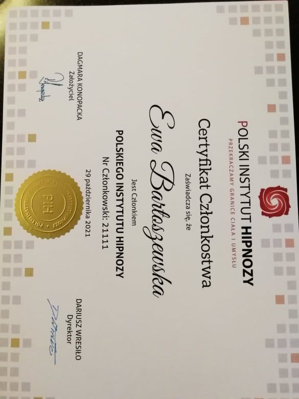 Jestem certyfikowaną hipnoterapeutką, członkinią Polskiego Instytutu Hipnozy. Praktykuję zarówno hipnozę transpersonalną - w holistycznym podejściu: ciało, umysł, dusza; jak i hipnozę ericksonowską - nastawioną na uczenie się poprzez wykorzystanie naszych zasobów ukrytych w nieświadomości.