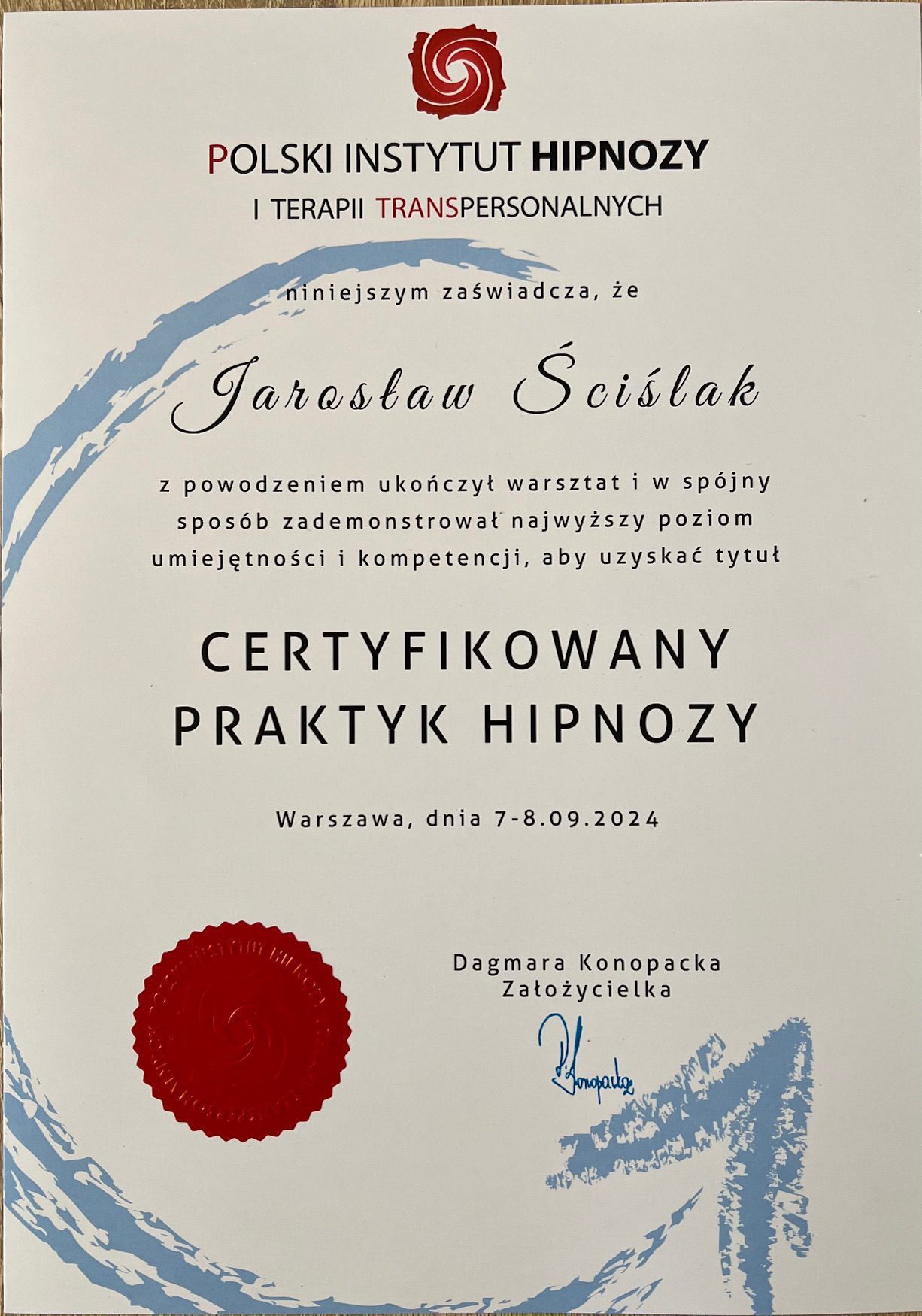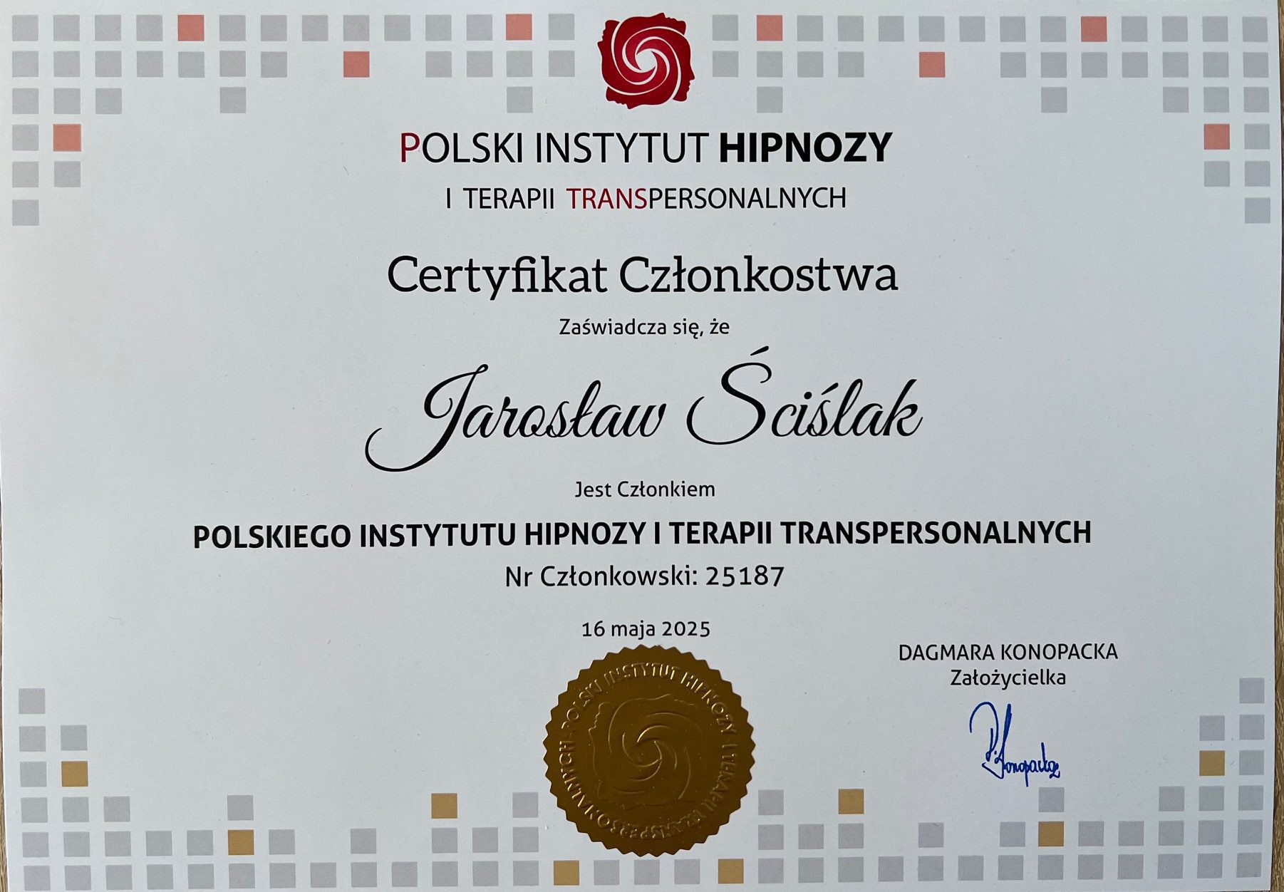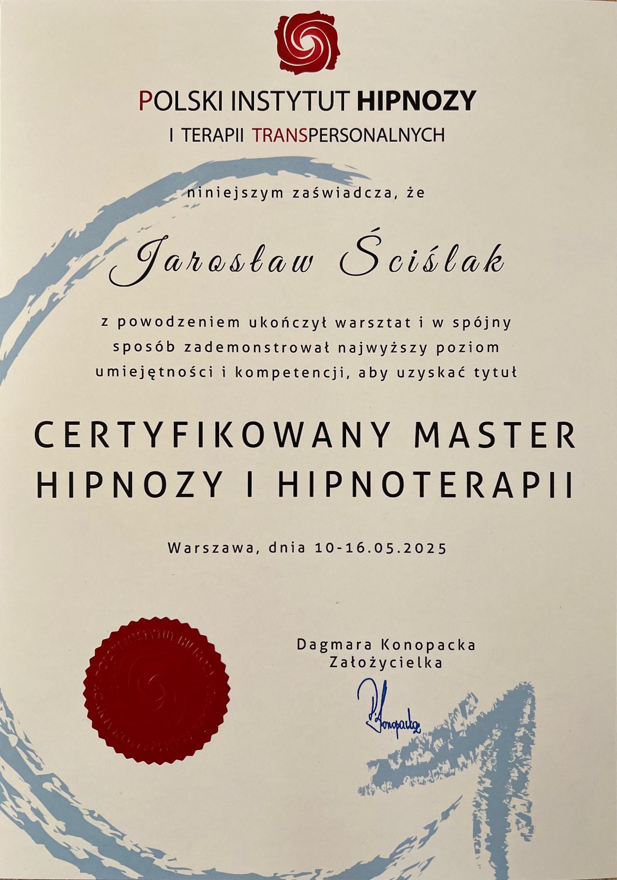- Certyfikowany hipnoterapeuta metodą terapii transpersonalnej