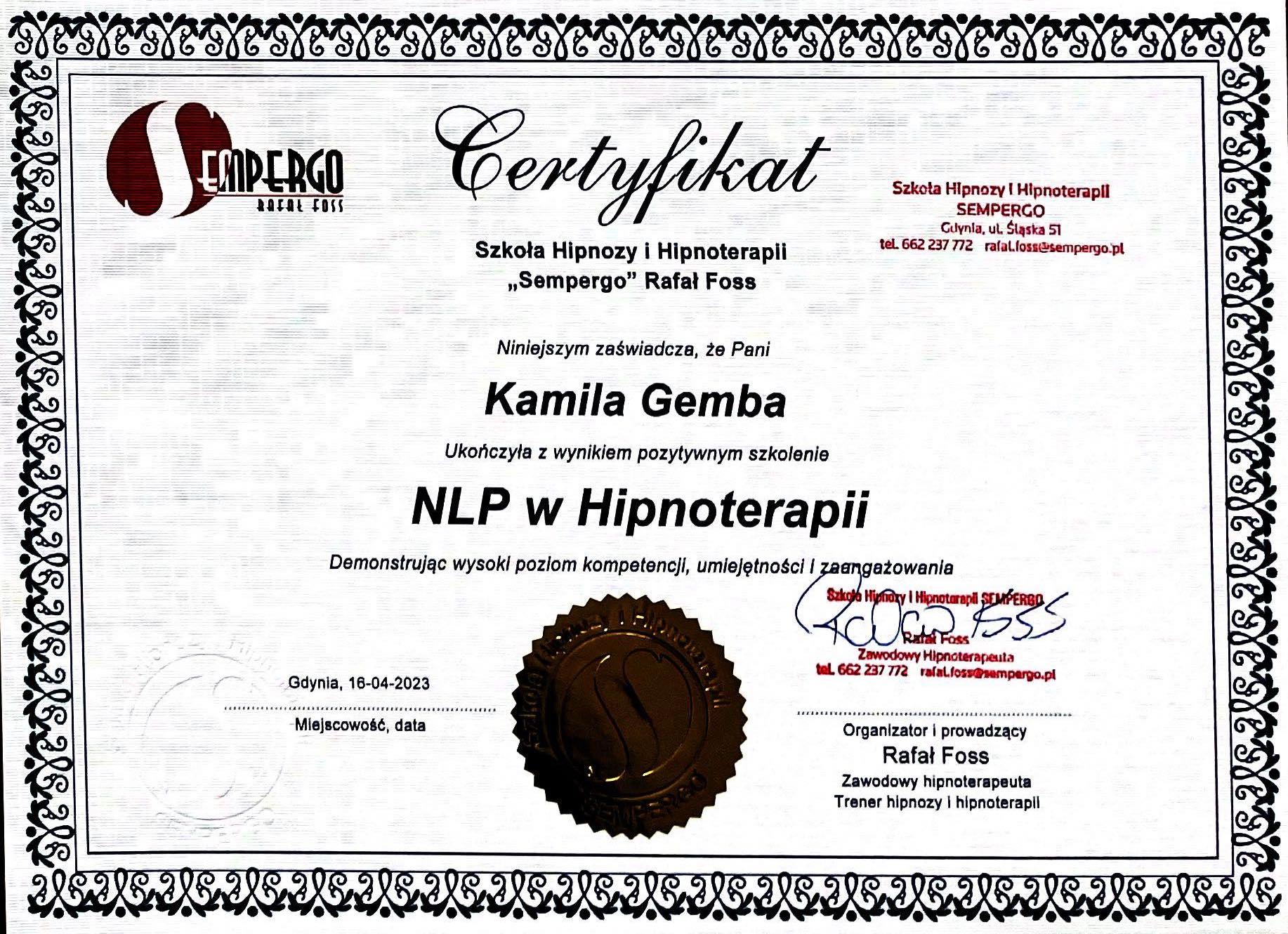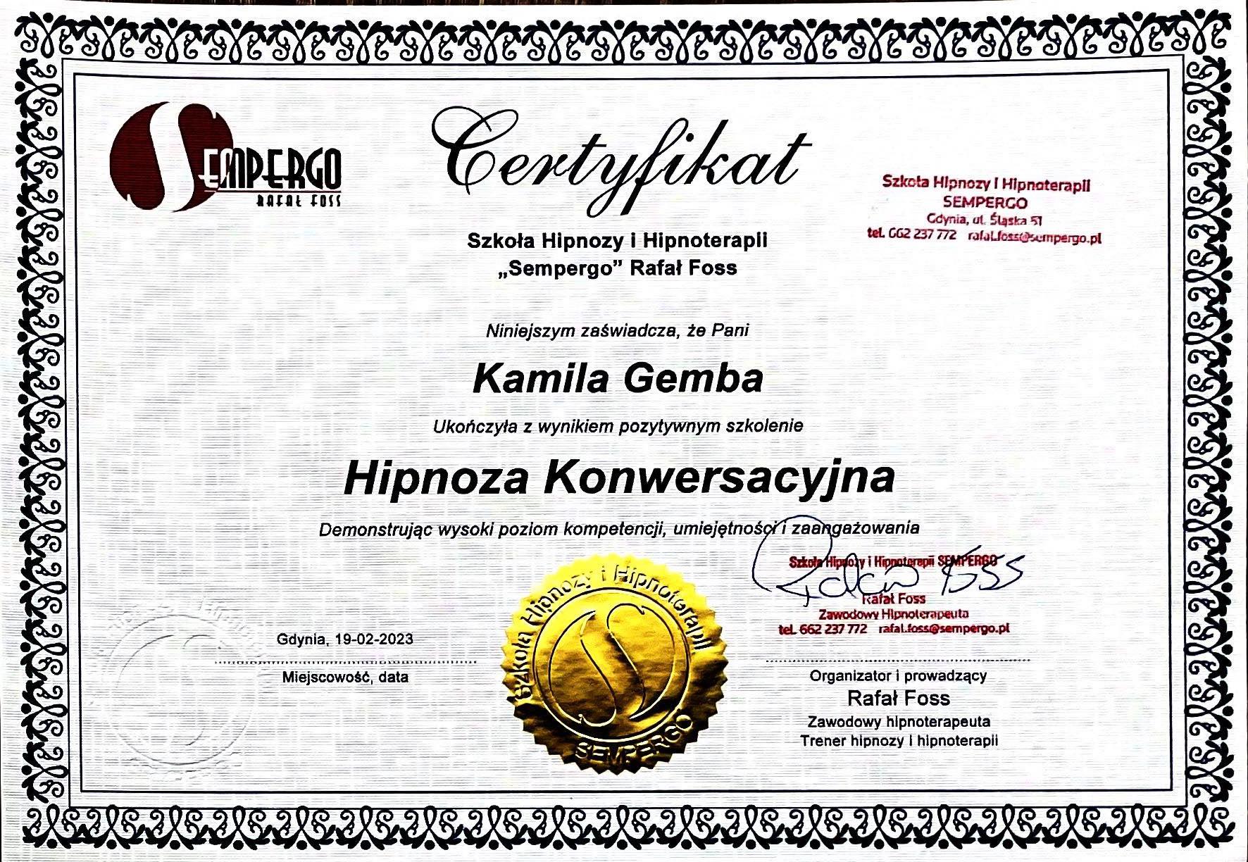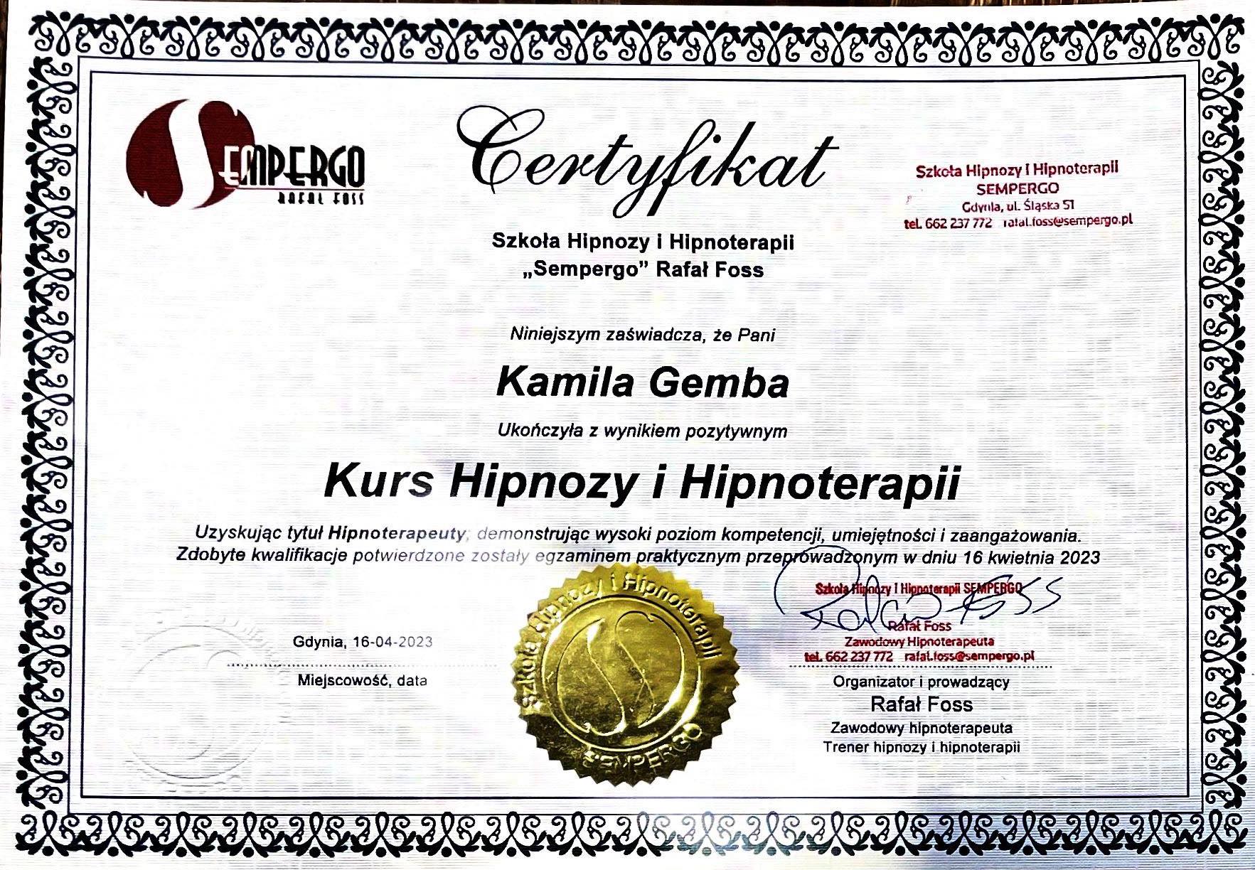 Hej! Nazywam się Kamila. Dzięki hipnoterapii uwolniłam się od niekontrolowanego jedzenia słodyczy oraz odcinania się emocjonalnego w sytuacjach problemowych. Dodatkowo hipnoza sprawiła, że odzyskałam poczucie bycia bliżej siebie. Nauczyłam się słuchać głosu swojej intuicji, zaczęłam być wyrozumiałą, życzliwą i kochającą dla samej siebie. Widząc jaką moc niesie hipnoterapia i jak dużo jej zawdzięczam postanowiłam nieść pomoc dalej. Ukończyłam kursy i szkolenia certyfikujące z hipnoterapii, hipnozy konwersacyjnej, NLP w hipnoterapii oraz trenera autohipnozy. Ukończyłam kurs pierwszego stopnia TSR, czyli terapii skoncentrowanej na rozwiązaniach, która stanowi jedną z metod mojej pracy. TSR polega na skupieniu uwagi na przyszłości klienta i poszukiwaniu rozwiązań. Dodatkowo ukończyłam kurs technik konstruowania wizji preferowanej przyszłości również w zakresie TSR. Posiadam 5-letnie wykształcenie pedagogiczne, które pomaga mi zrozumieć i wspierać klientów w ich rozwoju i przechodzeniu przez zmianę. Dla wzmocnienia efektów podczas hipnozy łącze metody, aby pomóc klientom skupić się na osiągnięciu swoich celów i rozwinięciu ich potencjału.