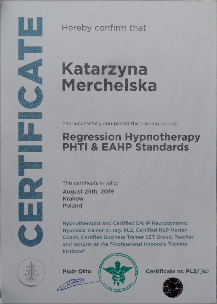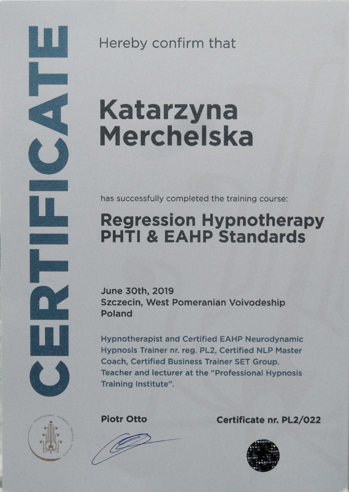 Jestem psychologiem (Dolnośląska Szkoła Wyższa we Wrocławiu), arteterapeutą (Akademia Humanistyczno Ekonomiczna w Łodzi), psychoterapeutą w trakcie certyfikacji (Wrocławski Instytut Psychoterapii, psychoterapia systemowa i ericksonowska), ale także nauczycielem ze specjalizacją trenerską (Akademia Wychowania Fizycznego we Wrocławiu). Ukończyłam także roczny Podstawowy Kurs Psychoterapii Ericksonowskiej „Szlifowanie diamentu” oraz Podstawy Terapii Krótkoterminowej Skoncentrowanej na Rozwiązaniu we Wrocławskim Instytucie Psychoterapii. Oprócz tego jestem masażystą (masaż sportowy i rekreacyjny). Hipnoza, hipnoterapia fascynuje mnie ze względu na głębię doznań i skuteczność.