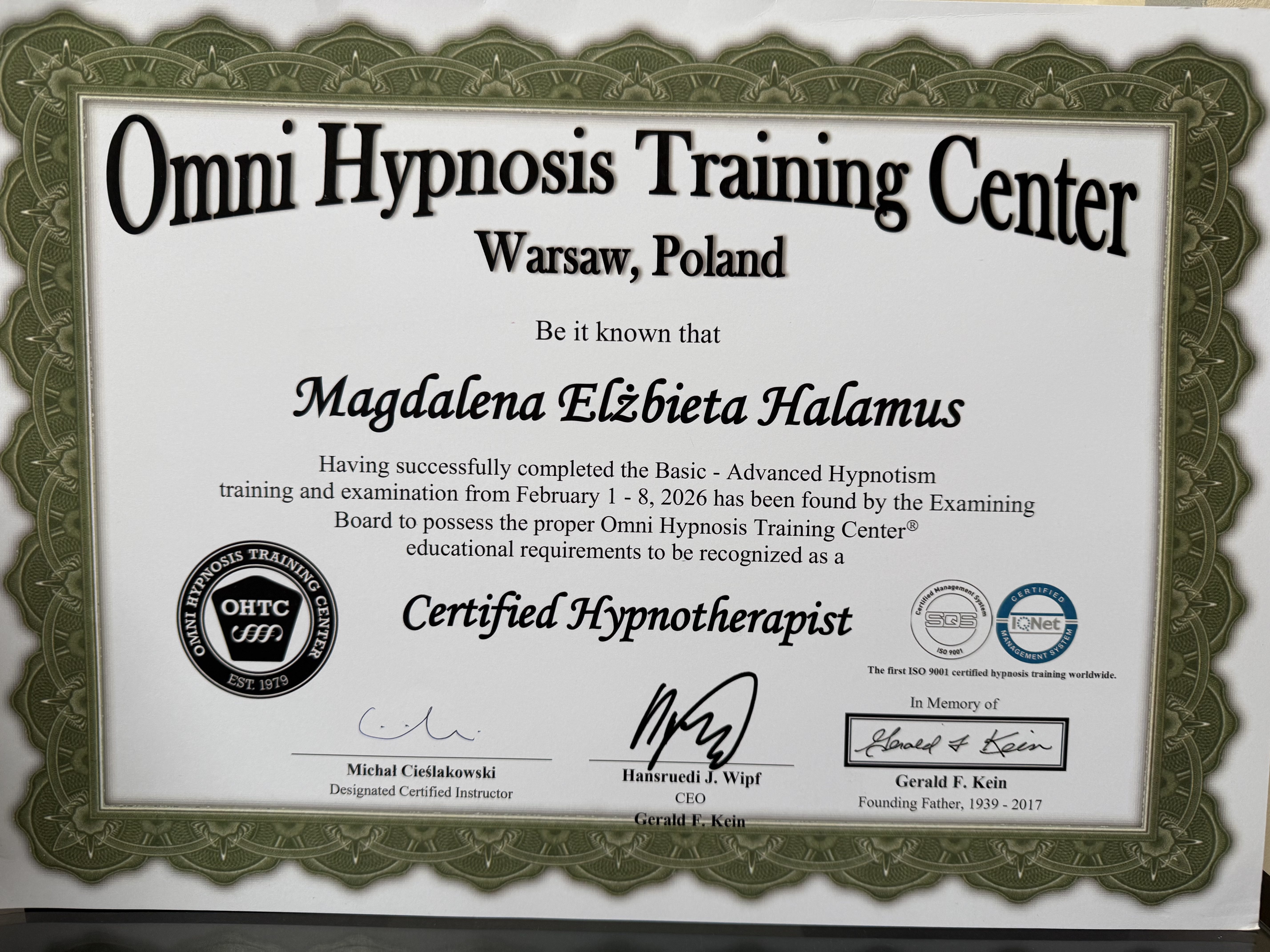 Ukończyłam OMNI Hypnosis Training Center – jedną z najstarszych i najbardziej renomowanych szkół hipnoterapii na świecie, działającą w oparciu o międzynarodowe standardy jakości i certyfikację ISO. Szkolenie to dało mi solidne podstawy do pracy z podświadomością w sposób bezpieczny, uporządkowany i skuteczny.
