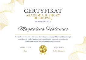 Dodatkowo ukończyłam kurs w Akademii Hipnoterapii Duchowej, gdzie pracowałam w nurcie hipnoterapii transpersonalnej, obejmującym regresję, zapisy energetyczne oraz transformację emocji. Hipnoterapia transpersonalna to podejście holistyczne, które uwzględnia pełnię ludzkiego doświadczenia – świadomość, podświadomość i nadświadomość. Wierzę, że prawdziwa zmiana zachodzi wtedy, gdy dotykamy zarówno aspektów mentalnych, jak i duchowych.