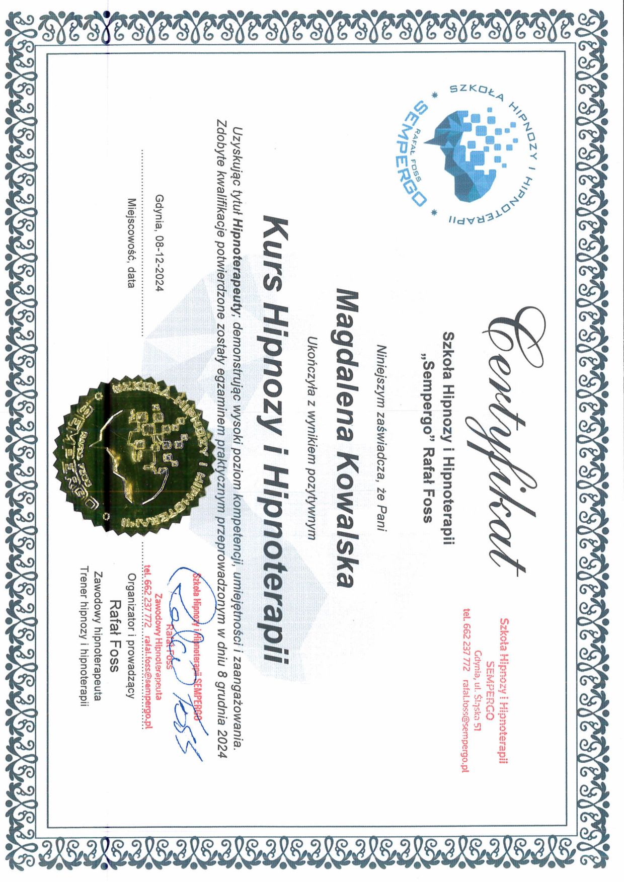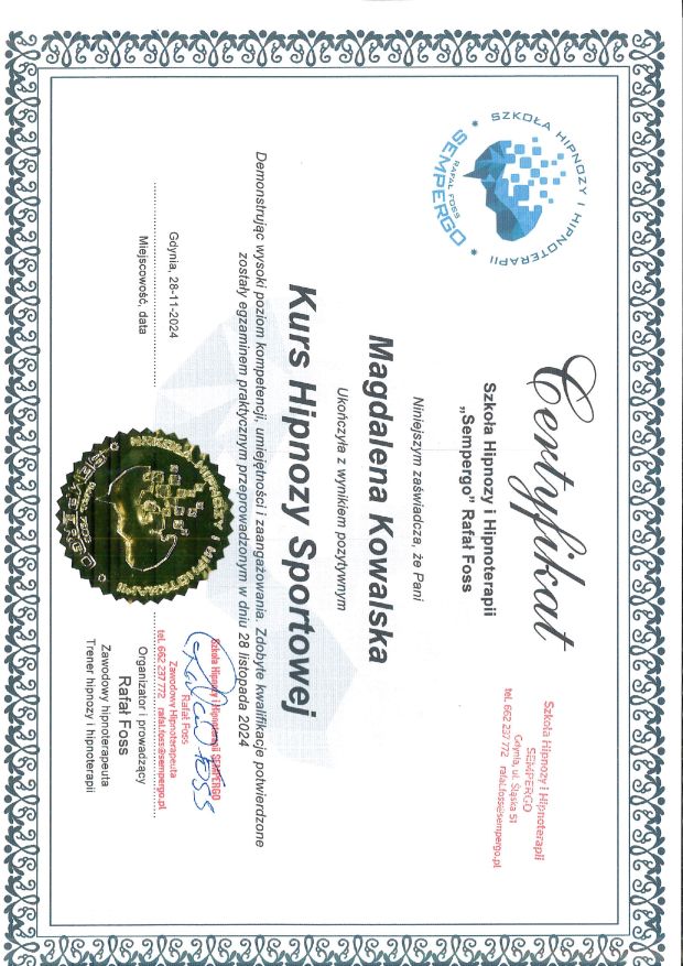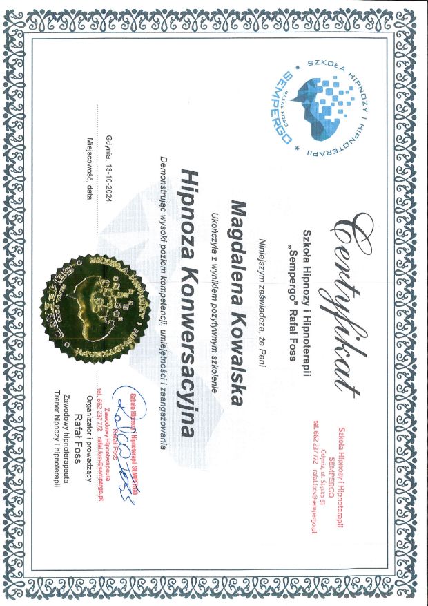 Obecnie poszerzam swoją wiedzę, kończąc kurs psychobiologii – podejścia, które łączy ciało, umysł i emocje, ukazując, jak nasze doświadczenia życiowe wpływają na zdrowie i samopoczucie. Dzięki temu jeszcze głębiej rozumiem, skąd biorą się różne dolegliwości i jak poprzez pracę z podświadomością możemy dotrzeć do ich pierwotnych przyczyn. W mojej pracy coraz częściej integruję wiedzę z zakresu psychobiologii z hipnoterapią, co pozwala mi towarzyszyć klientom w jeszcze bardziej holistyczny i skuteczny sposób.