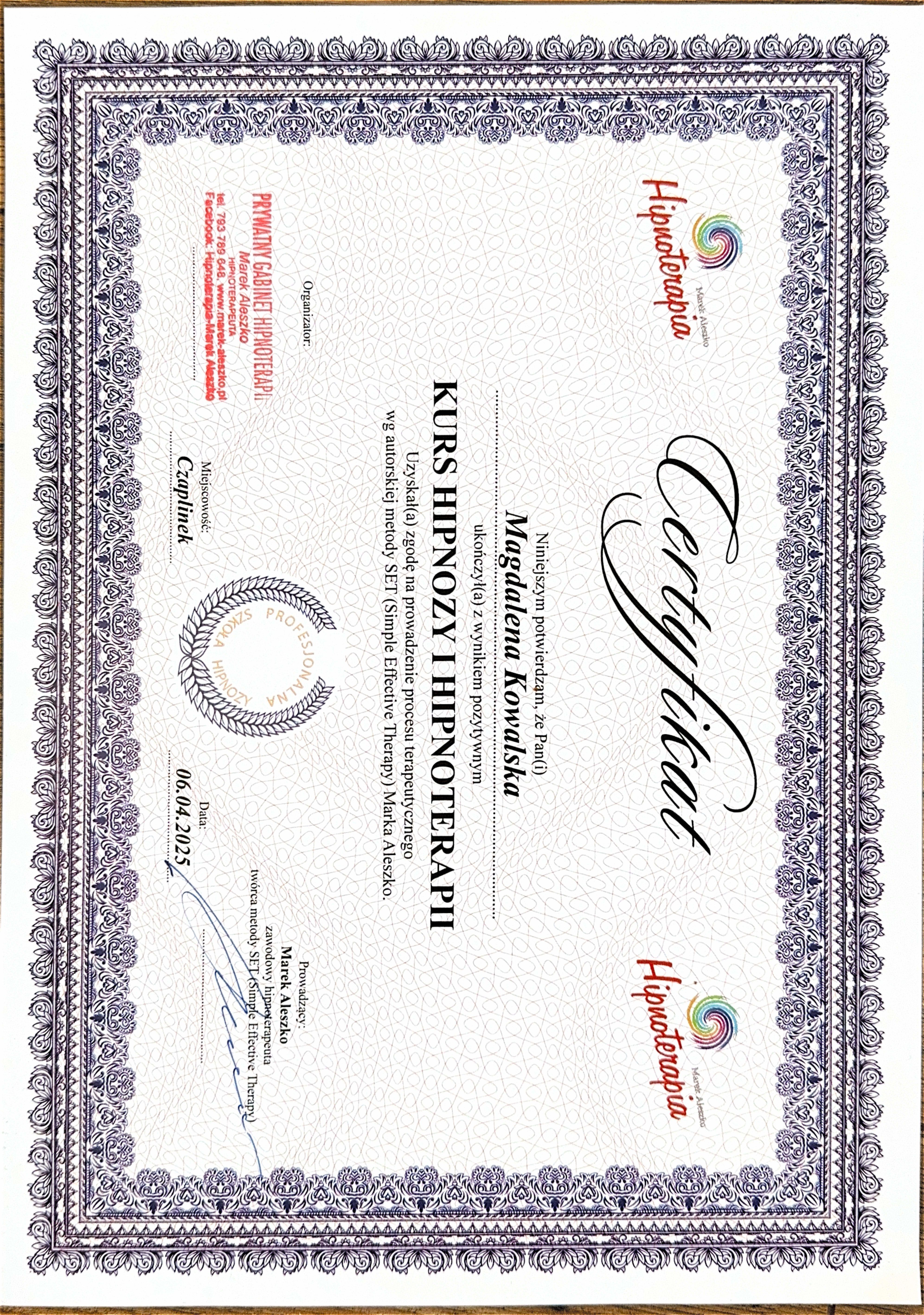 Jestem również certyfikowaną hipnoterapeutką metody SET (Simple Effective Therapy) – nowatorskiej, bezpiecznej i wyjątkowo skutecznej formy terapii, która pomaga odzyskać wewnętrzną harmonię oraz równowagę emocjonalną w krótkim czasie. Metoda ta nie wymaga głębokiej ingerencji w Twoje osobiste historie ani roztrząsania dawnych przeżyć. Pracuję wyłącznie z uczuciami, emocjami i wyobrażeniami, bez konieczności długich zwierzeń czy szczegółowej analizy bolesnych wspomnień.