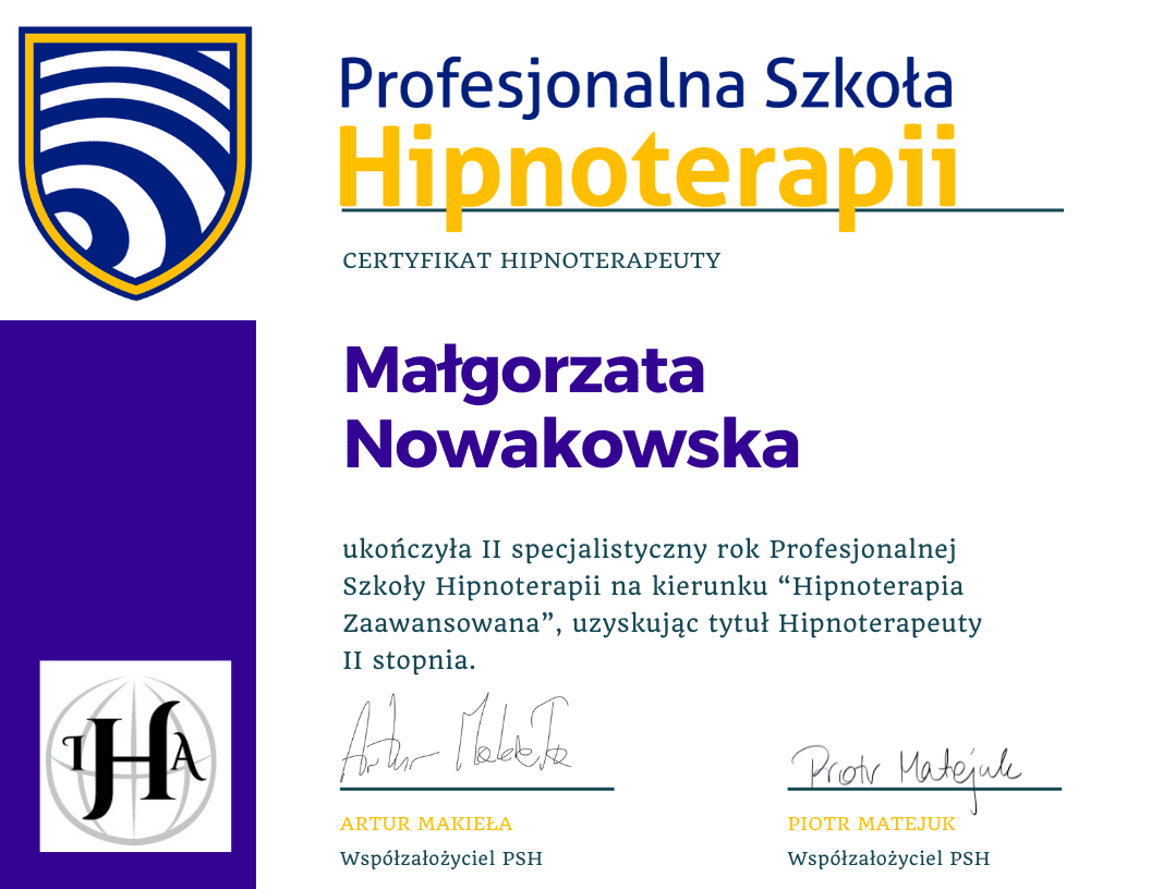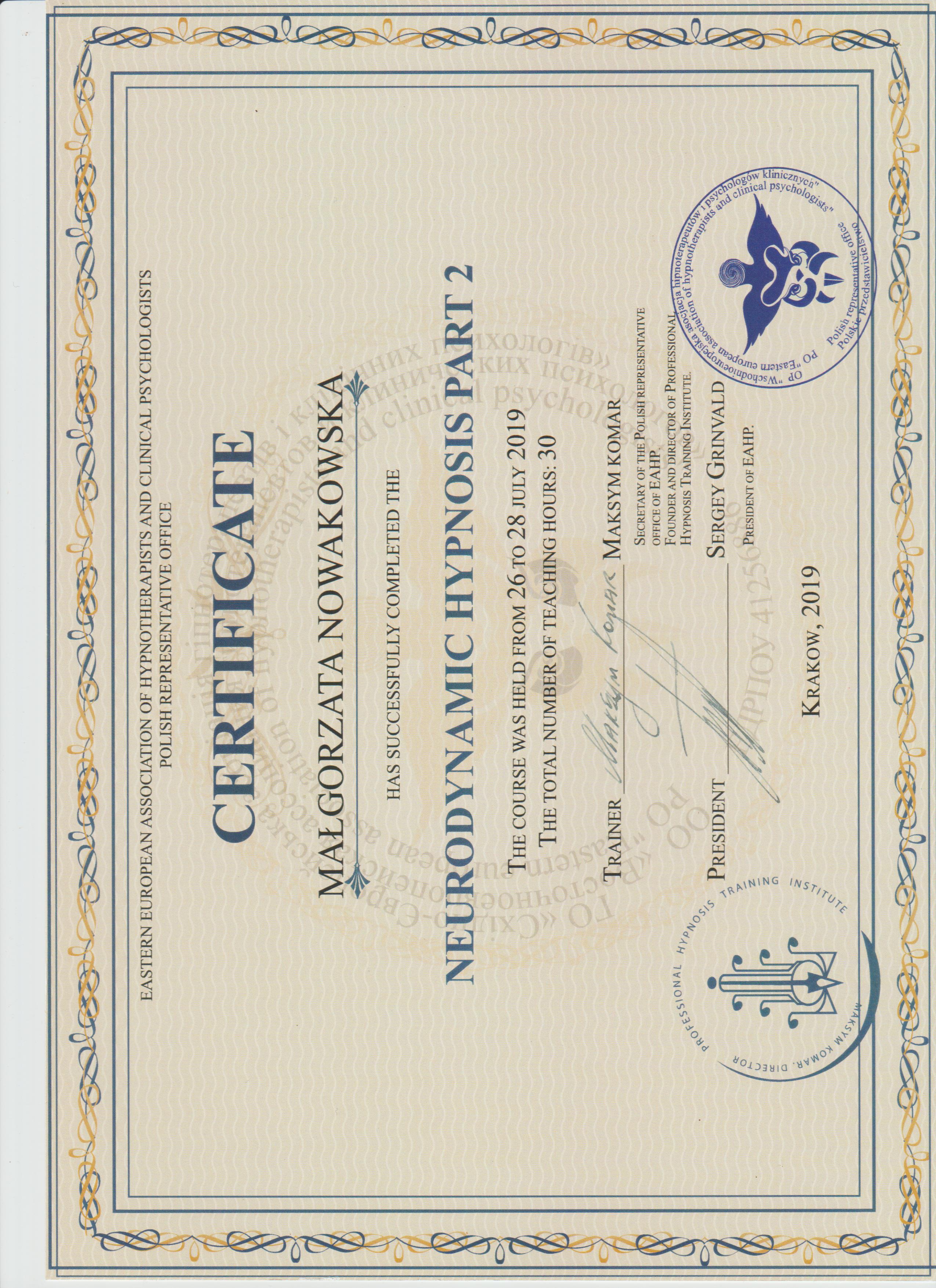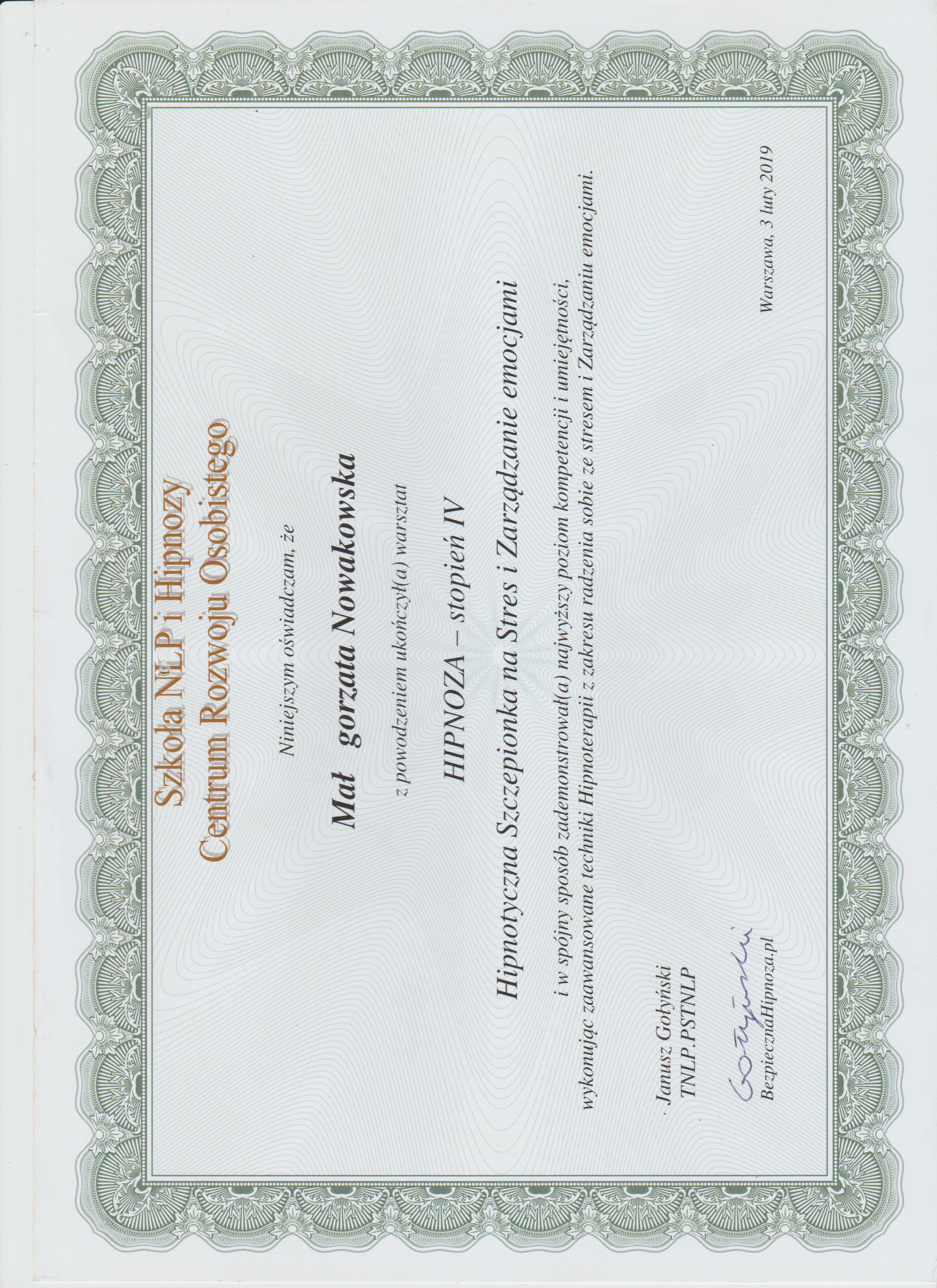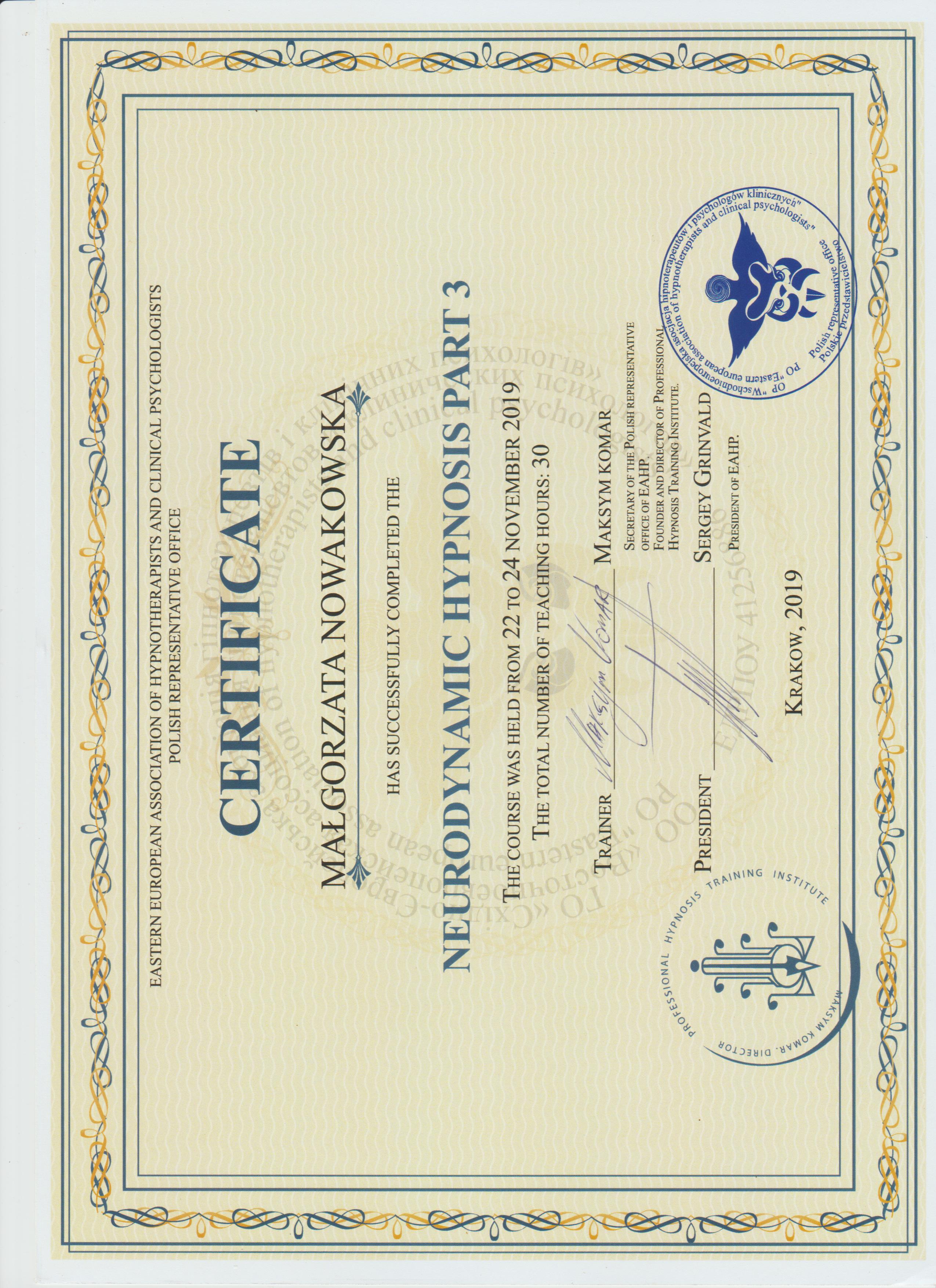 "W moim gabinecie świadczę usługi hipnozy i hipnoterapii. Poprzez profesjonalne podejście wykorzystuję narzędzia hipnoterapeutyczne aby pomóc Ci osiągnąć Twoje cele. Stosuje spersonalizowane sesje, które pomagają w radzeniu sobie ze stresem, lękami, uzależnieniami i innymi wyzwaniami życiowymi Pomogę Ci odkryć potencjał zmiany i osiągnięcia życiowej równowagi. Poczujesz wsparcie w Twoich procesach. Zapraszam do kontaktu i umówienia się na sesję, która może być kluczem do pozytywnych zmian w Twoim życiu. Certyfikowana hipnoterapeutka oraz zrzeszona m.in.EASTERN EUROPEAN ASSOCIATION OF HYPNOTHERAPIST AND CLINICAN PSYCHOLOGISTS POLISH REPRESENTATIVE OFFIS PRACTITIONER OF NEURO-LINGUISTIC PROGRAMING TRAINING INSTITUTE OF CHICAGO"