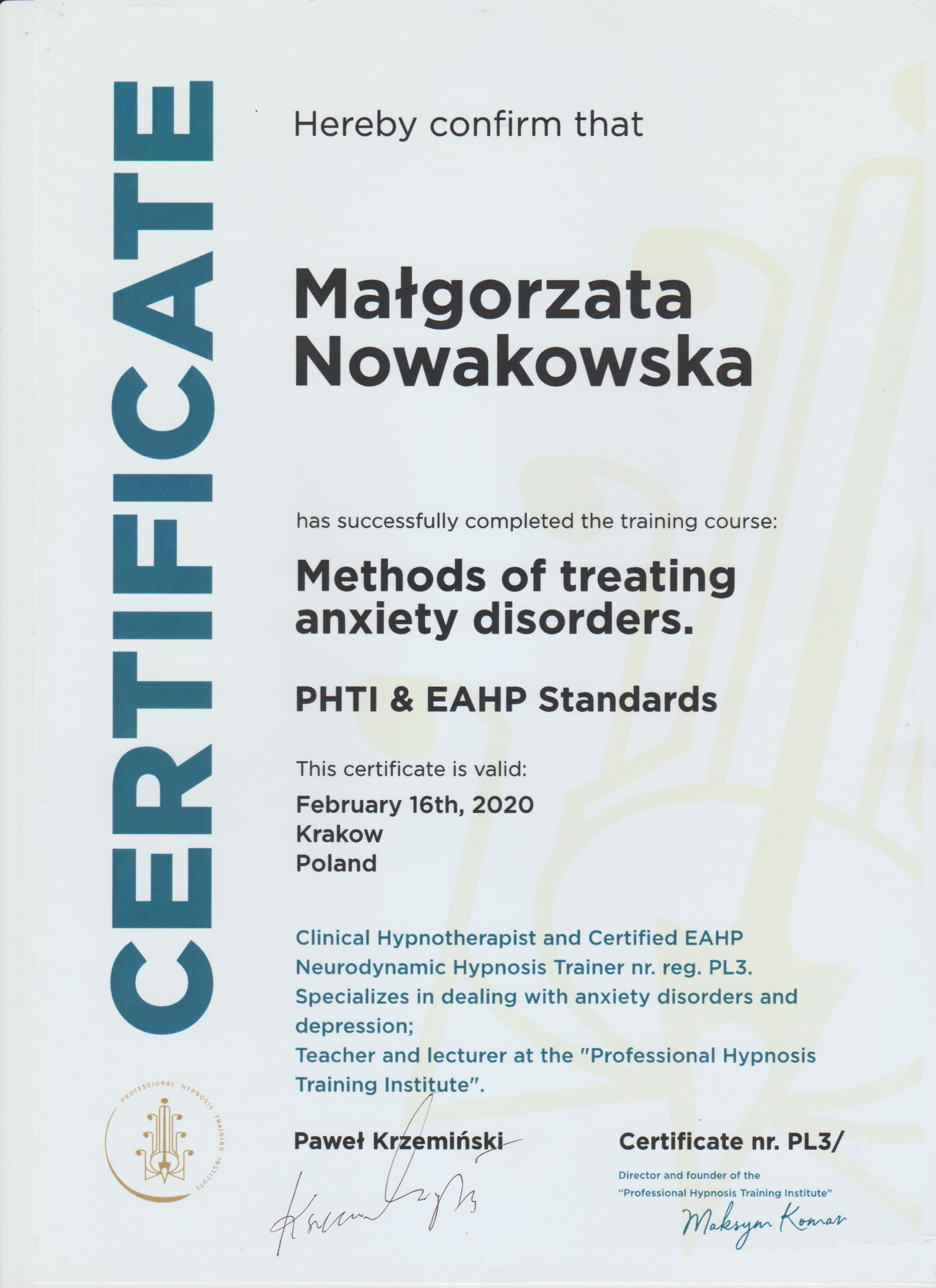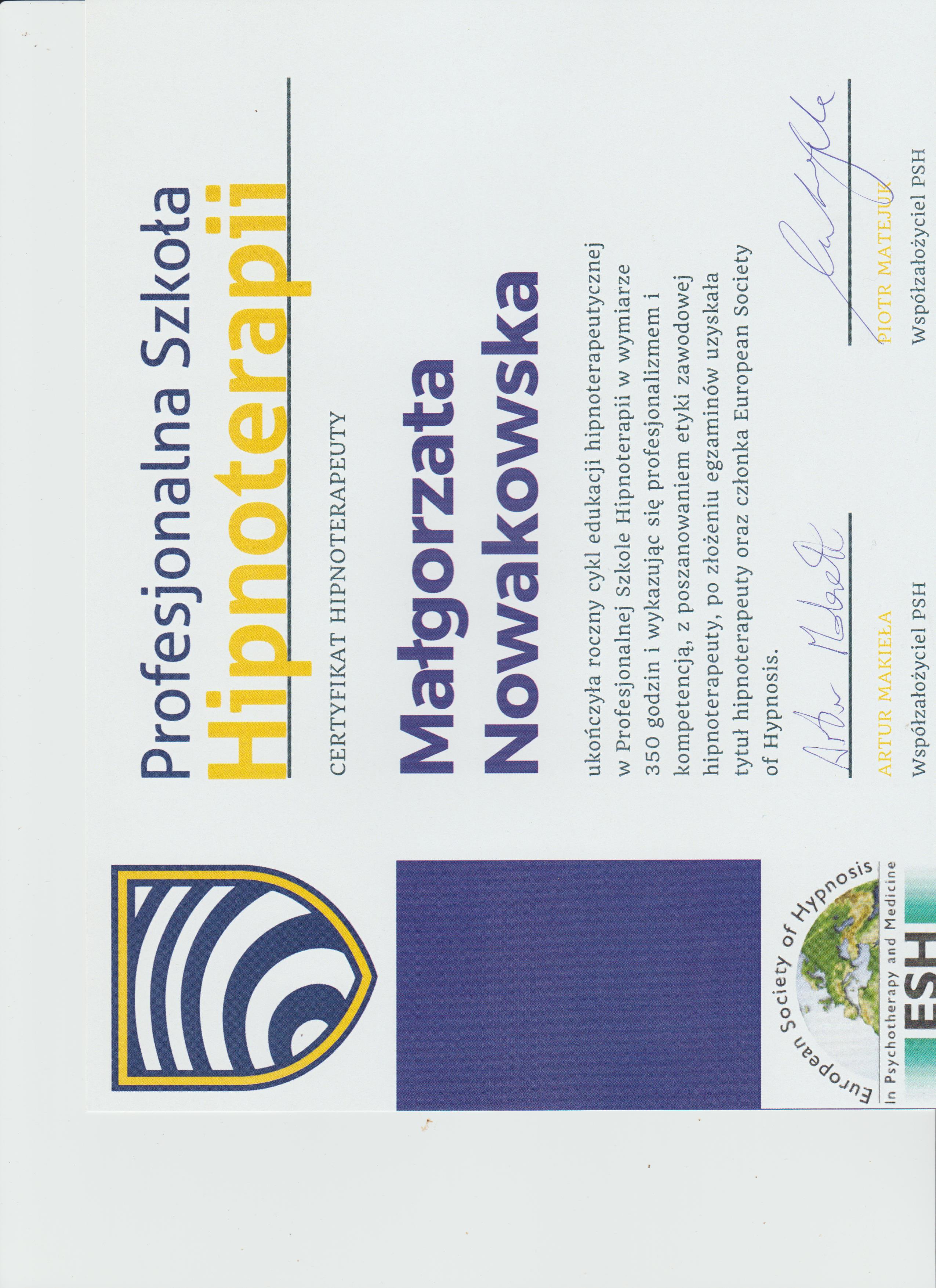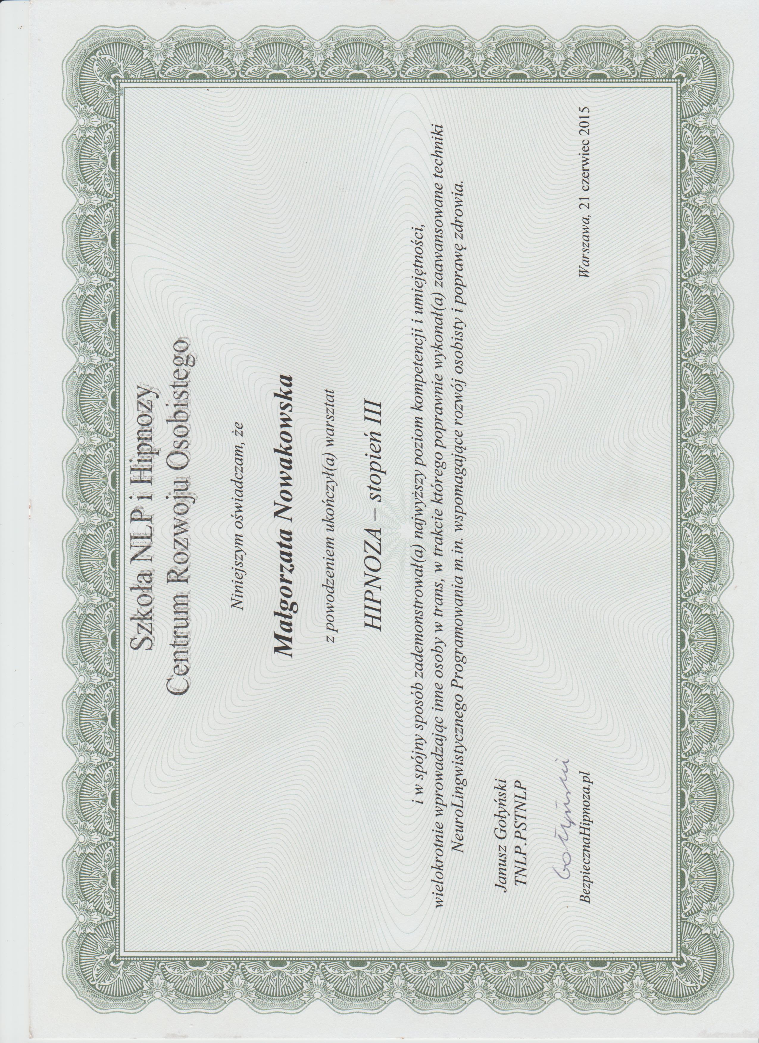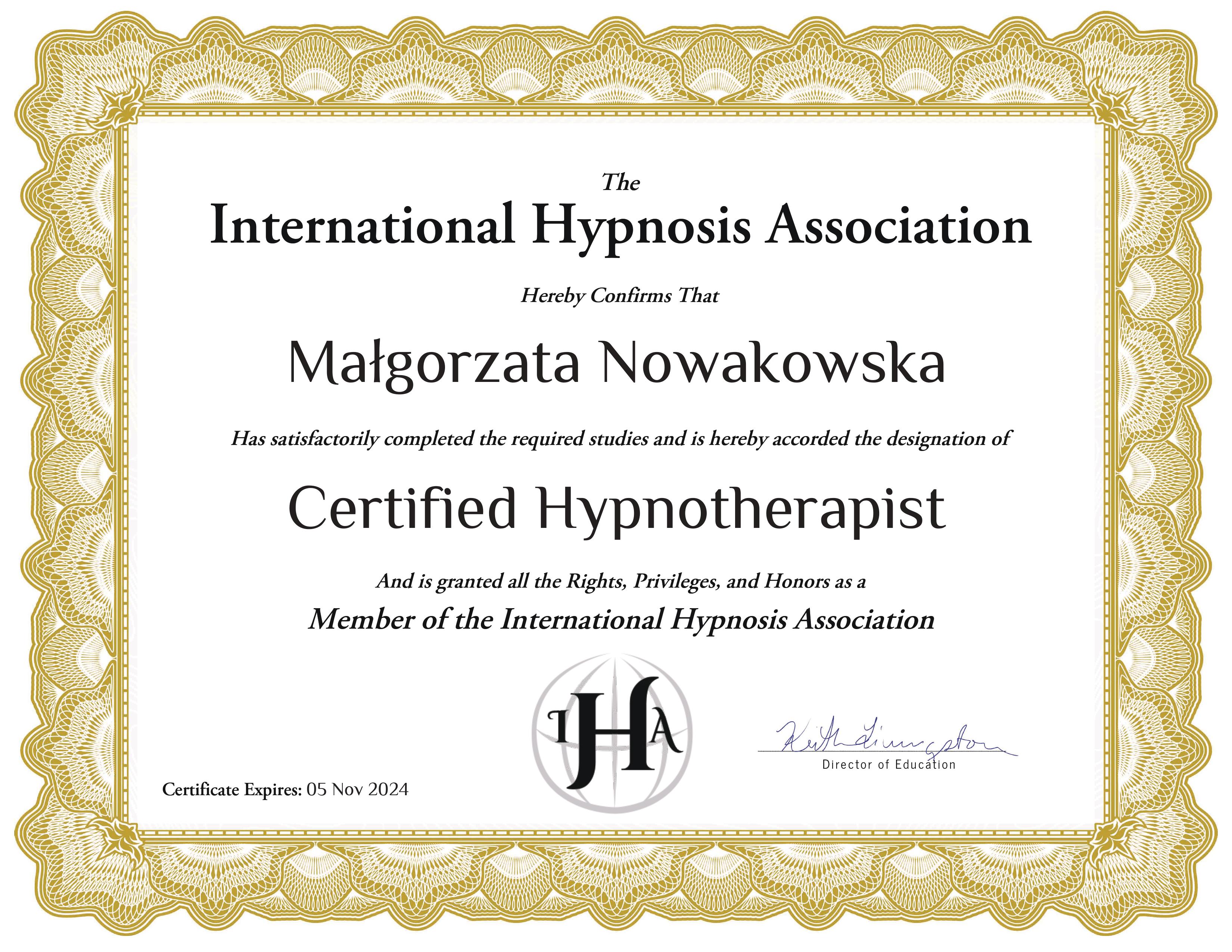 "W moim gabinecie świadczę usługi hipnozy i hipnoterapii. Poprzez profesjonalne podejście wykorzystuję narzędzia hipnoterapeutyczne aby pomóc Ci osiągnąć Twoje cele. Stosuje spersonalizowane sesje, które pomagają w radzeniu sobie ze stresem, lękami, uzależnieniami i innymi wyzwaniami życiowymi Pomogę Ci odkryć potencjał zmiany i osiągnięcia życiowej równowagi. Poczujesz wsparcie w Twoich procesach. Zapraszam do kontaktu i umówienia się na sesję, która może być kluczem do pozytywnych zmian w Twoim życiu. Certyfikowana hipnoterapeutka oraz zrzeszona m.in.EASTERN EUROPEAN ASSOCIATION OF HYPNOTHERAPIST AND CLINICAN PSYCHOLOGISTS POLISH REPRESENTATIVE OFFIS PRACTITIONER OF NEURO-LINGUISTIC PROGRAMING TRAINING INSTITUTE OF CHICAGO"