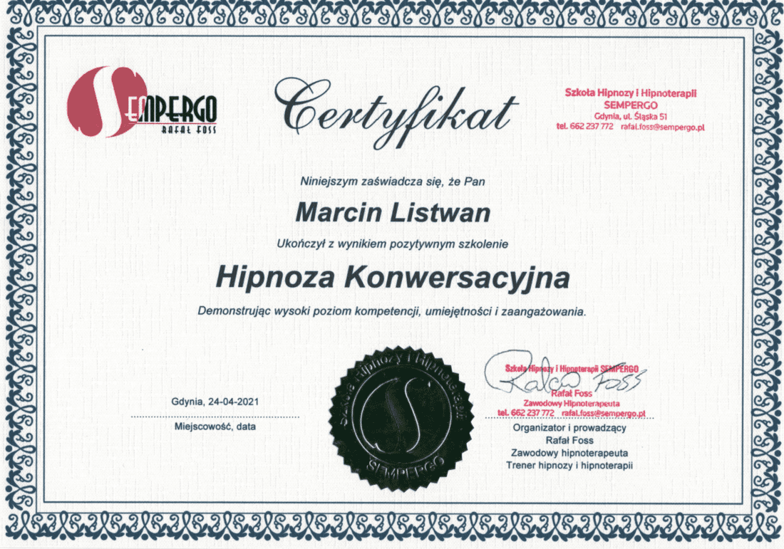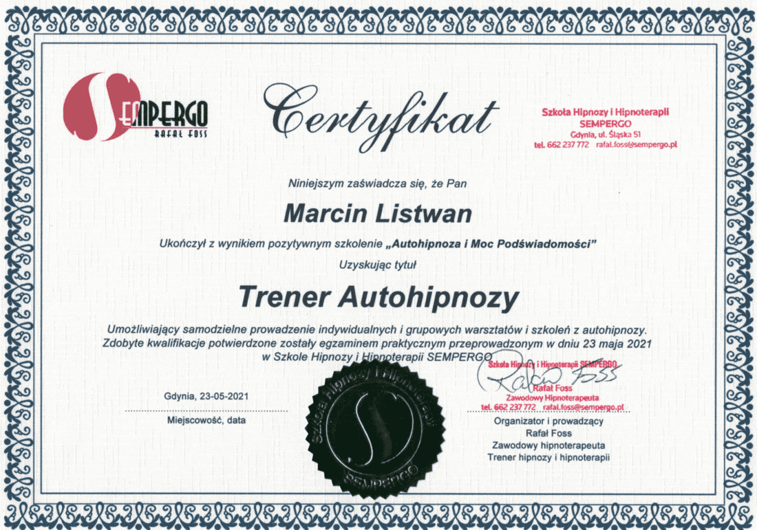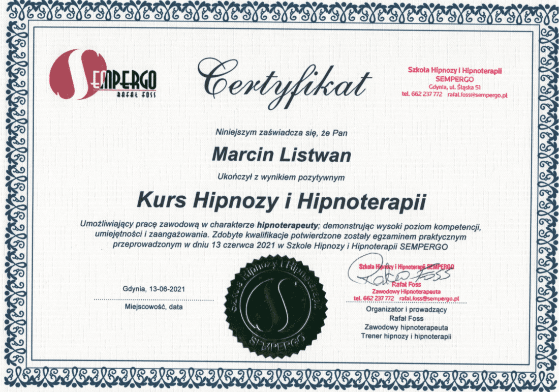Nazywam się Marcin Listwan i jestem certyfikowanym przez Rafała Fossa hipnoterapeutą. We Wrocławiu prowadzę swój własny gabinet do którego Cię serdecznie zapraszam. Zapewniam profesjonalne podejście dla każdego kto zdecyduje się na współpracę. Zachęcam Cię również do odwiedzenia mojej strony internetowej. To tam dowiesz się czy to właśnie hipnoterapia jest skutecznym rozwiązaniem dla Ciebie. Jeśli masz jakieś wątpliwości lub chcesz o coś zapytać to skontaktuj się ze mną już dziś.