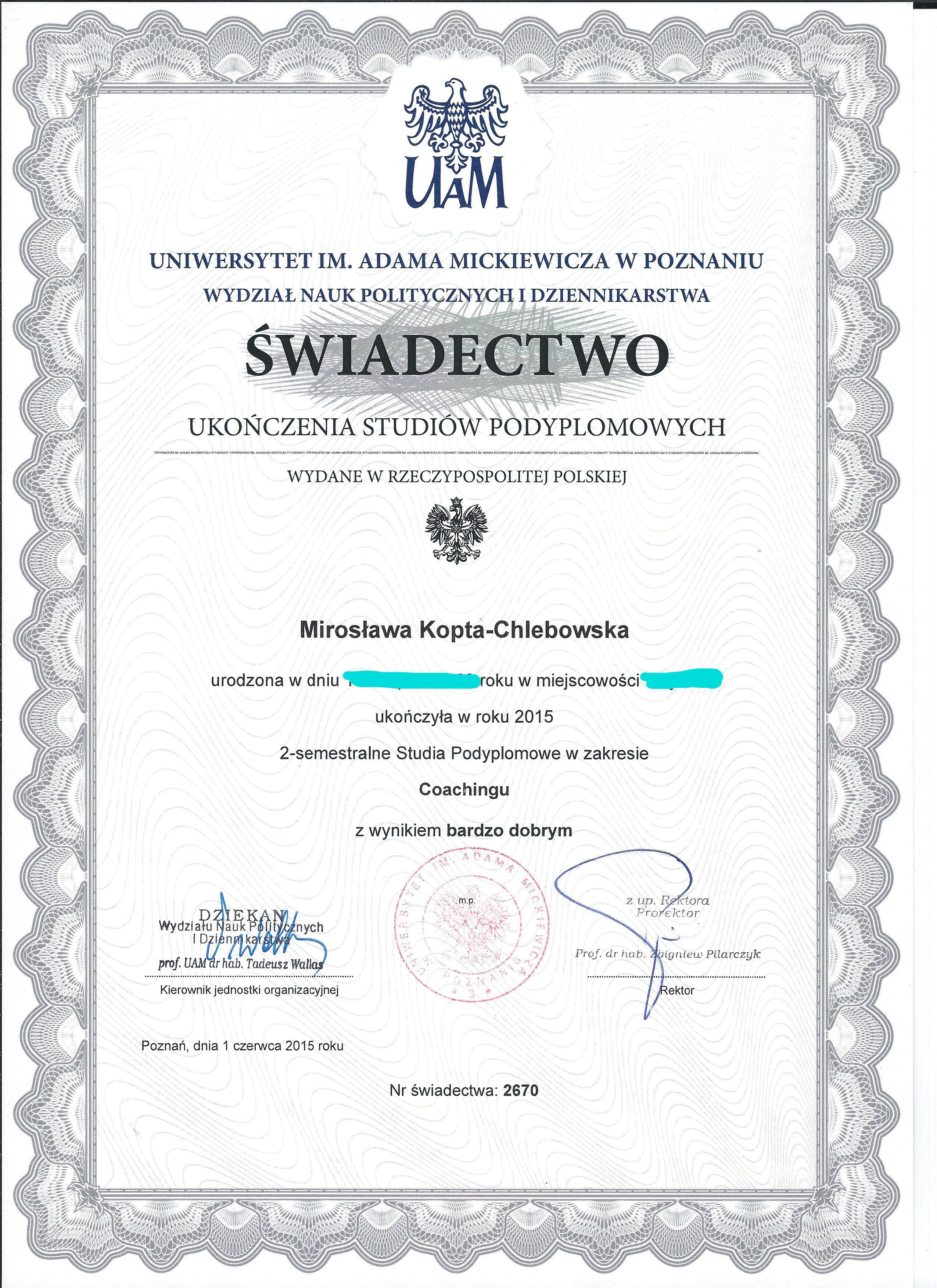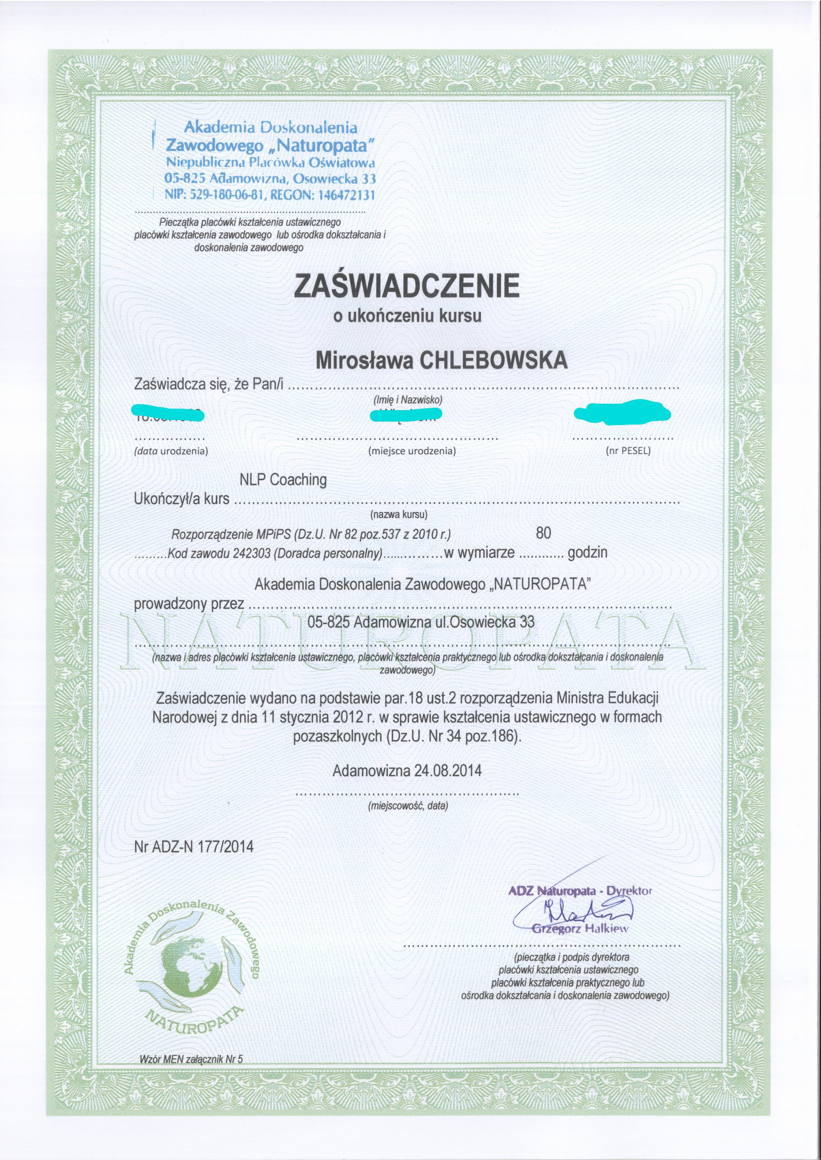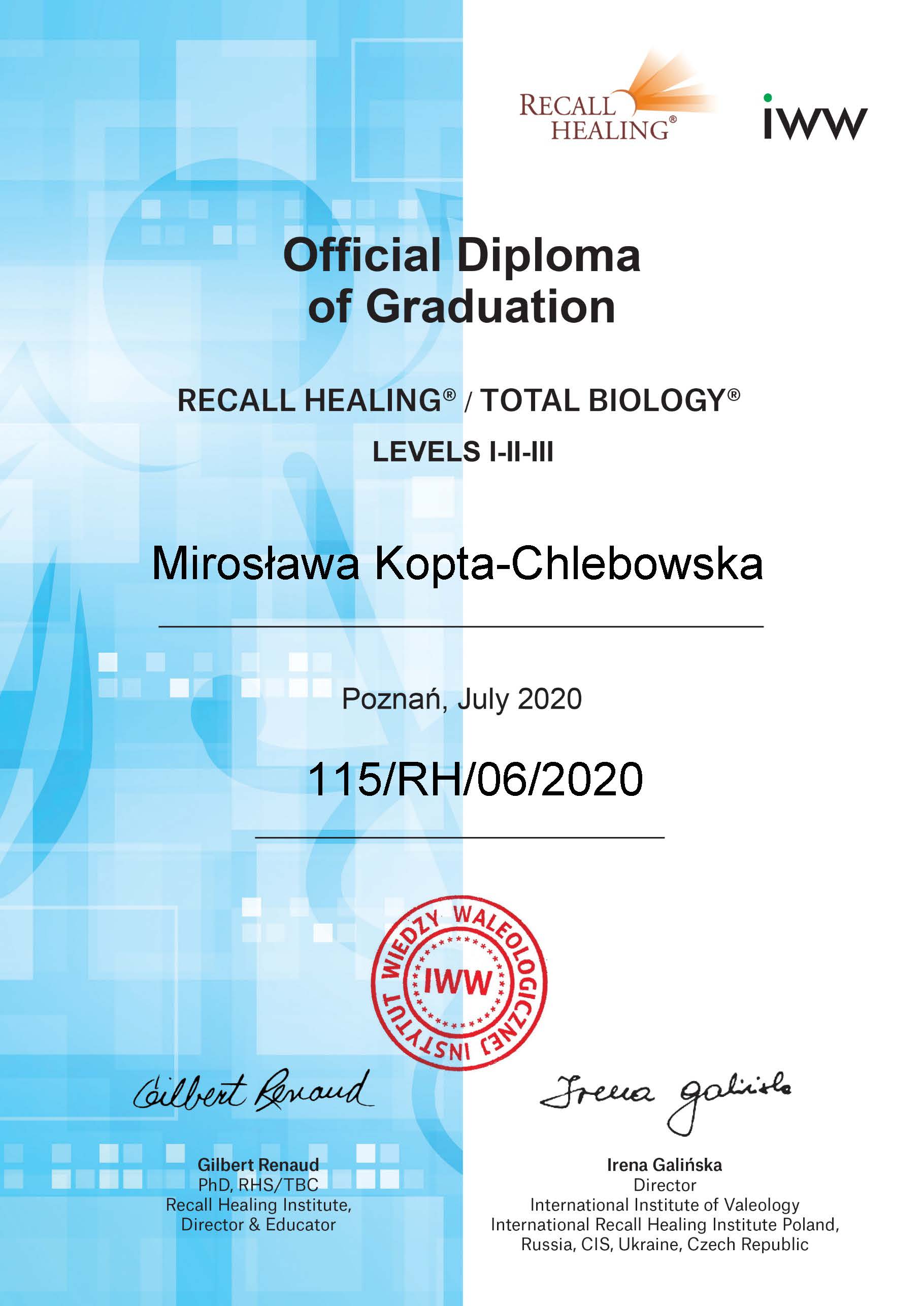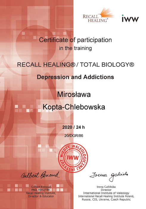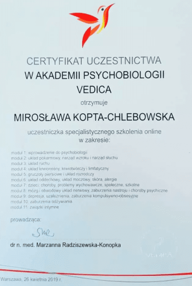 Hipnoterapeutka, psychodietetyk, konsultant Biologii Totalnej. Członkini Cechu Naturopatów i Hipnotyzerów.