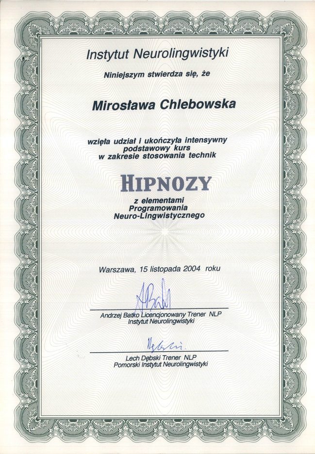 Specjalizuję się od kilkunastu lat w hipnotycznym odchudzaniu - w tej pracy łączę hipnozę z NLP, psychodietetyką oraz, jeśli taka jest potrzeba, Biologią Totalną.