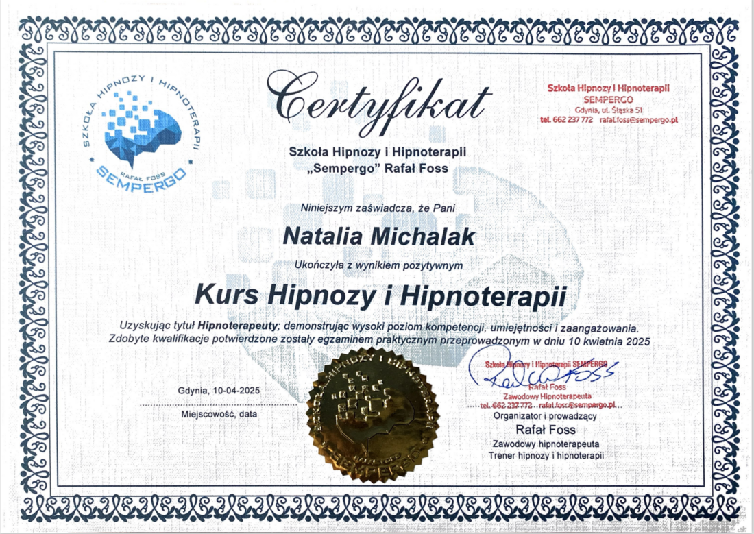 Jestem studentką psychologii oraz traumatologii, a także certyfikowaną hipnoterapeutką. Ukończyłam kursy z zakresu NLP, hipnozy oraz rozwoju osobistego. Stale poszerzam swoją wiedzę i umiejętności, by jeszcze lepiej wspierać moich klientów w procesie uzdrawiania i odzyskiwania wewnętrznej równowagi.