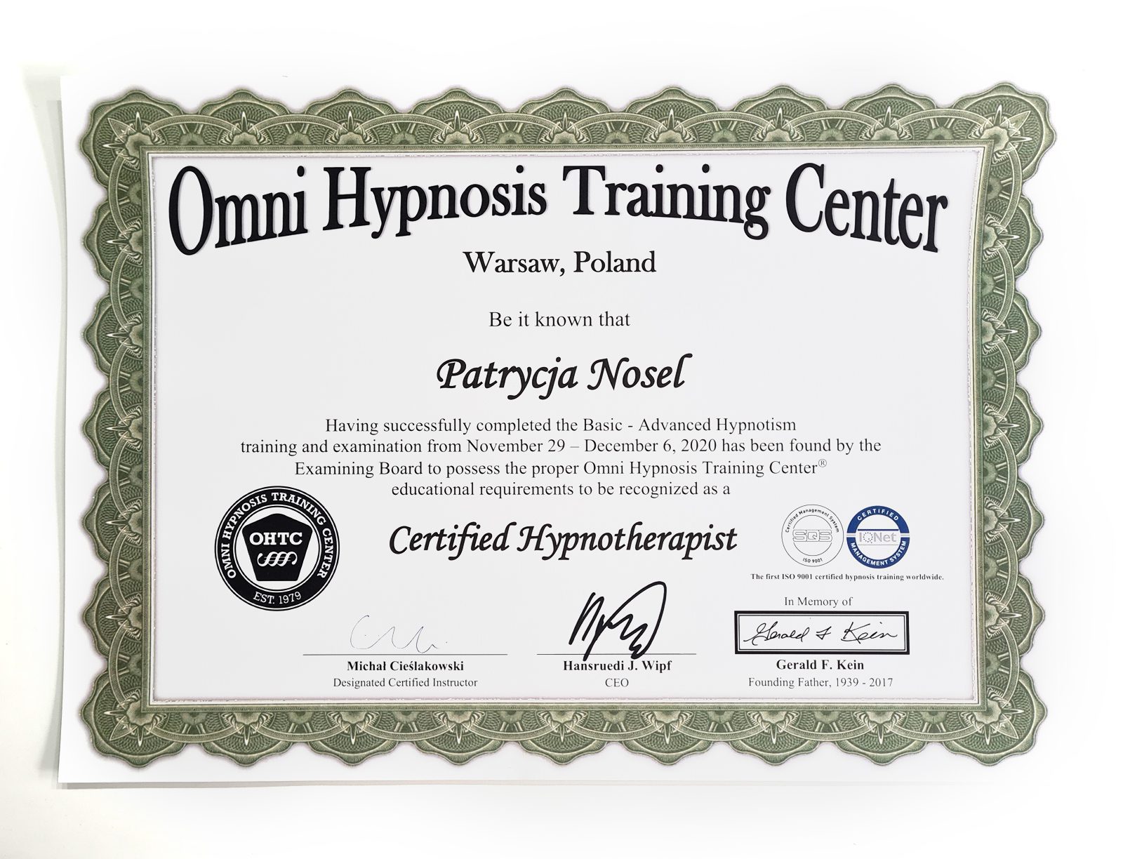 Nazywam się Patrycja Nosel i jestem dyplomowanym psychologiem, psychoterapeutą w trakcie procesu certyfikacji (nurt integracyjny; akredytacja PTP, PTP i PSPI) oraz certyfikowanym hipnoterapeutą (IBHEC, NGH, Omni Hypnosis Training Center). Od lat pomagam osobom cierpiącym z powodu problemów osobistych, relacyjnych, zaburzeń lękowych, depresyjnych, osobowości i innych trudności o podłożu emocjonalnym i behawioralnym. Prowadzę psychoterapię indywidualną osób dorosłych w nurcie integracyjnym, co oznacza, że w swojej pracy z klientem wykorzystuję różnorodne metody pomocy terapeutycznej, odpowiednie do rodzaju problemu oraz indywidualności każdej osoby, która do mnie przychodzi. Prowadzę hipnoterapię, która jest krótkoterminową formą pomocy terapeutycznej w przezwyciężaniu różnych problemów osobistych.