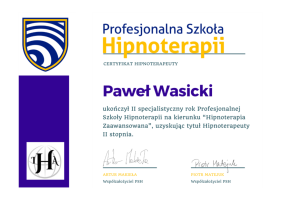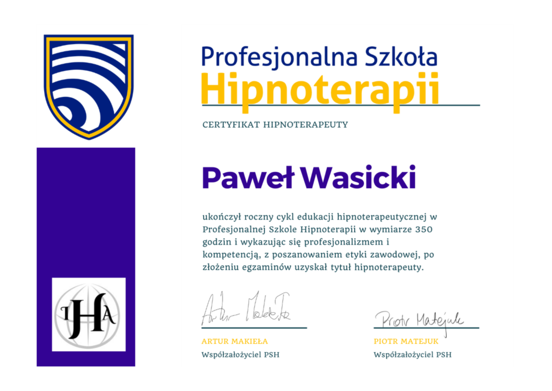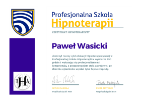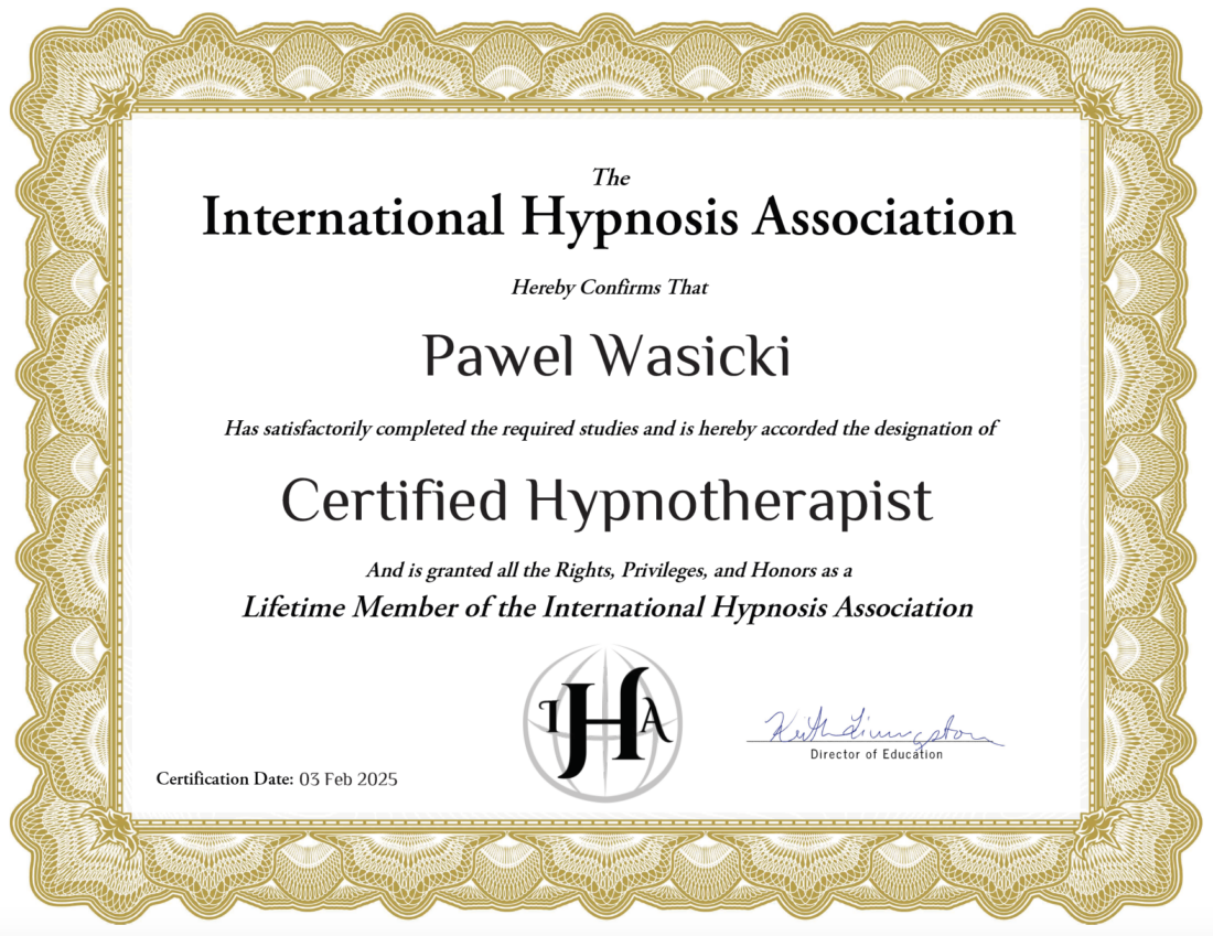 Przez dwa lata miałem zaszczyt kształcić się pod okiem dwóch cenionych mistrzów hipnoterapii w Polsce, Artura Makieły i Piotra Matejuka w Profesjonalnej Szkole Hipnoterapii. To właśnie tam zdobyłem wiedzę na temat różnorodnych technik hipnoterapeutycznych. Ukończyłem tę szkołę, zdając wymagający egzamin i zdobywając dyplom certyfikowanego terapeuty. To było jak magiczna podróż, gdzie moja pasja stała się moim zawodem.