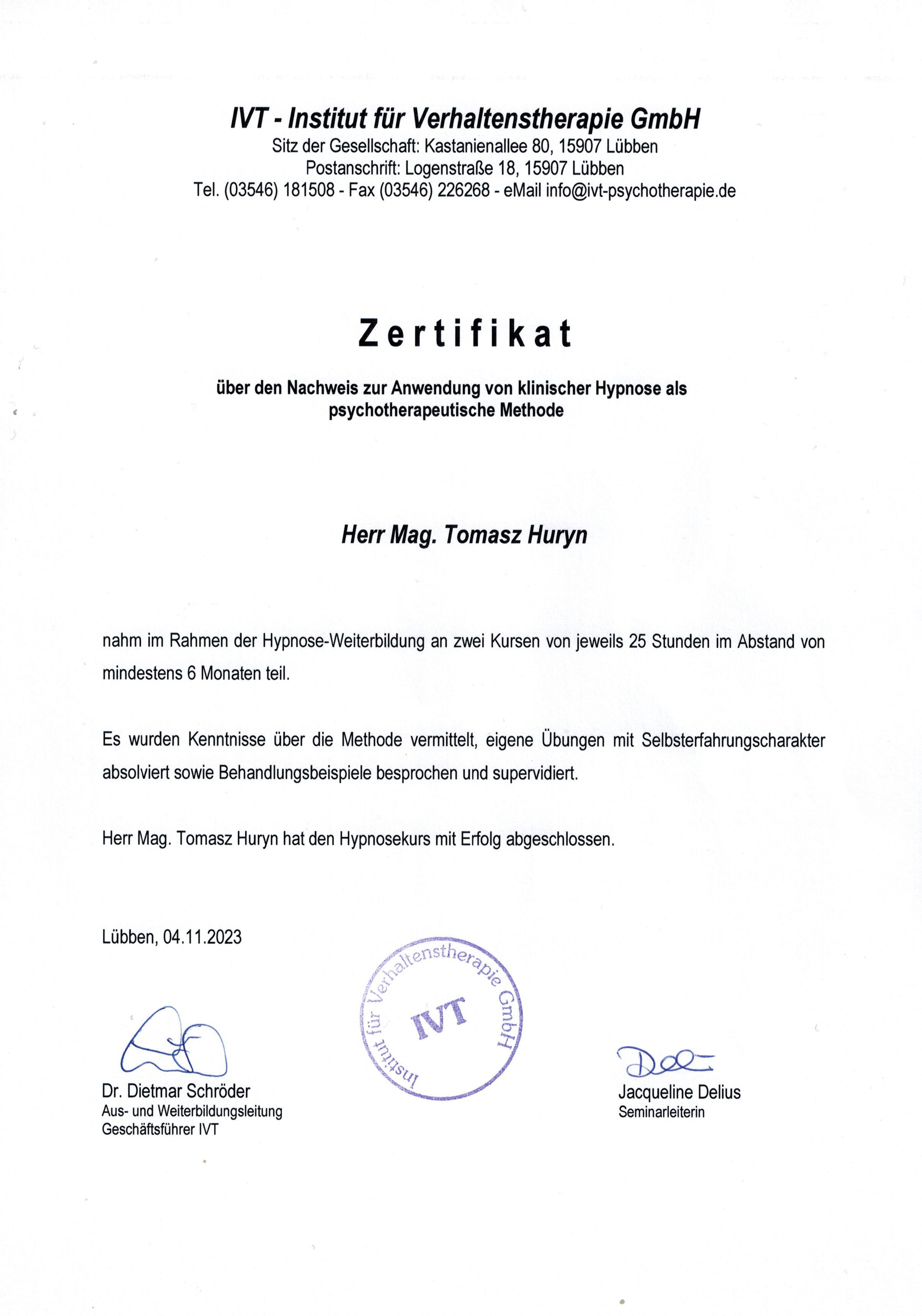 W trakcie szkolenia zdobyłem dodatkowe kwalifikacje do stosowania hipnozy klinicznej w ramach psychoterapii. Uważam hipnozę za bardzo efektywne narzędzie w pracy terapeutycznej.