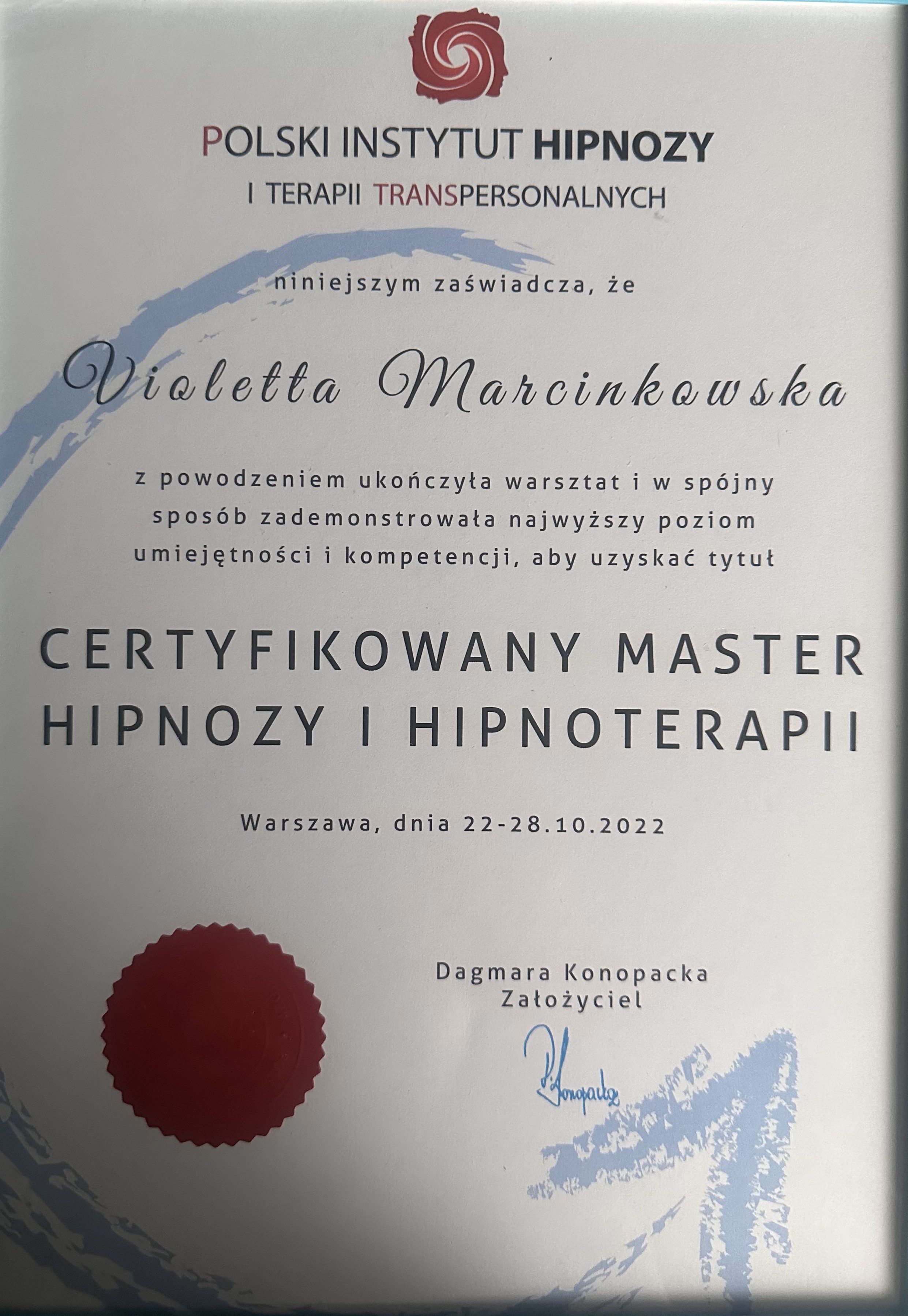 Jestem certyfikowanym Masterem Hipnozy i Hipnoterapii , Komunikacji z Duszą Polskiego Instytutu Hipnozy i Terapii Transpersonalnych, jestem Członkiem Polskiego Instytutu Hipnoterapii o numerze 22120.